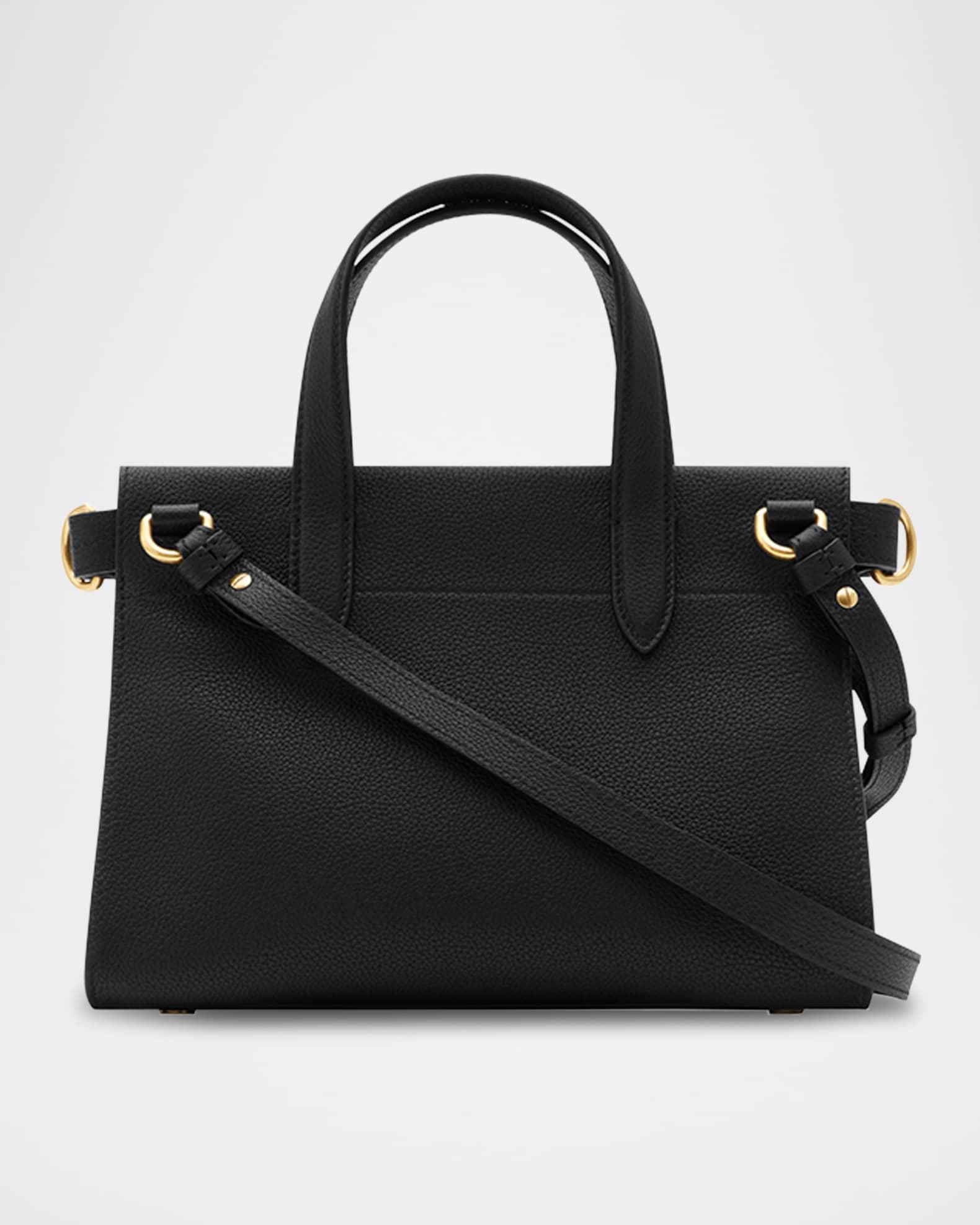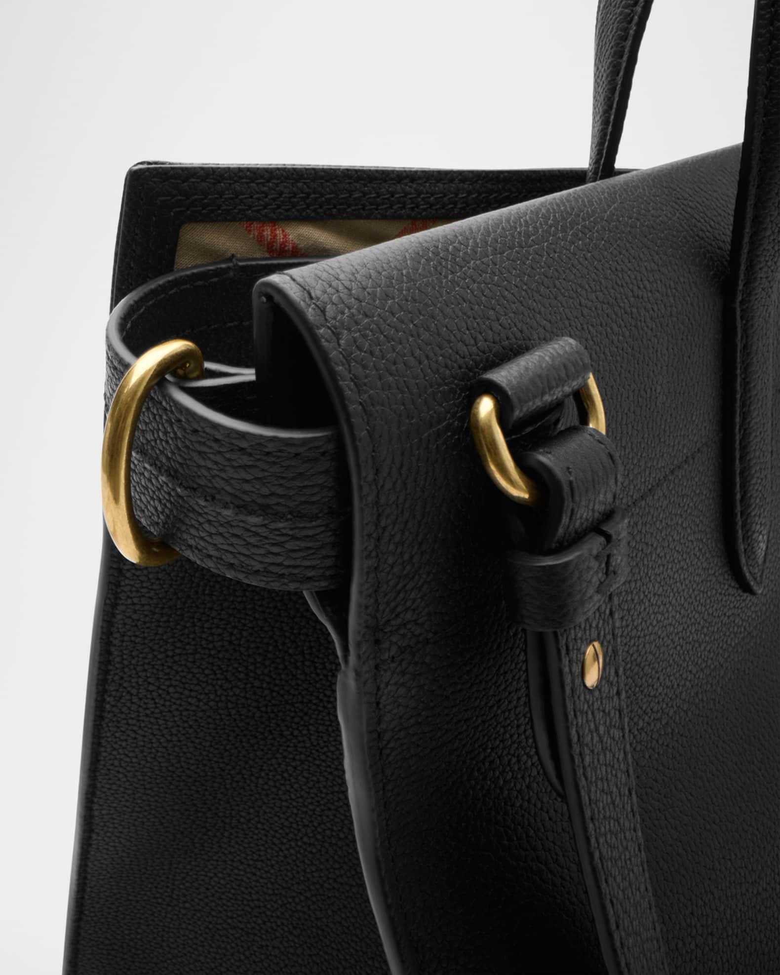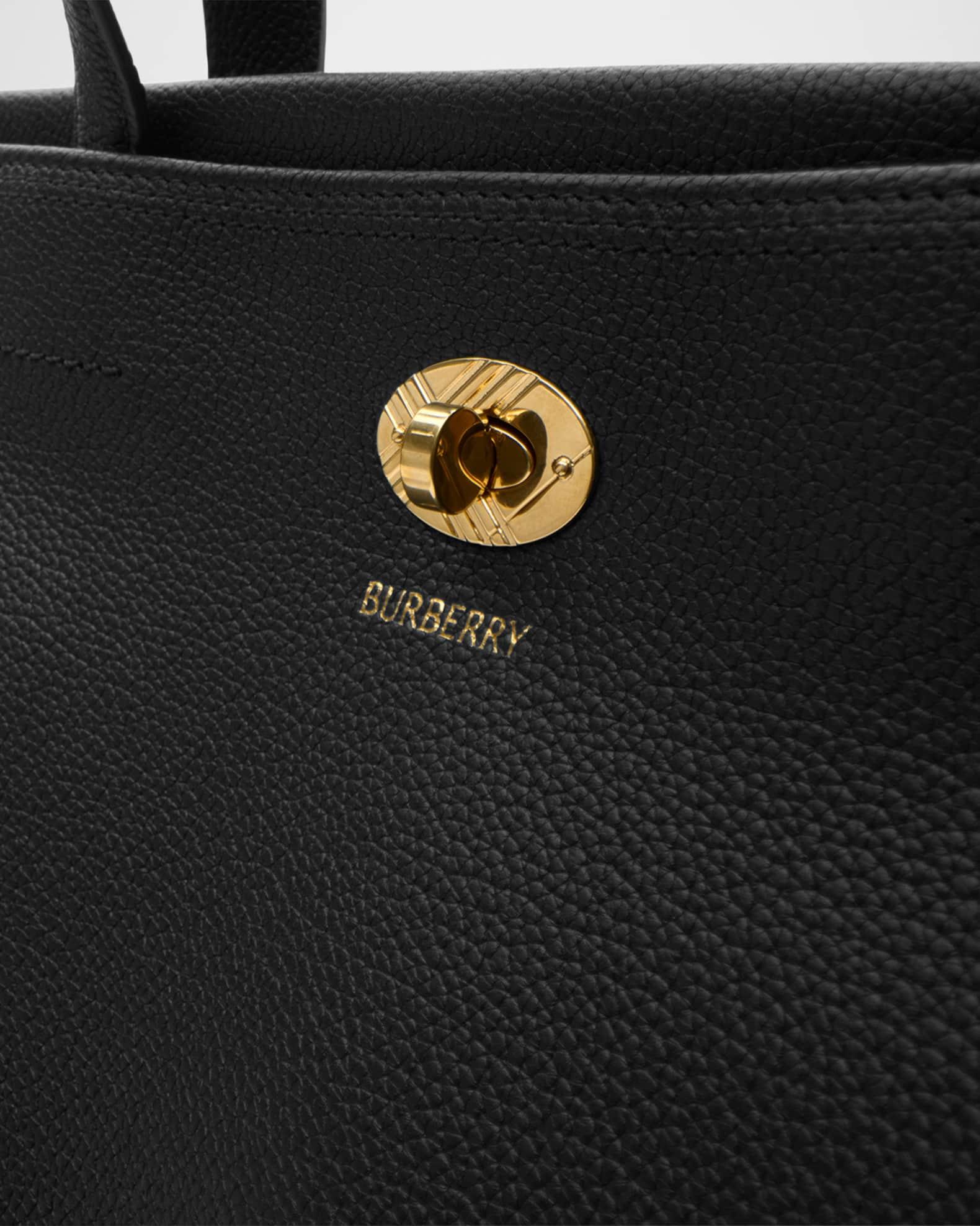 A timeless tote made in Italy from grainy calf leather, lined in a cotton blend woven with the Burberry check. The compact style is detailed with a check-engraved closure and D-ring hardware inspired by the belt from their iconic trench coats. Carry in hand or as a shoulder bag using the strap. Burberry "Cotswolds" tote bag in grainy calf leather Top handles Detachable, adjustable shoulder strap Can be worn as a top handle or shoulder bag Open top with twist-lock closure Side adjusters Interior, zip pocket Hand-painted edges Brushed metal hardware Embossed Burberry lettering at front Comes with a dust bag Lining: Check cotton Feet protect bottom of bag Approx. 7.7"H x 9.7"W x 5.1"D Made in Italy