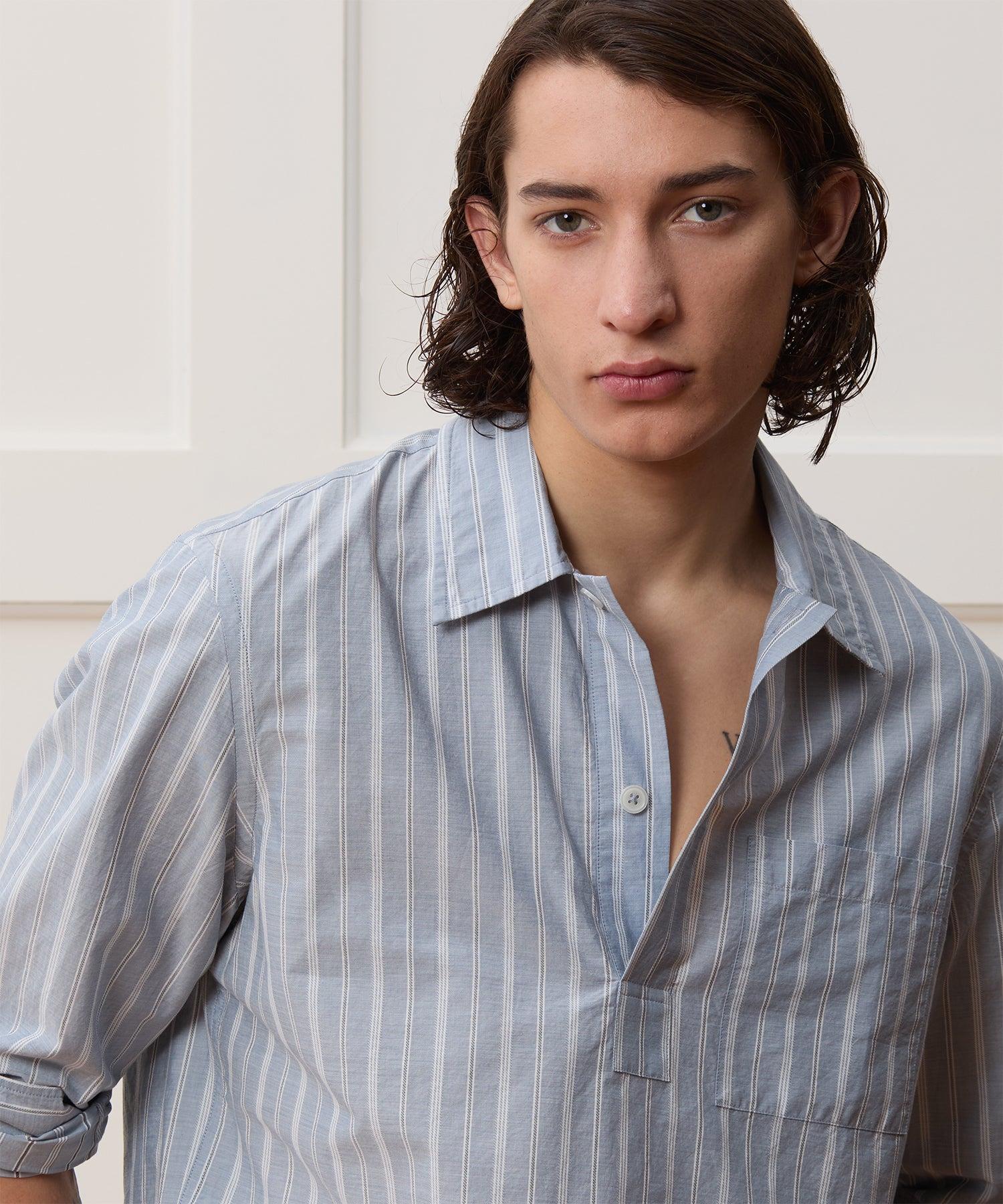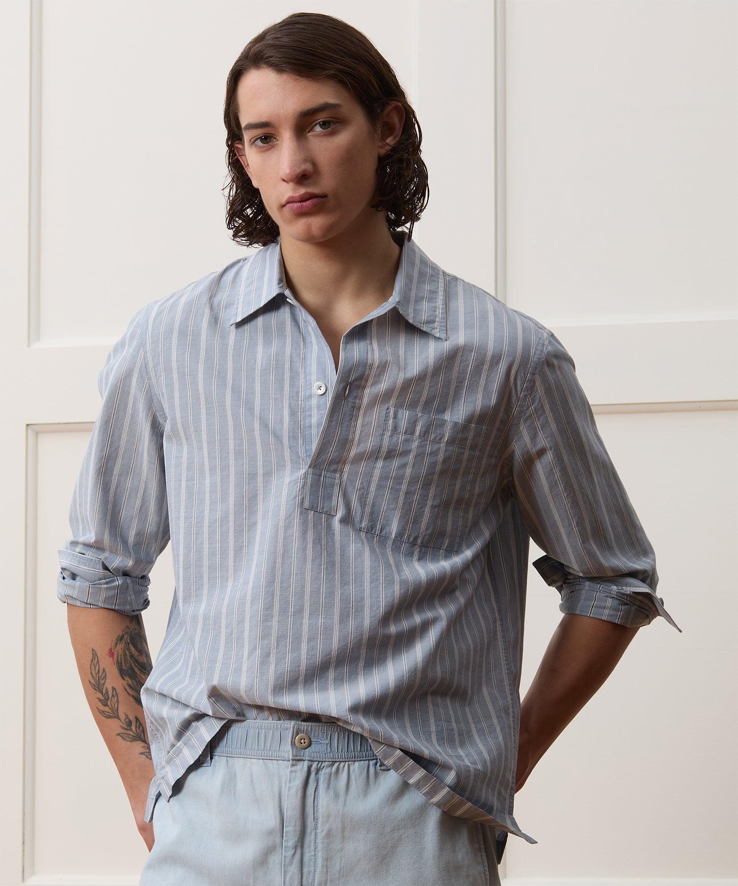 The perfect popover for warmer months. The lightweight cotton fabric, in a textured stripe, is made in Italy, and has a cool look and feel that suits the easy, relaxed fit. Clean details — a single chest pocket, two-button placket, and button cuffs — keep this laid-back shirt looking tailored. Throw it on with a pair of linen trousers and leather sandals for a cool look (in every sense of the word “cool”) that can take you from brunch to the beach. 100% Cotton Relaxed Fit Chest Pocket 2-Button Placket Button Cuffs Fabric From Italy Garment Made in MauritiusDelicate dry clean or machine wash cold, low. Non-chlorine bleach only. Tumble dry. Medium iron. Style SH26610142