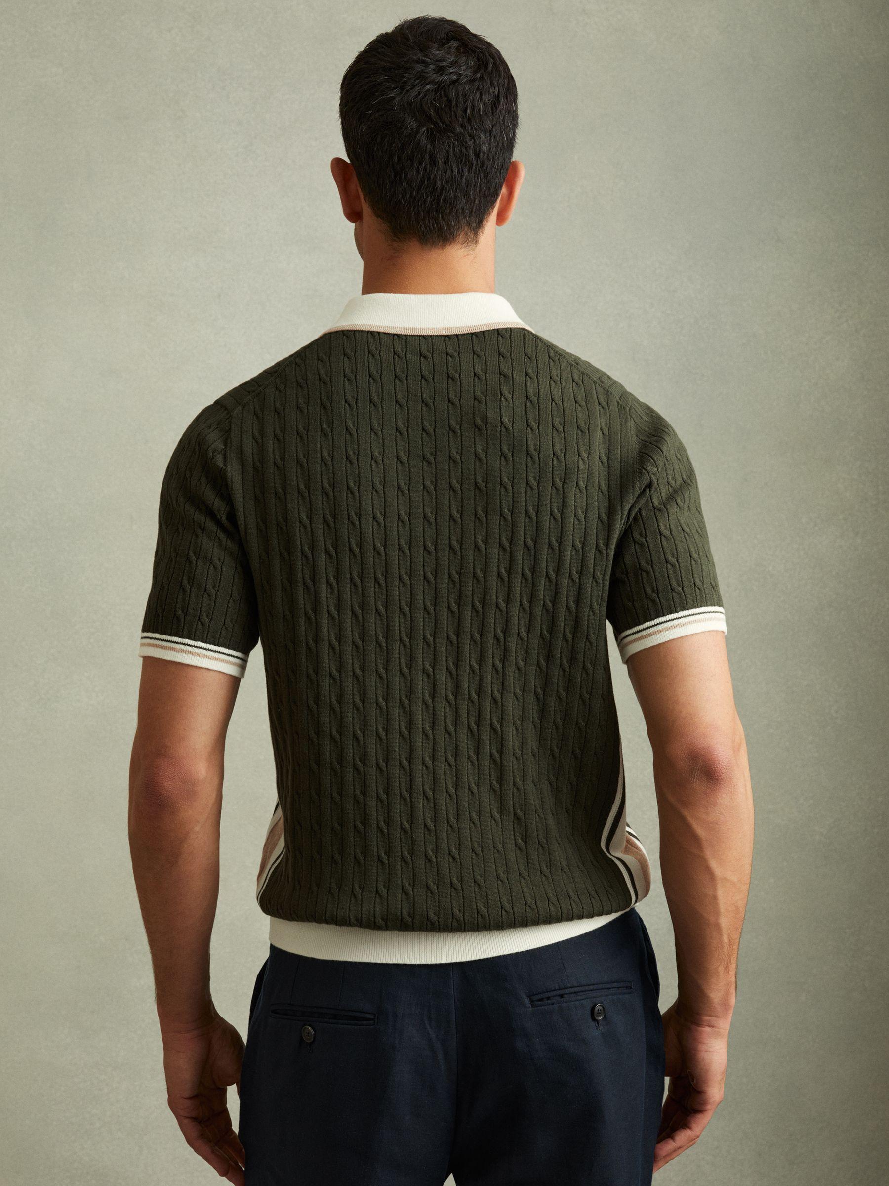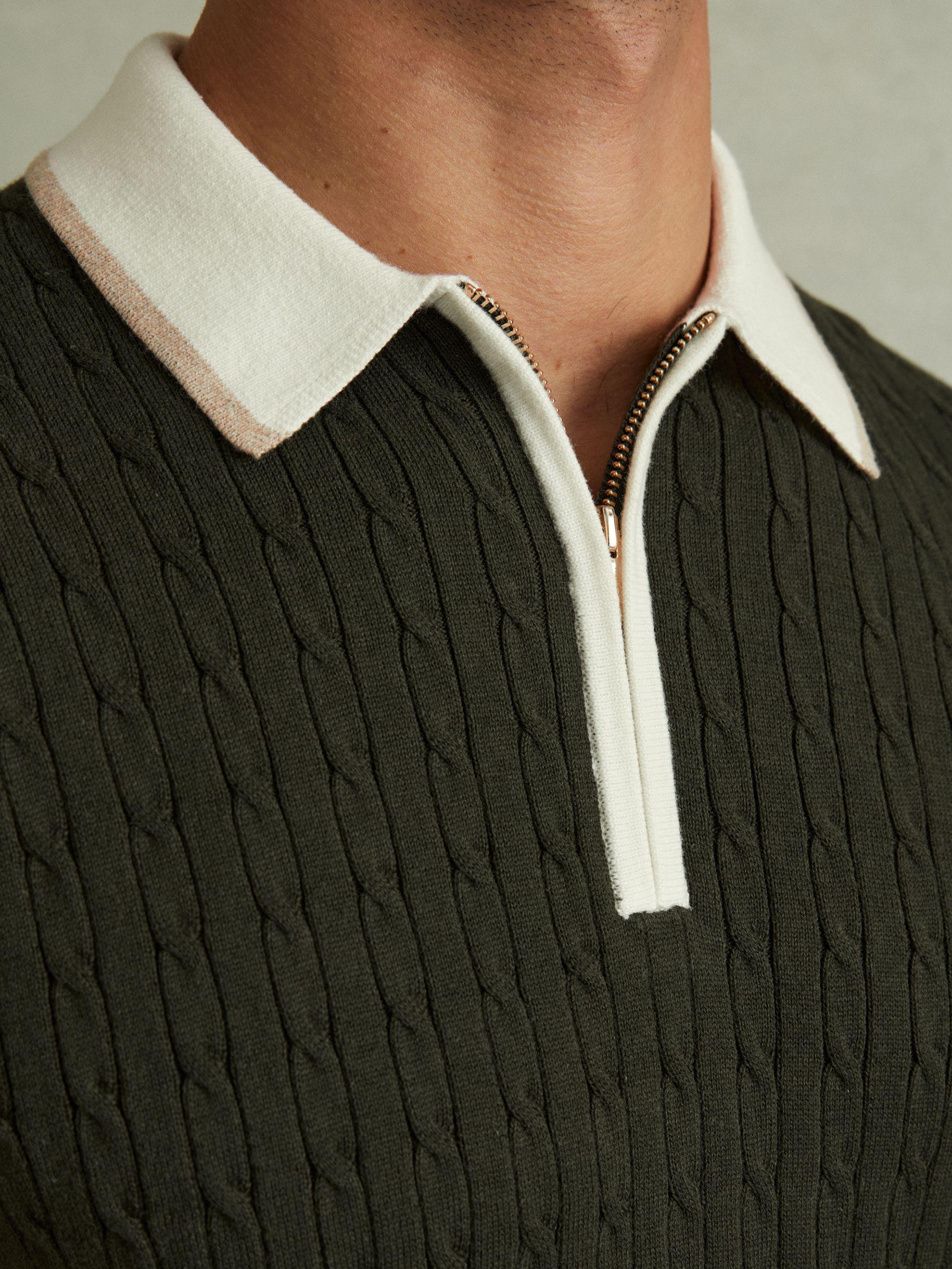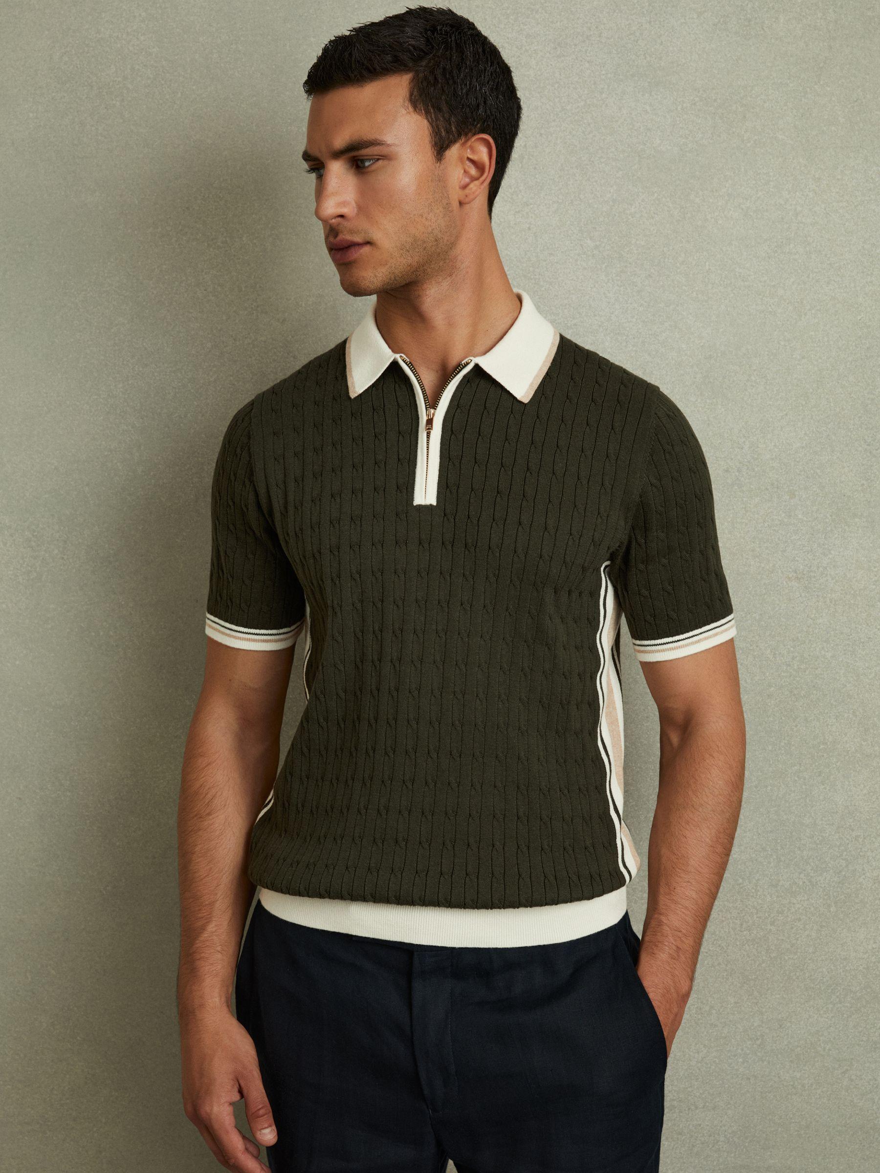 The khaki green/off-white/camel Pulse polo shirt is spun from a soft cotton blend into a cable-knit arrangement. It s complete with a contrasting half-zip polo neckline and trim detailing. Cotton blend. Cable knit construction. Contrast half-zip polo neckline. Contrasting trim detailing. The model is wearing a size M. Measurements of model: 6ft 2'' / 188cm.