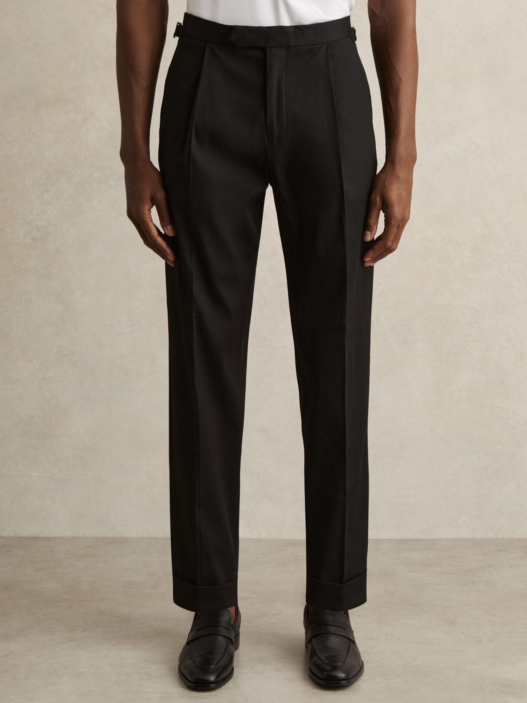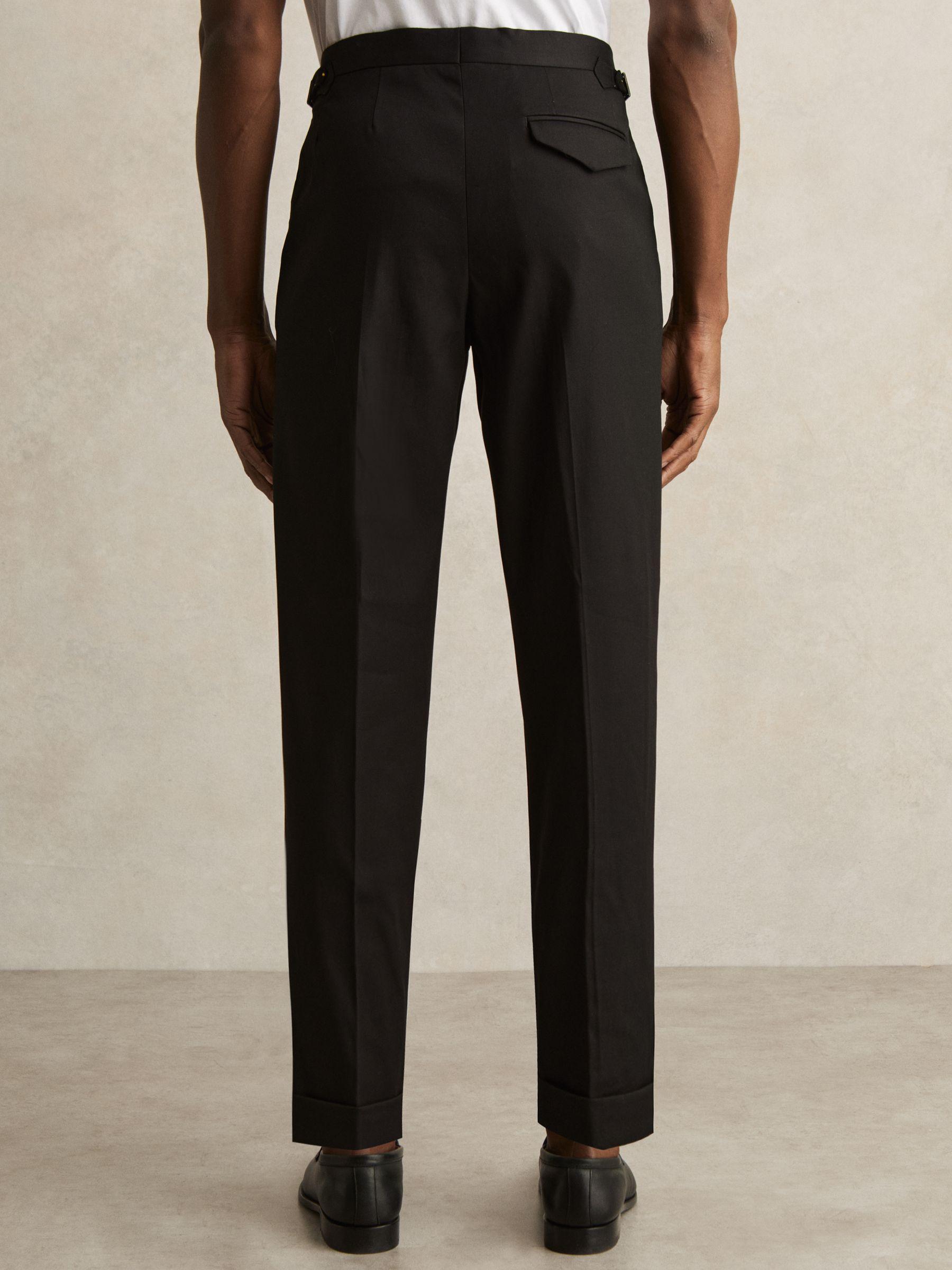 Crafted from a premium cotton blend, the Cantwell trousers deliver a sharp, tapered fit with a refined silhouette. Front pleats enhance the shape, while side adjusters allow for a personalised fit. Turn-up cuffs add a polished finishing touch. Cotton blend. Tapered fit. Side adjusters. Turn-up cuffs. Hook-and-bar with zip. The model is wearing a size 32. Measurements of model: Height 6ft 2.5 / 189cm.
