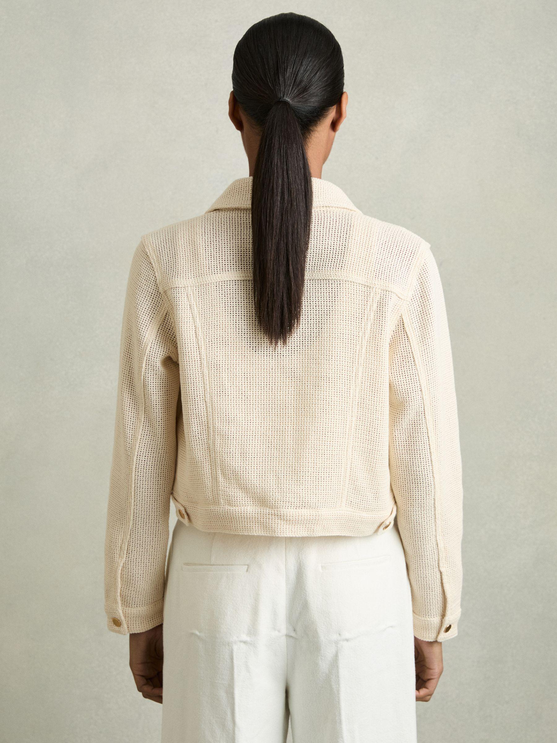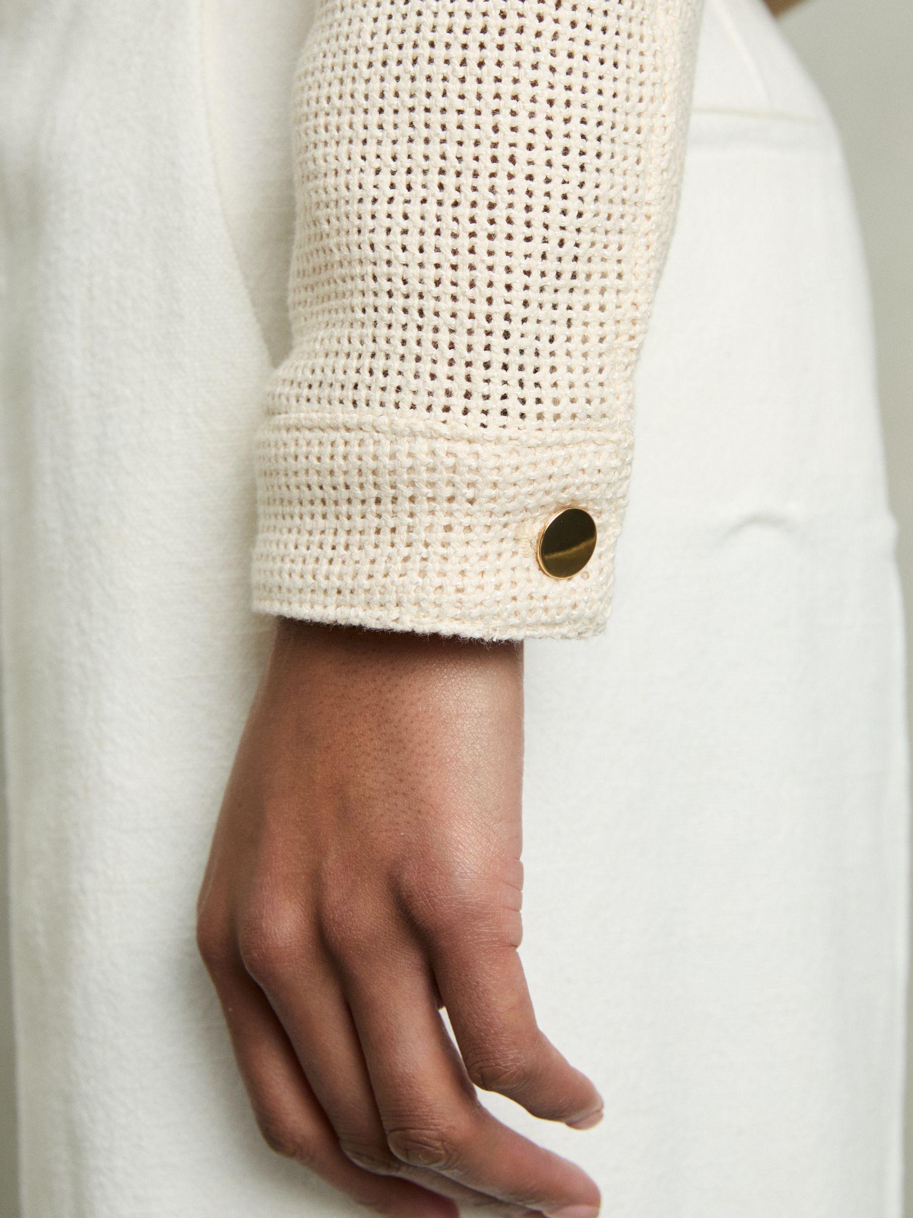 The textured open weave of the Renzo jacket provides a modern twist on the classic trucker silhouette. Gold-tone buttons secure the cuffs, flap pockets and front placket, accenting with a polished touch. Cotton blend. Textured open weave. Button flap pockets. Cropped. Front buttons.