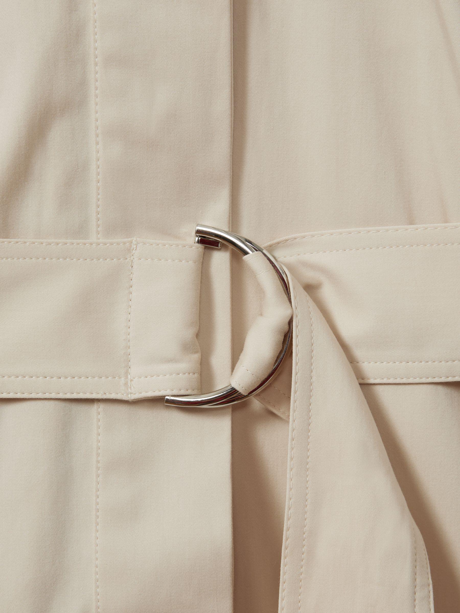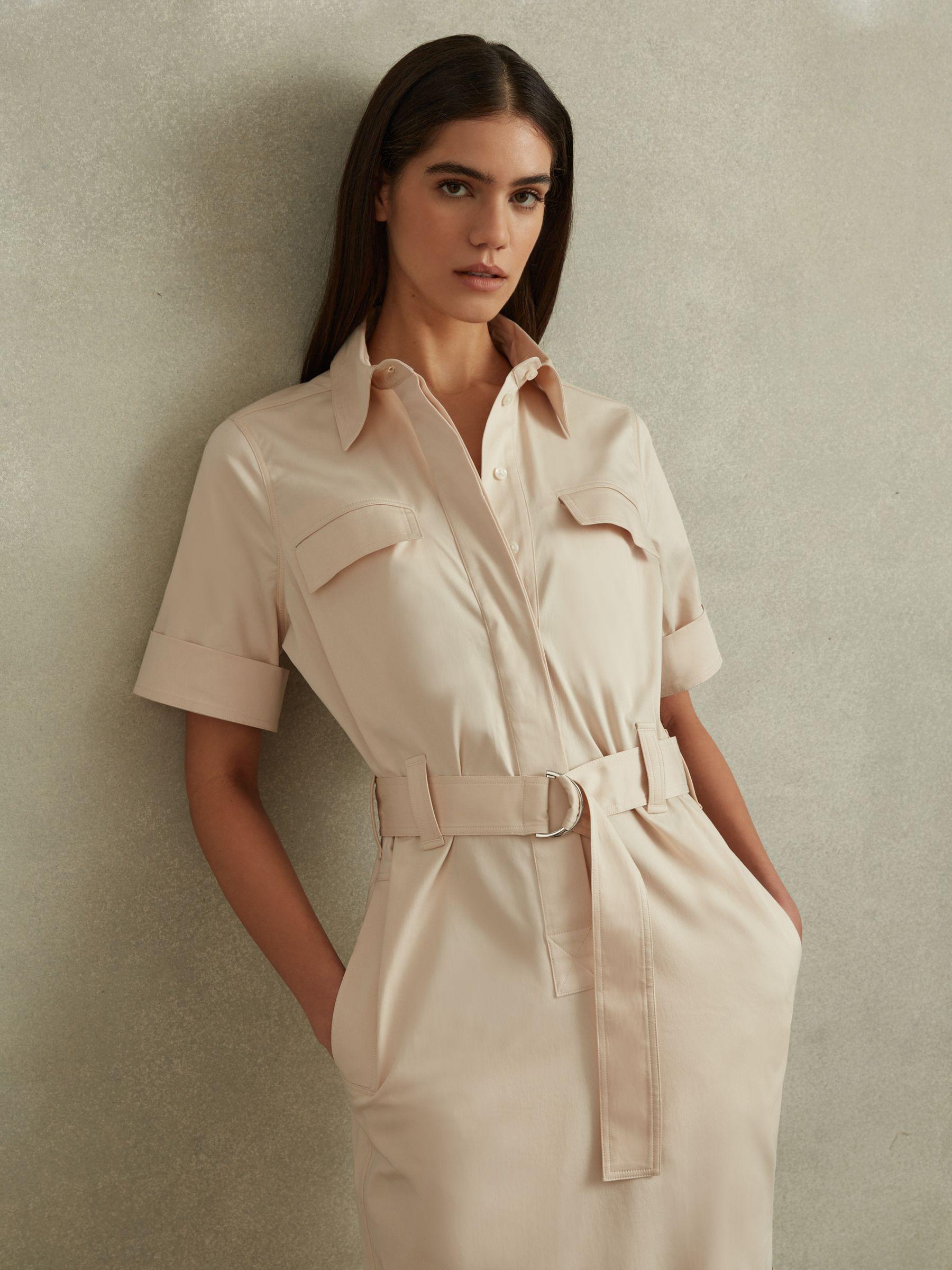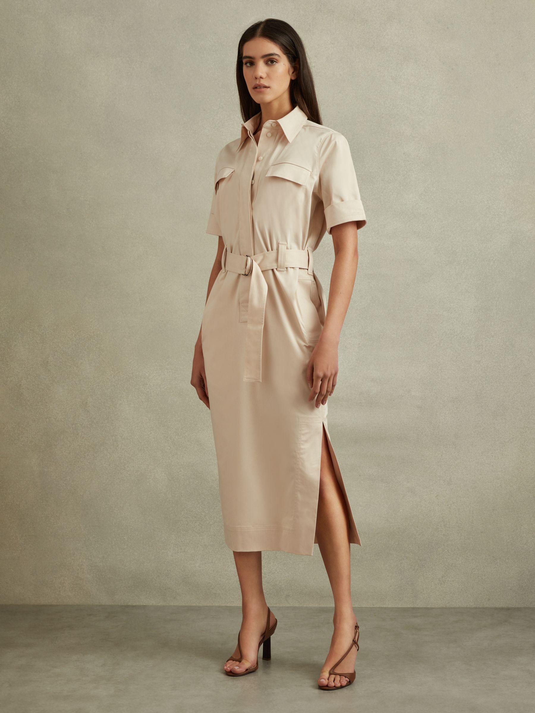 The Aimie midi dress is a utility-inspired style, made from cotton blended with lyocell and premium stretch. Extra volume is added through the hips and an adjustable belt cinches the shirt-style top. Cotton blend with lyocell Shirt-style top Button-front closure Belted waist Side pockets Side splits Midi length