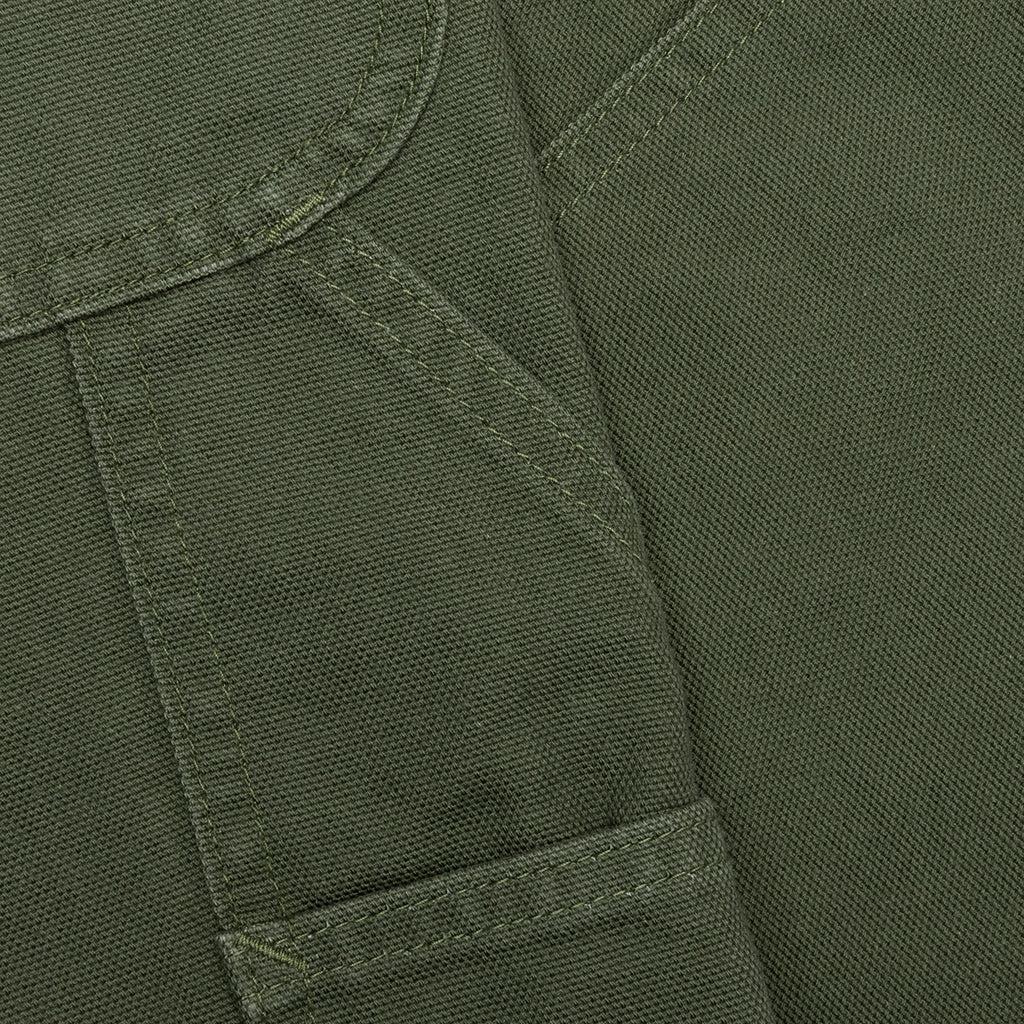 The Cotton Canvas Painter Pant in Moss Green combines durability with practical design. Crafted from 11.5oz cotton canvas fabric, these high-rise pants feature a straight-leg fit for timeless appeal. A 5-pocket design is complemented by three drop-in tool pockets and a tool loop on the thighs, offering ample utility. Double-knee reinforcement ensures lasting wear, while a custom metal top button and YKK zipper fly complete the functional construction. 100% Cotton High rise straight leg fit 11.5oz cotton canvas fabric 5-Pocket design Three drop-in tool pockets on thighs Tool loop at thigh Custom metal top button YKK zipper fly Double-knee reinforcement Style No: PU472-B-MOGRN