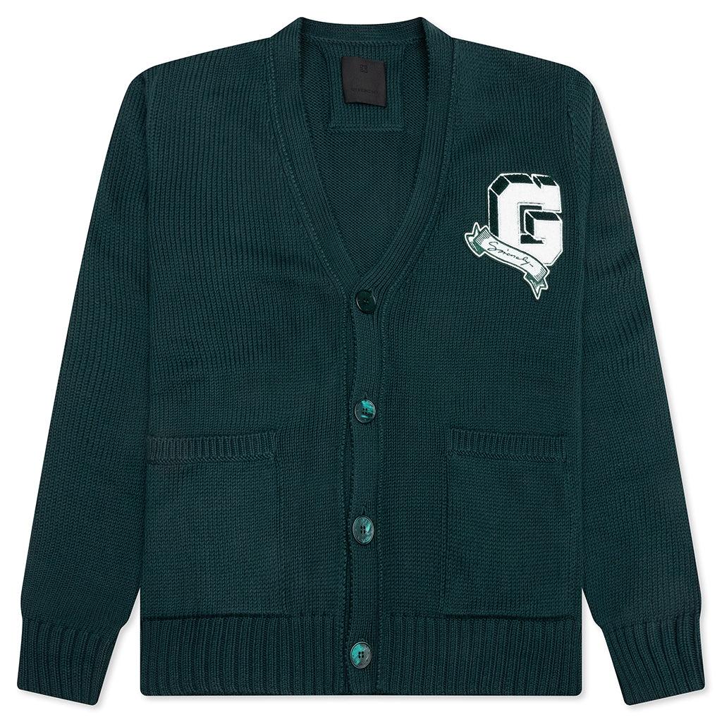 The Givenchy V-neck Cardigan elevates classic knitwear with subtle yet sophisticated details. Crafted from 100% cotton, this long-sleeved cardigan offers a soft, breathable feel for all-day comfort. Designed with a deep V-neckline, the piece is finished with a G patch on the chest, featuring felted borders for a textured contrast. A button closure and two front pockets add to its effortless versatility, while the classic fit ensures a refined silhouette. 100% Cotton Knit construction V-neckline Button closure Patch on chest Ribbed trims Style No: BM90TY4YLF-302