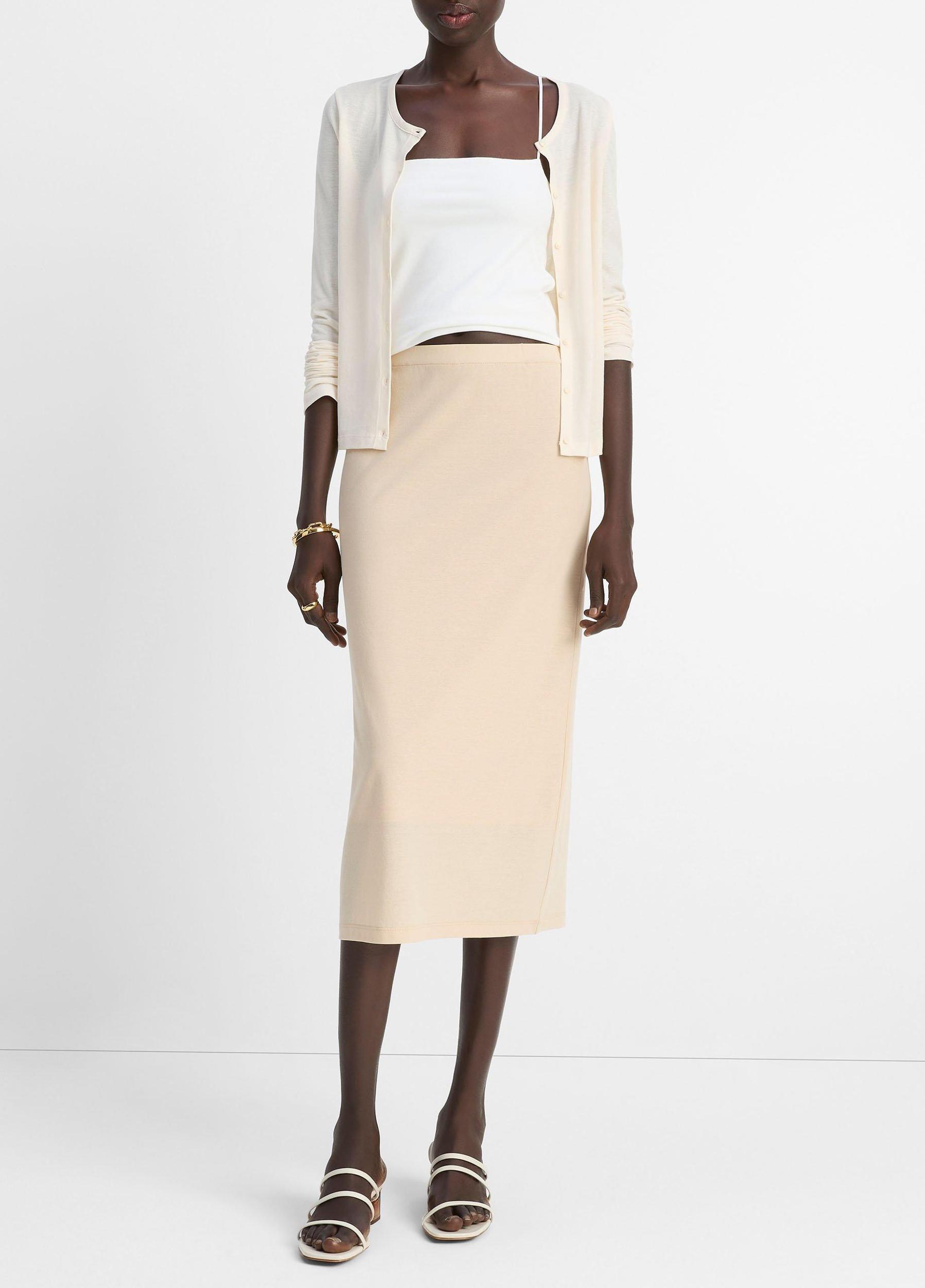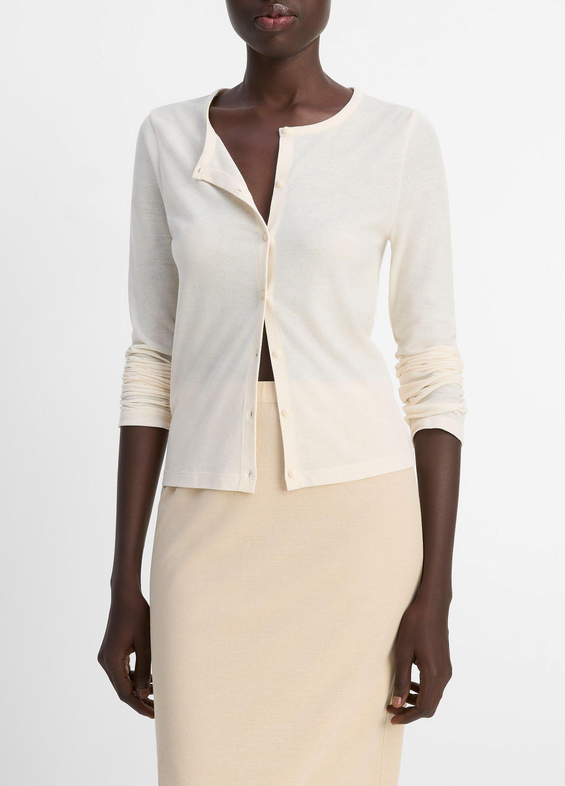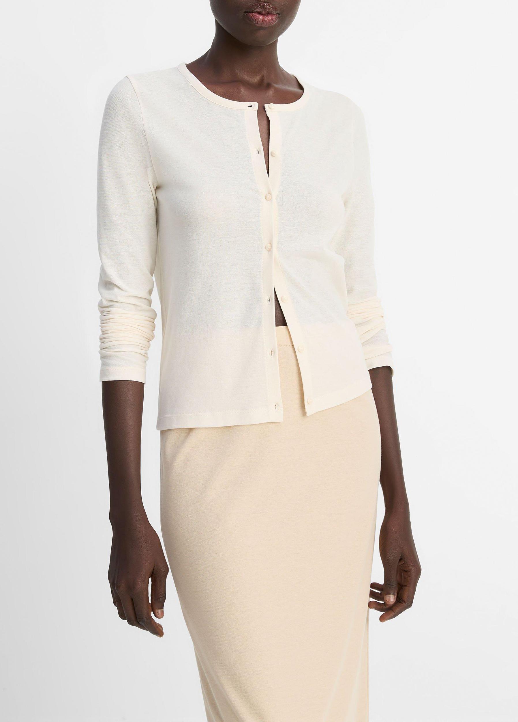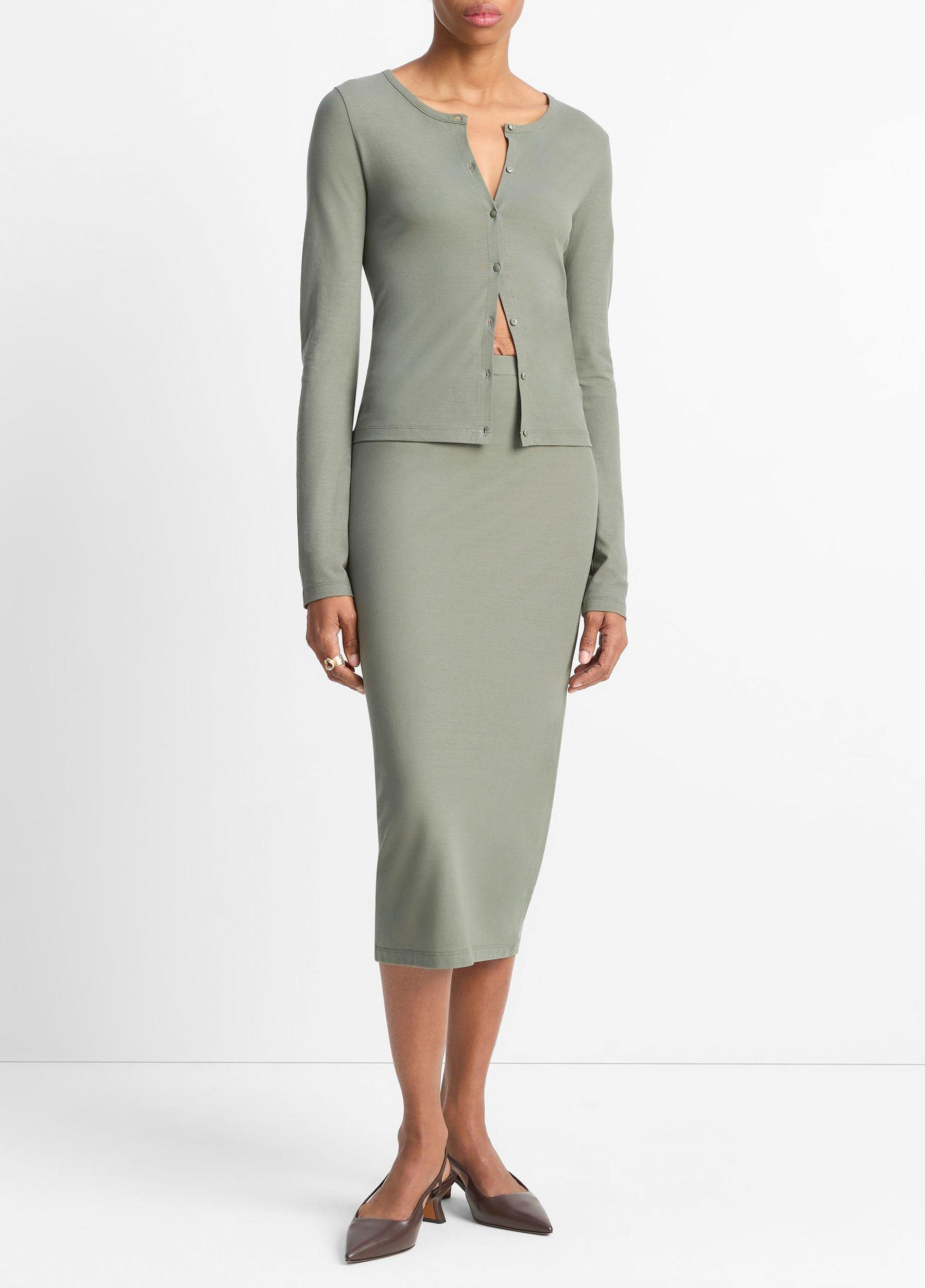 This slim cardigan is crafted from a special Japanese cotton crepe jersey. It's soft and stretchy like a tee but with a hint of refined texture, which gives it a fluid drape and light weight ideal for warmer weather. Match it back to our midi skirt for an effortlessly pulled-together pairing to have on hand.