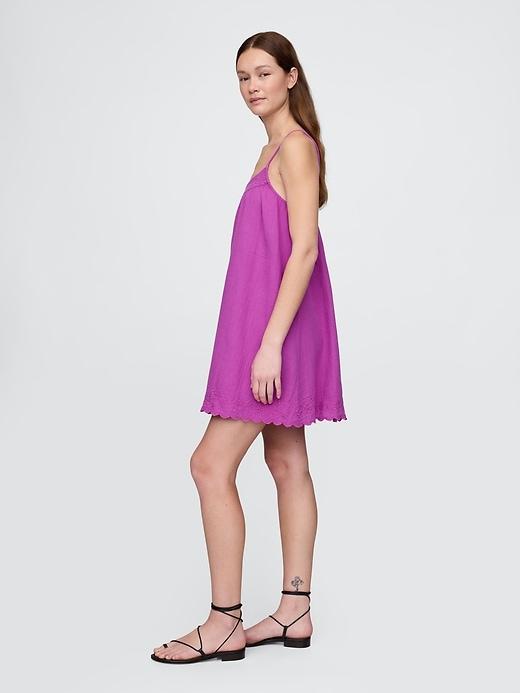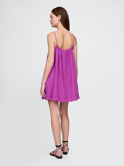 Soft cotton gauze swing dress. Scoop neck with embroidered trim. Spaghetti straps with tie details at back. Back button placket. Scalloped hem with embroidered detail. This product was made in a factory that invests in gender equality and women’s empowerment. Through RISE (Reimagining Industry to Support Equality) and Gap Inc.’s program P.A.C.E. (Personal Advancement & Career Enhancement), we support people who make our clothes to build the skills, knowledge, confidence, and resilience needed to advance in work and life. Learn more here. #777441