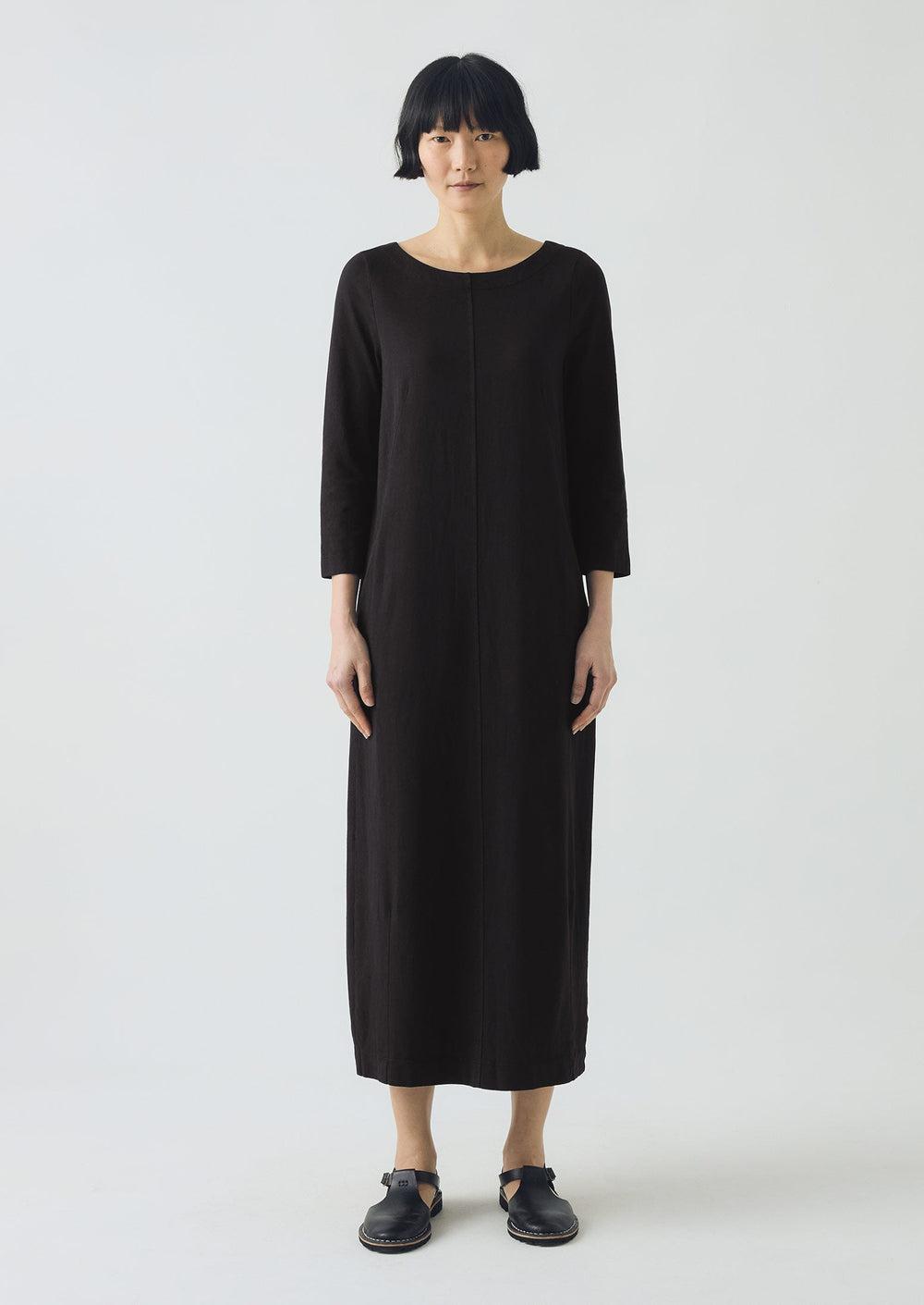 Our dress is made from organic cotton jersey and garment-dyed, a process that gives each piece a natural colour variation. With a rounded shape and subtly tapered hemline at the lower calf. It has a high, round neckline and elbow-length sleeves, a central lapped seam and topstitched edge.