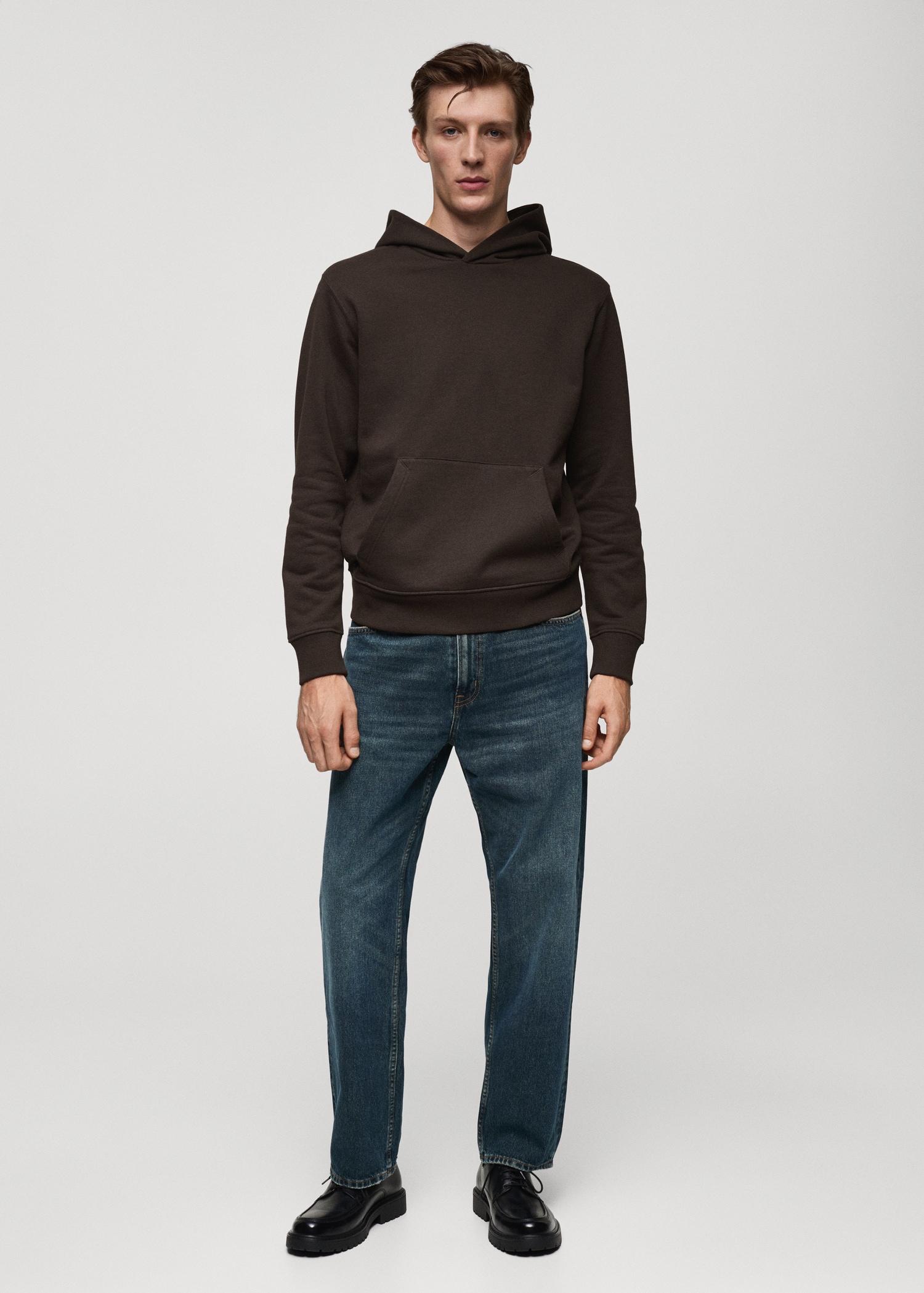 The black color is an online exclusive. Warm-effect brushed cotton interior. Cotton-blend fabric. Regular fit. With hood. Pouch pocket. Long sleeve with elastic cuffs. Straight hem. Ribbed finishes on sleeve and hem. The model is 6'3" and is wearing a size M. Side length 17.4 in. Back length 29.13 in
