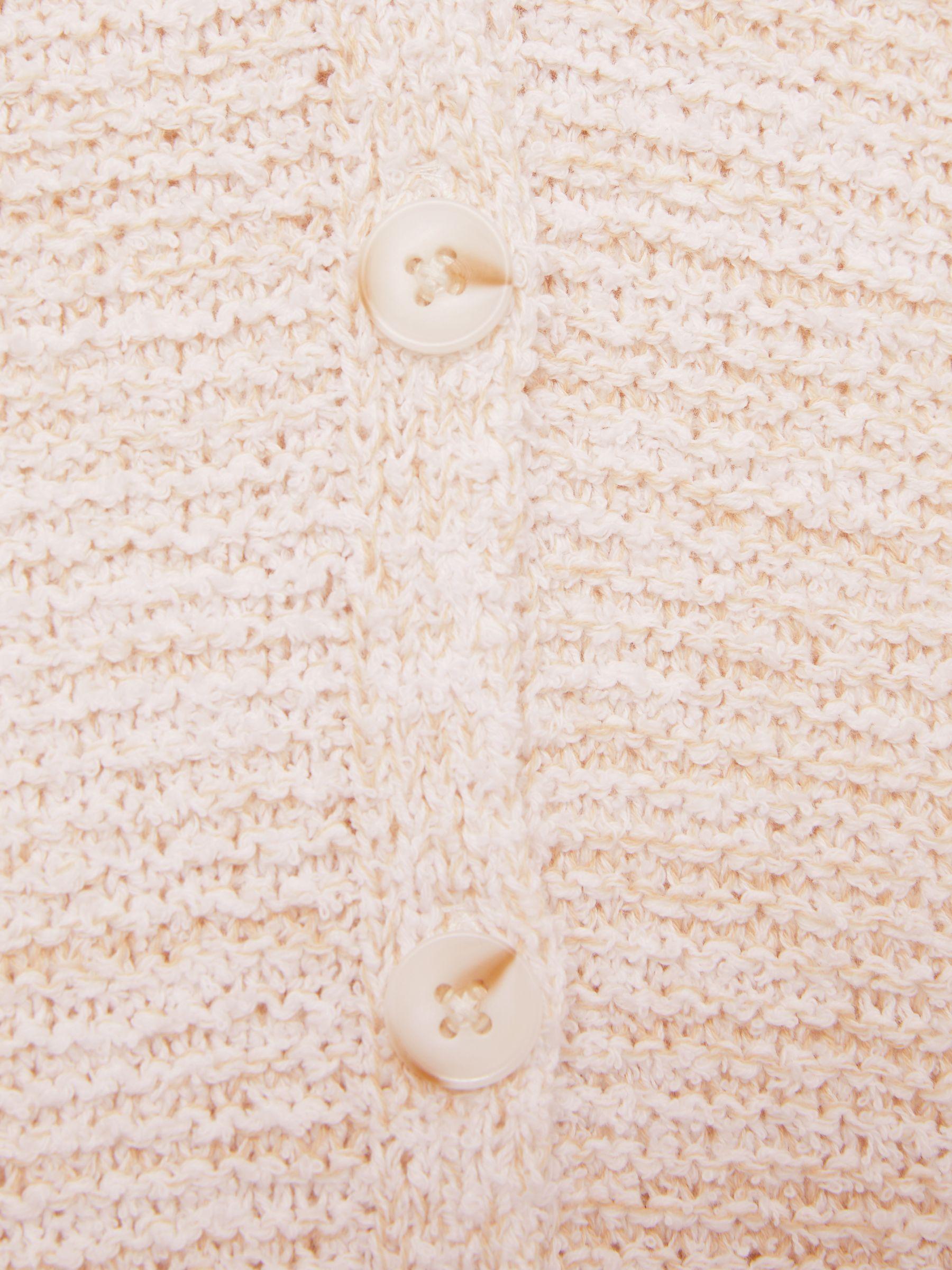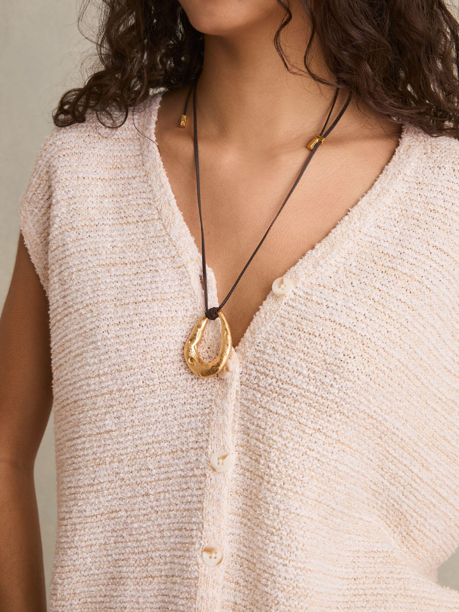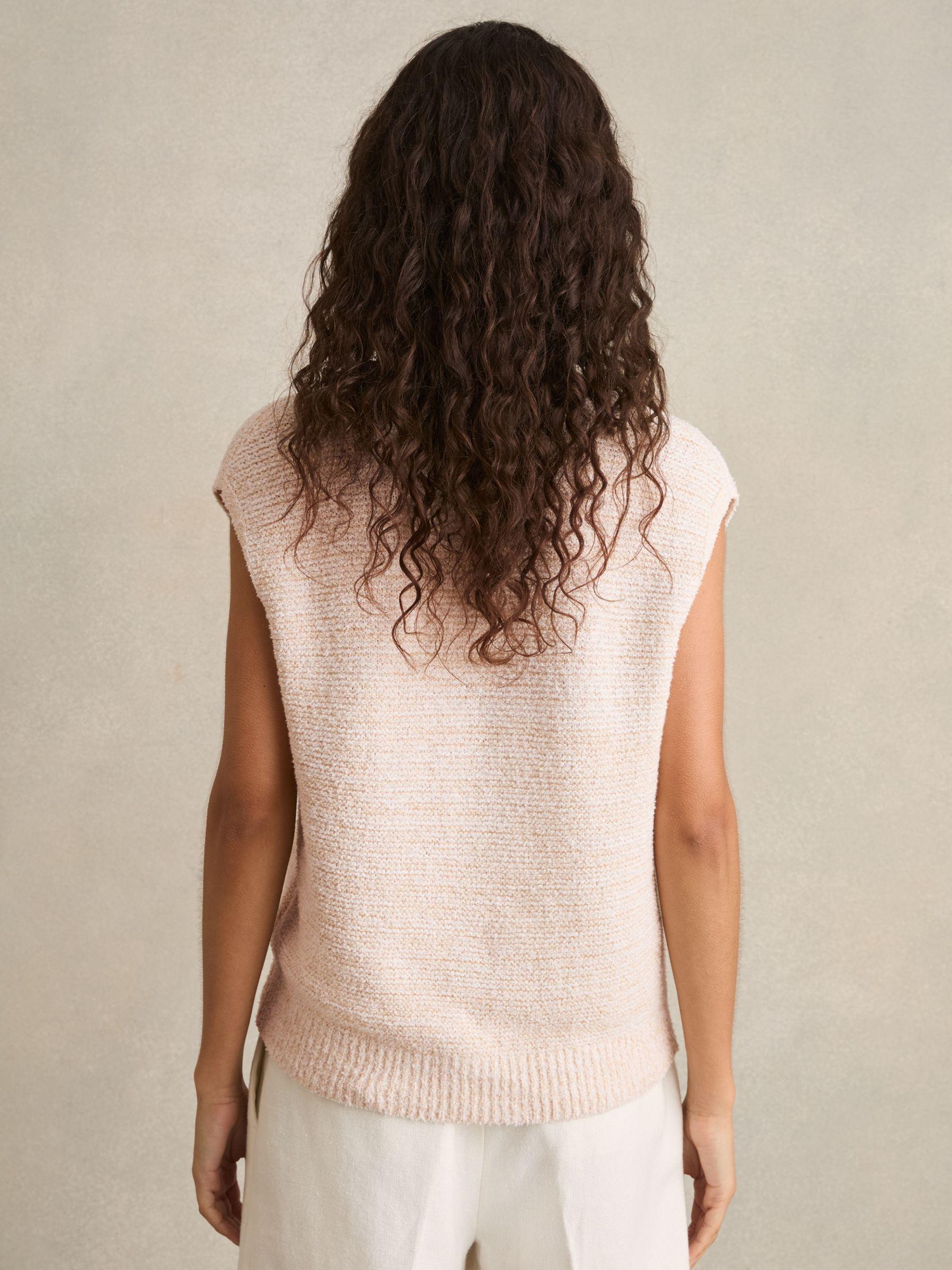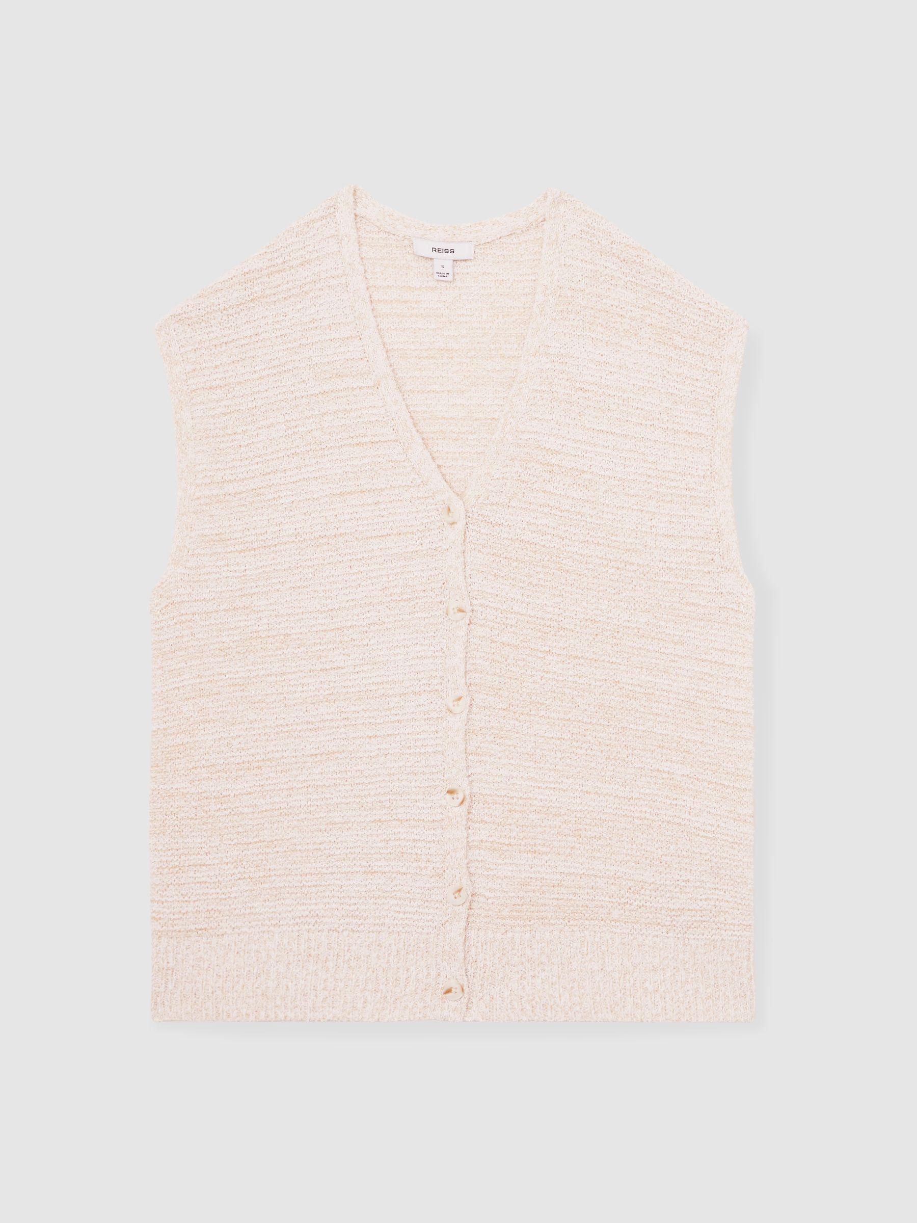 Cut in the style of a waistcoat, the Lily top is the perfect piece for transitional layering. It’s crafted from a soft textured knit in a cotton-linen blend, and is finished with tortoiseshell-effect buttons for a refined touch. Cotton and linen blend. Textured knit. V-neckline. Sleeveless. Front buttons.