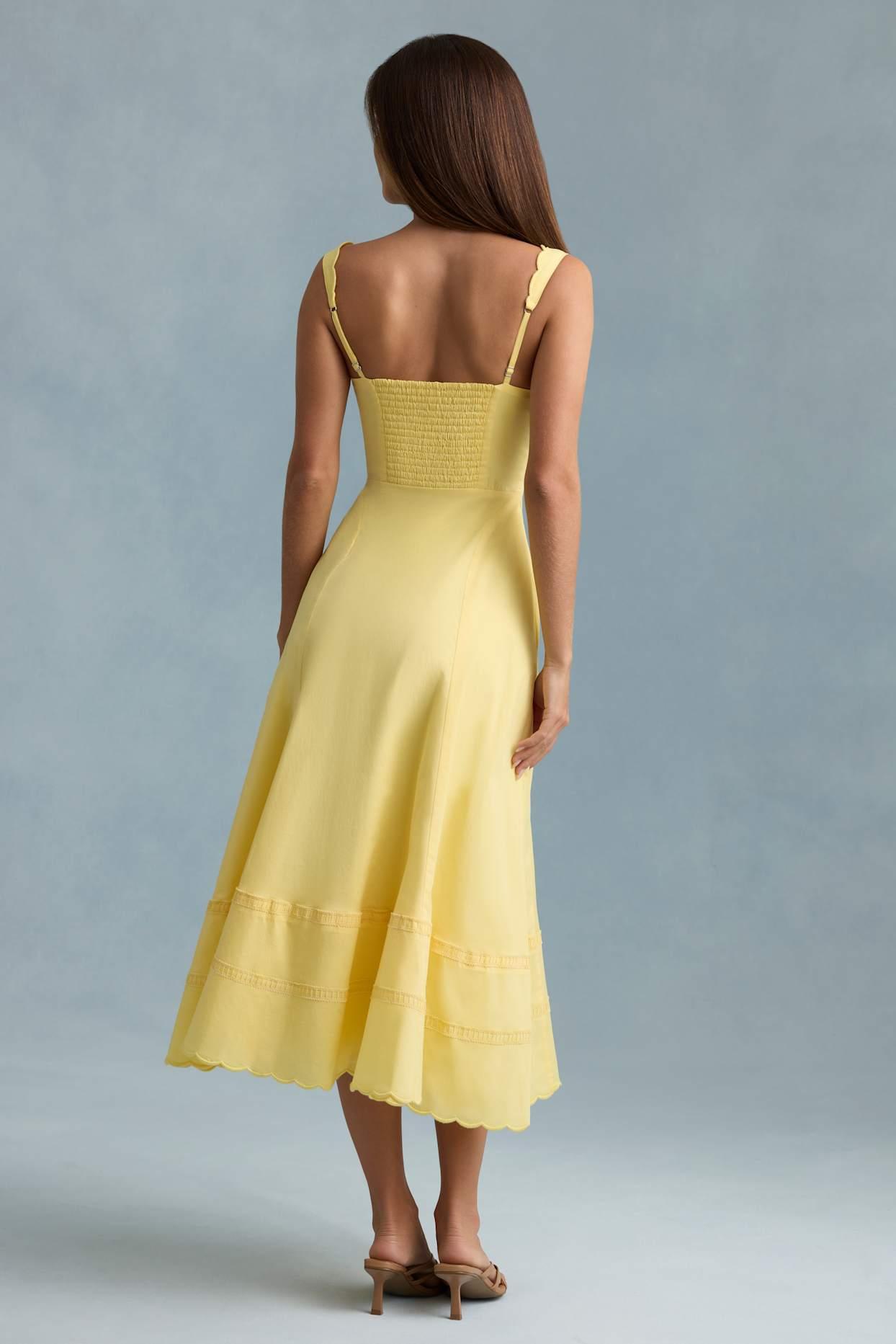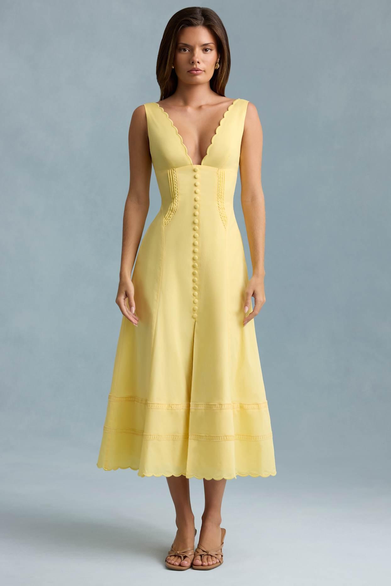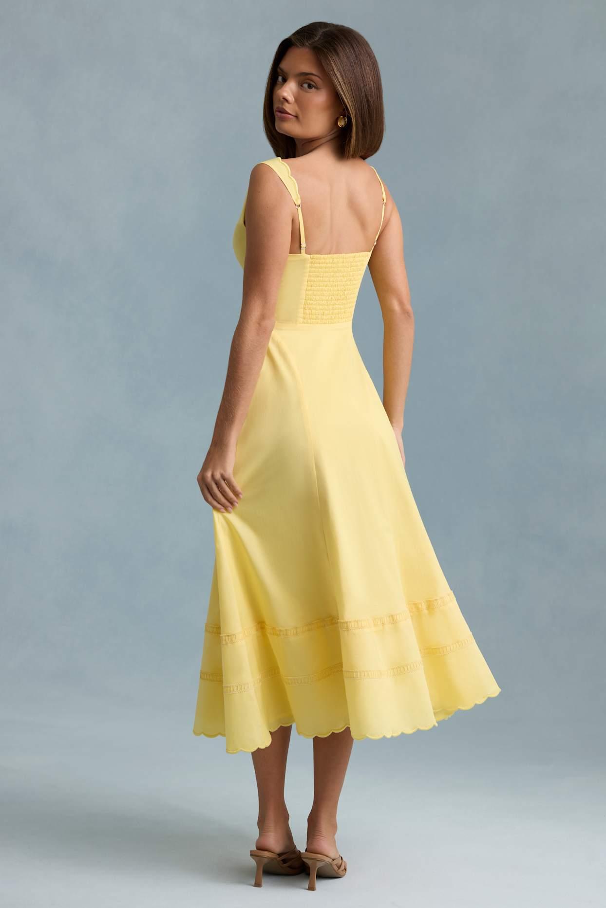 Ready for summer stories, the Aralisse midaxi dress is crafted from premium cotton poplin with a lightweight feel and a touch of stretch. Cut to a universally flattering A-line silhouette with a fitted, pintucked bodice and full skirt, it’s framed with a scalloped V-neckline and adjustable rouleau straps. The fabric-covered buttons nod to classic styles. Plunge V-neckAdjustable rouleau tie shoulder strapsScalloped trimPintucked and ladder-trim detailingDecorative fabric-covered buttonsElasticated shirred back panelCentre-front split Concealed side zip fasteningA-line silhouetteMidaxi length, SNP to hem approx. 126cm based on a UK size 8Product code: 12922