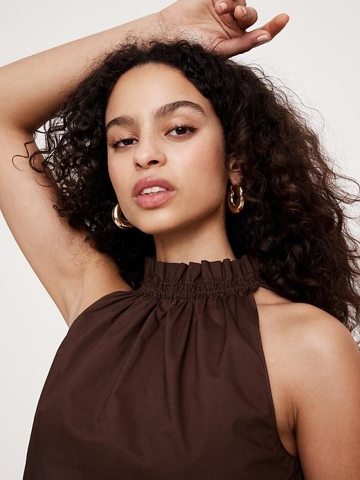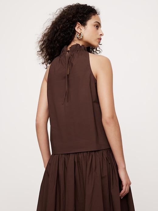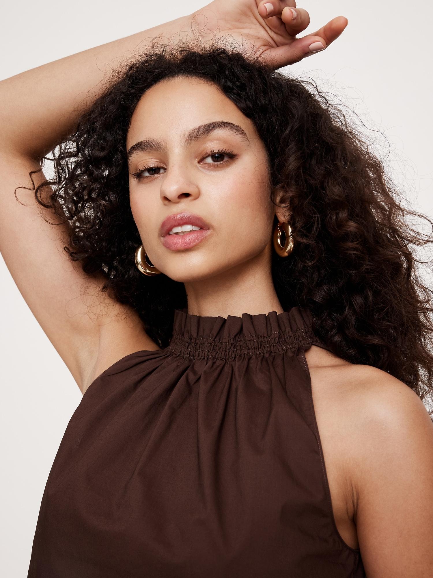 We love poplin because it transcends trends. Here, proof that an of-the-moment ruffle-neck top can still feel timeless thanks to its premium 100% poplin fabric. Pair with the matching smocked maxi skirt for a full set or style with shorts and sandals. Relaxed fit: Relaxed fit through shoulders, chest and waist. High neck with ruche detail. Keyhole with tie closure at back neck. Straight hem. Unlined. #742617