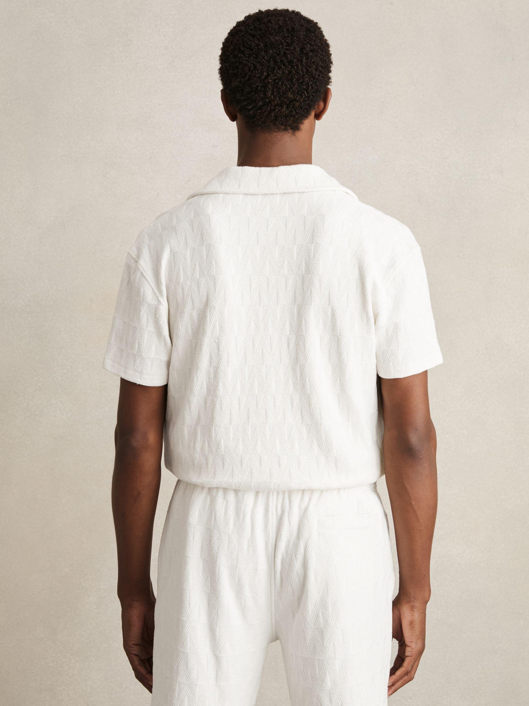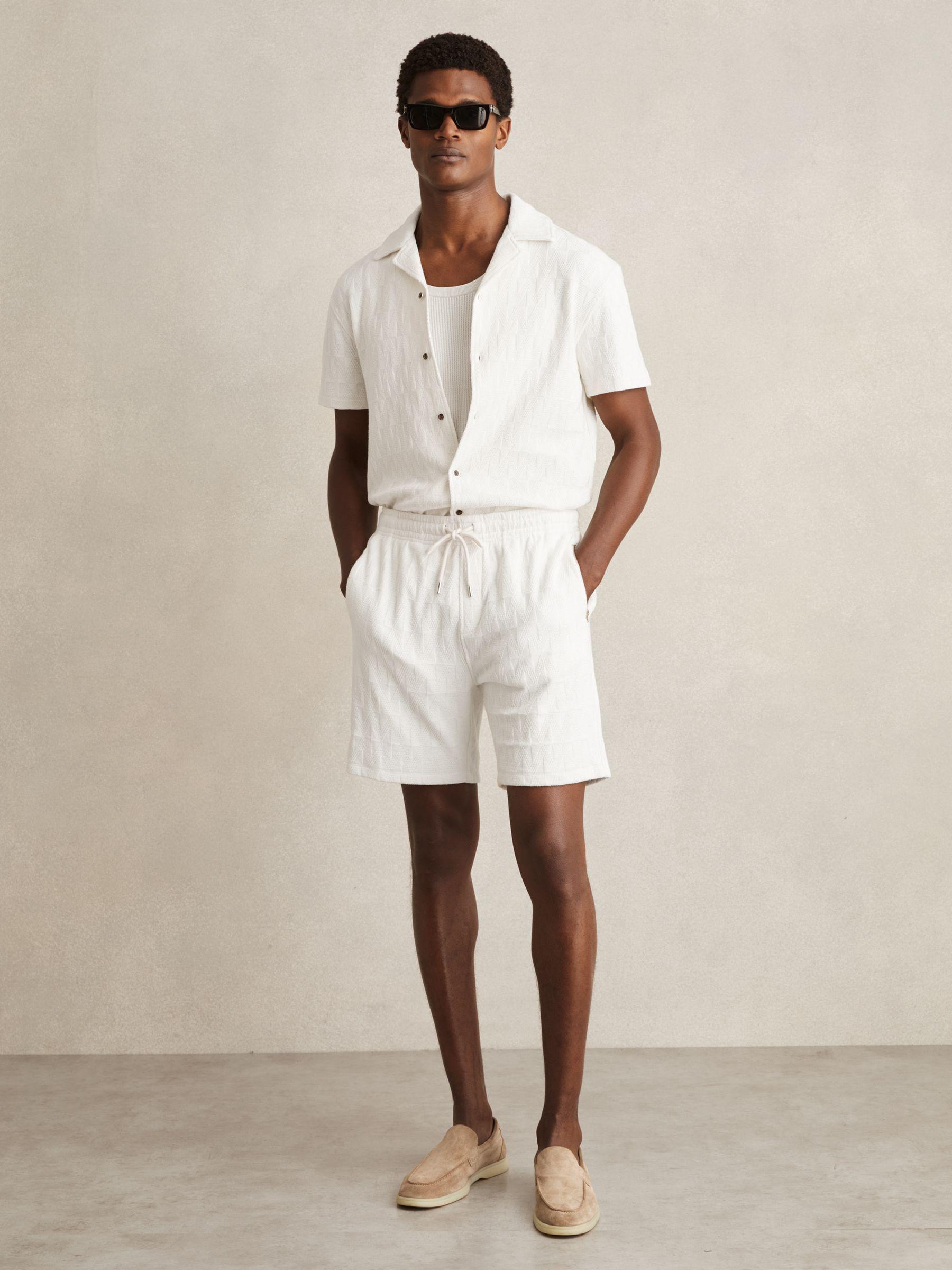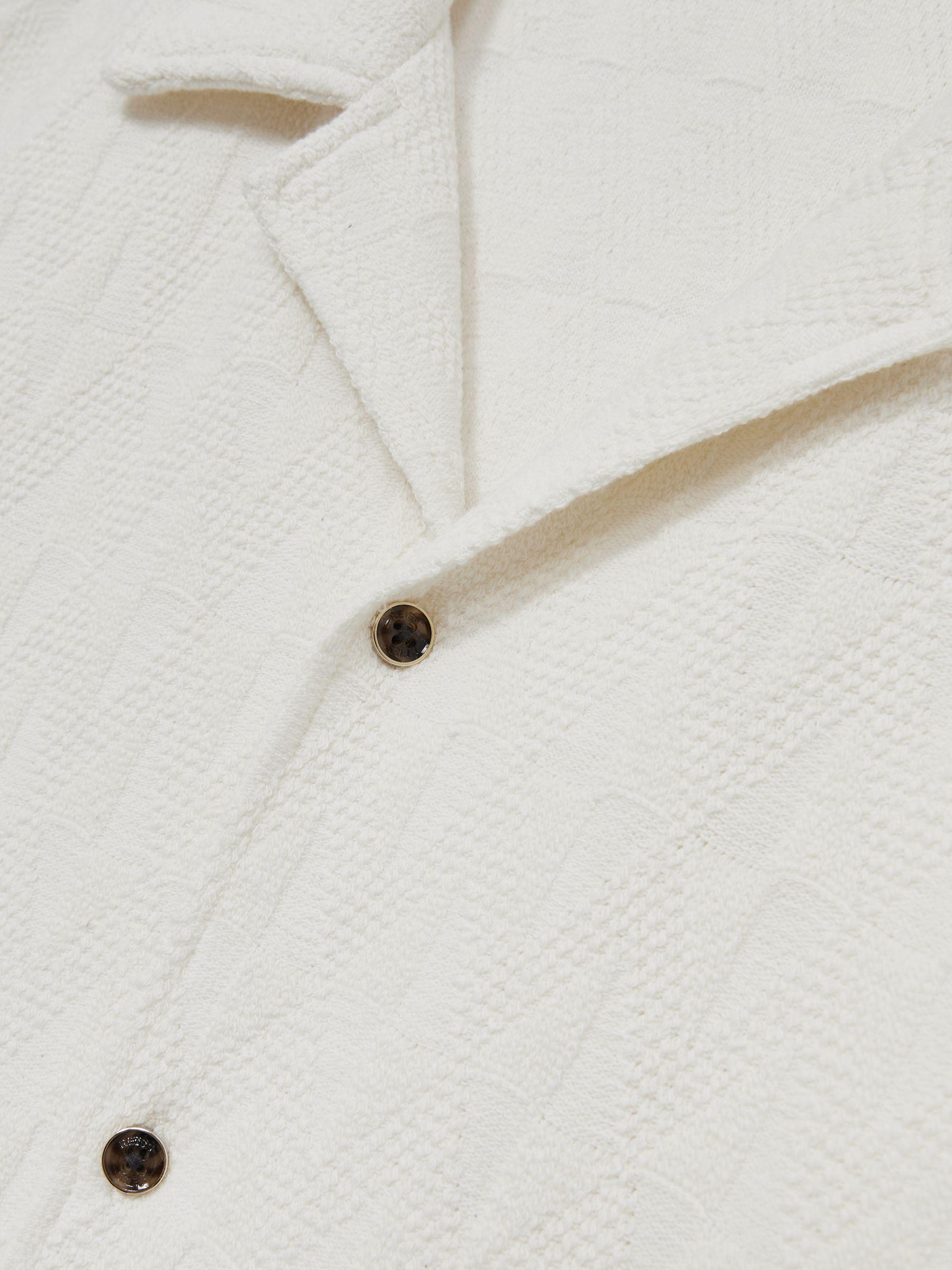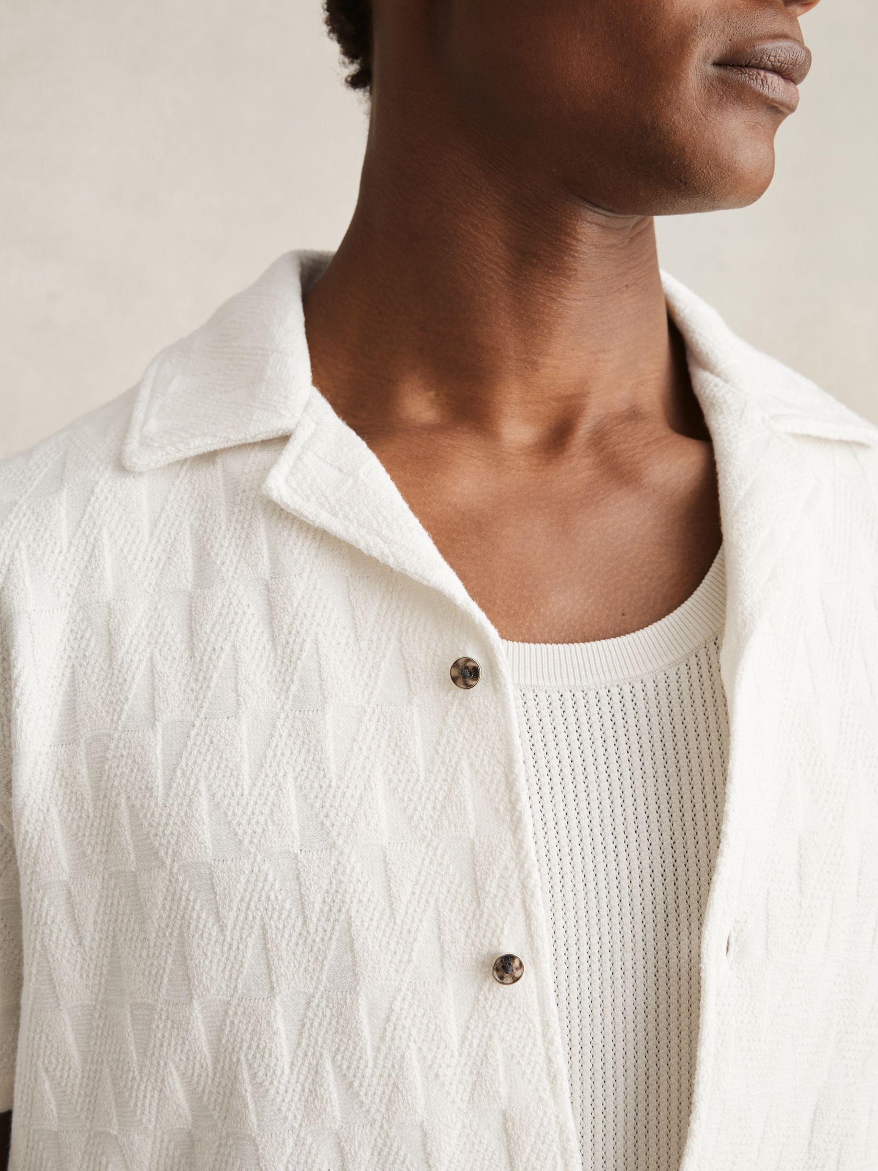 A textured jacquard adds tactile depth to the Ackling shirt, crafted from a comfortable cotton-stretch blend. The Cuban collar and short sleeves offer a relaxed, stylish fit, while front buttons provide a polished finish. Pair with the matching Phillimore shorts for the full look. Cotton with stretch. Textured jacquard pattern. Cuban collar. Short sleeves. Front buttons. The model is wearing a size M. Measurements of model: Height 6ft 2.5 / 189cm.