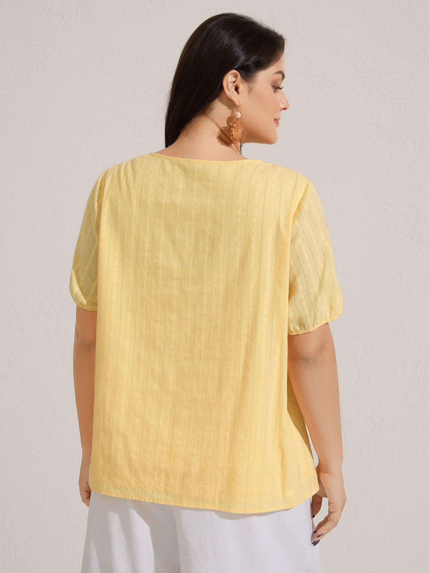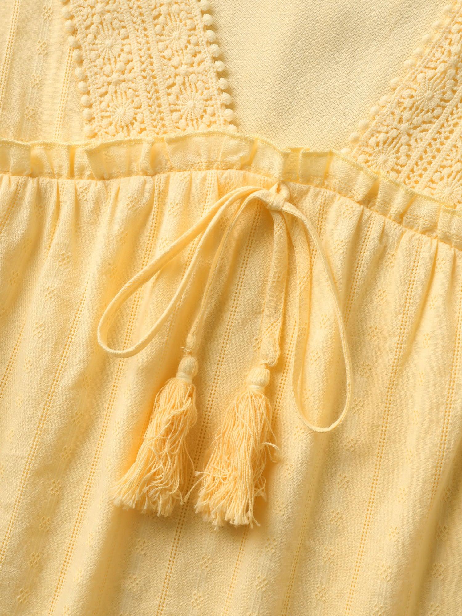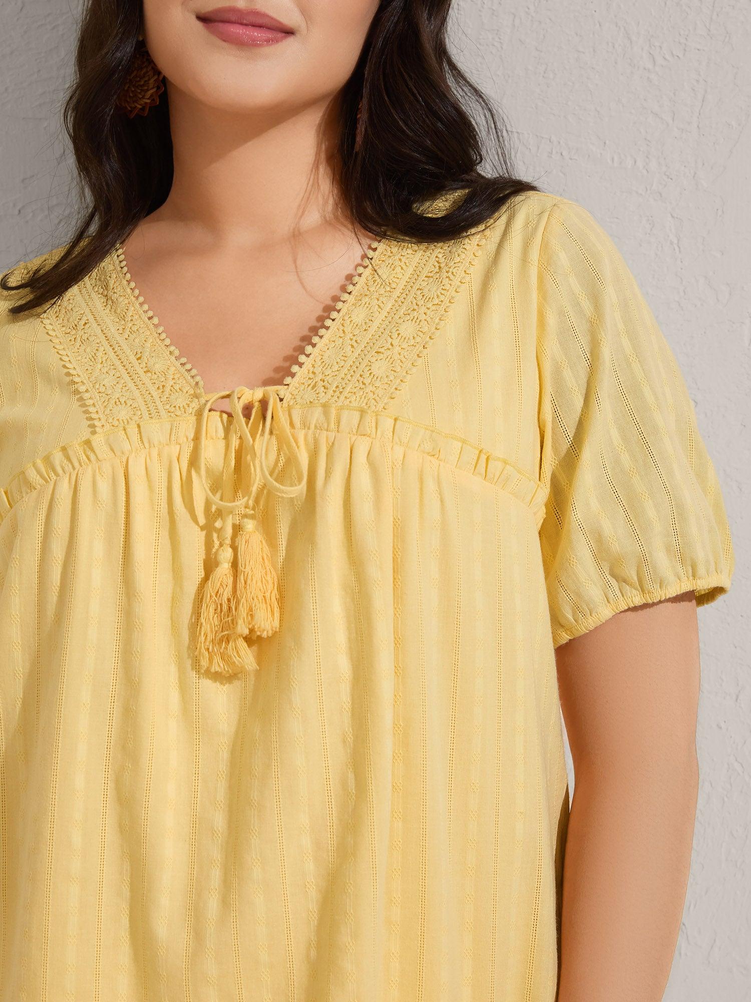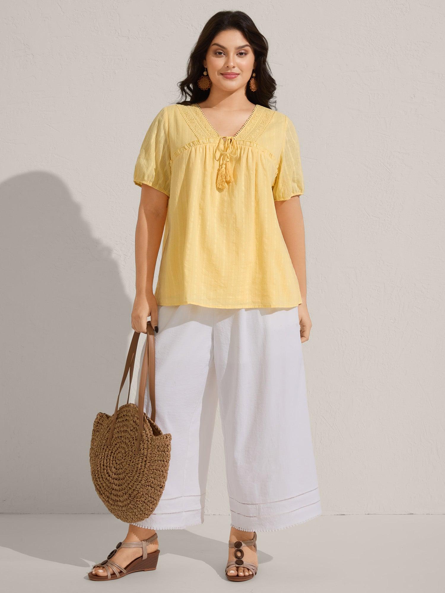 Shop Cotton Textured Lace Trim Neck-Tie Blouse now and redefine your style with confidence at BloomChic. Tailored for mid and plus-size women. This trendy Tops Women, sizes 10-30. Color:Lightyellow;Prints:Non;Neckline:V-neck;Sleeve Type:Lantern Sleeve;Details:Tie knot, Woven ribbon&lace trim, Frill Trim, Tassels, Gathered, Texture;Pocket:No-pocket