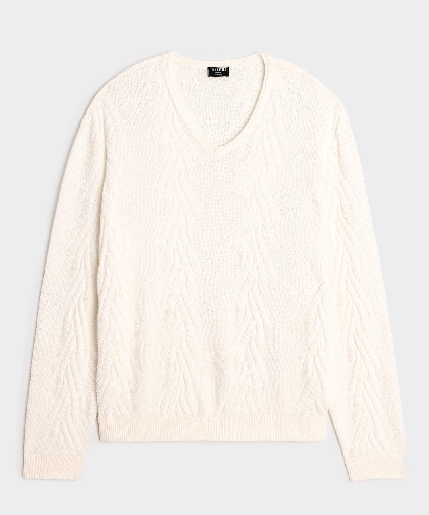 This easy sweater is made from cotton yarn — in other words, it’s warm, but still breathable, making it the perfect piece to help you navigate the shift between seasons. It’s knit with a variation on a classic cable stitch to create branching channels, layered over a seed stitch for subtle texture throughout. With a shallow v-neck collar and gently oversized fit, this is just as easy to wear solo as it is layered over an Oxford shirt. 100% Cotton Relaxed Fit Model is 6'2" and is wearing a size Medium Cable Stitch V-Neck 2x2 Ribbing at Cuffs and Waist Made in China Dry clean or hand wash cold with like colors. Do not bleach. Lay flat to dry, cool iron if needed. Style SW5680212