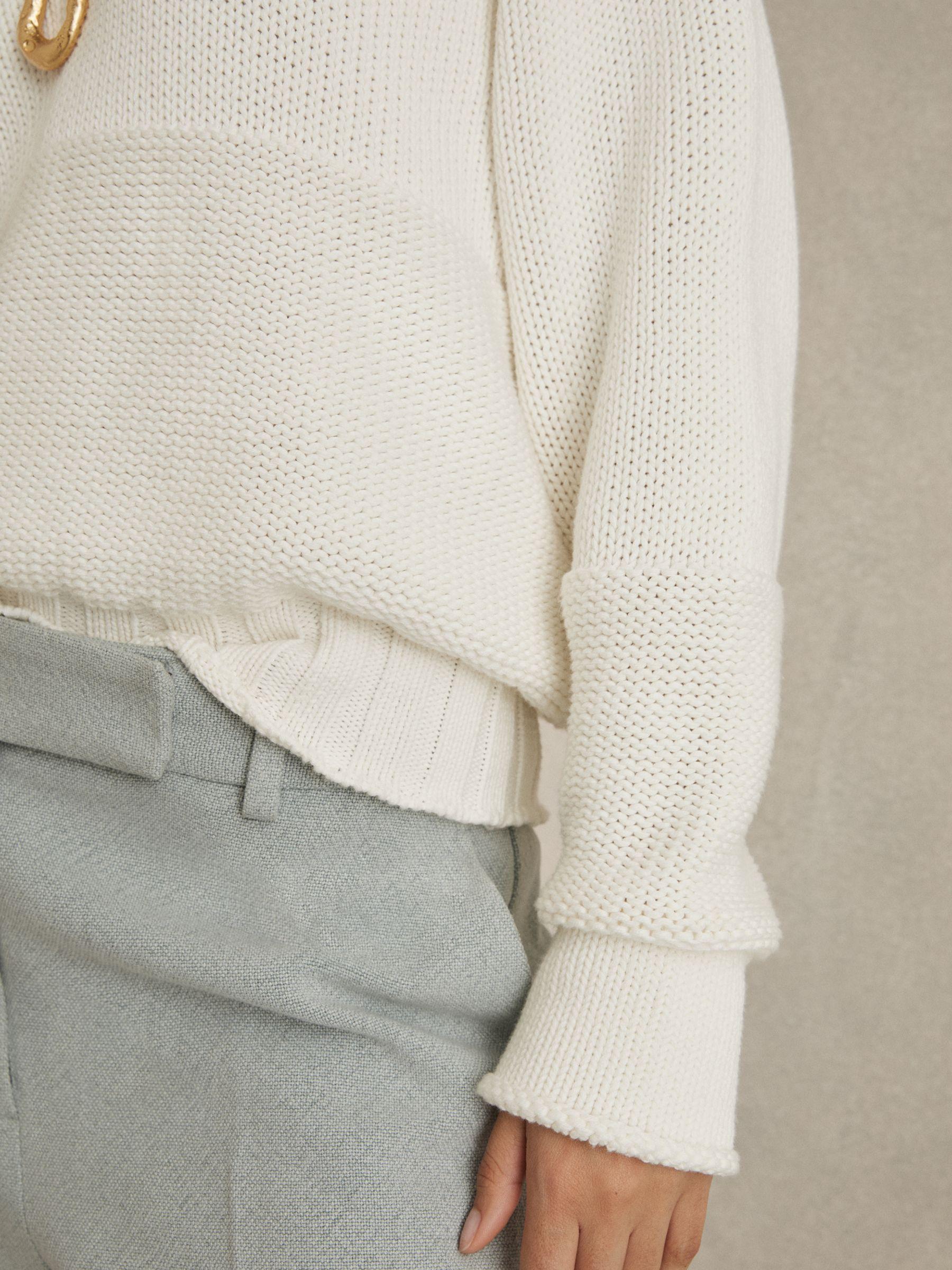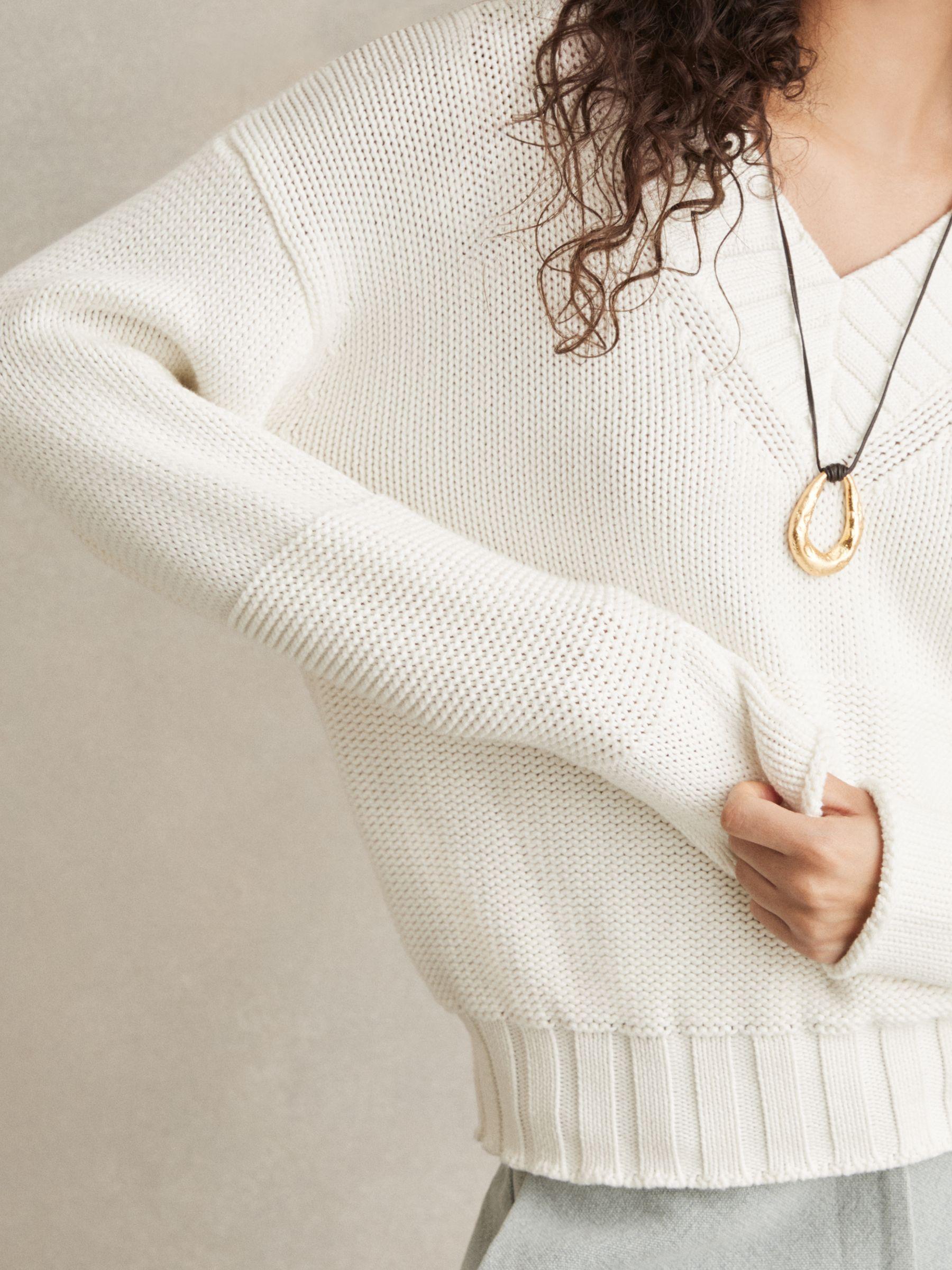 The Jenny is an elevated off-duty jumper, knitted from 100% cotton. It’s defined by a V-neckline with prominent wide ribbing, a ribbed hem, and dropped shoulders that accentuate its leisurely fit. 100% cotton, V-neckline, drop shoulders, long sleeves, wide ribbed neckline and hem.