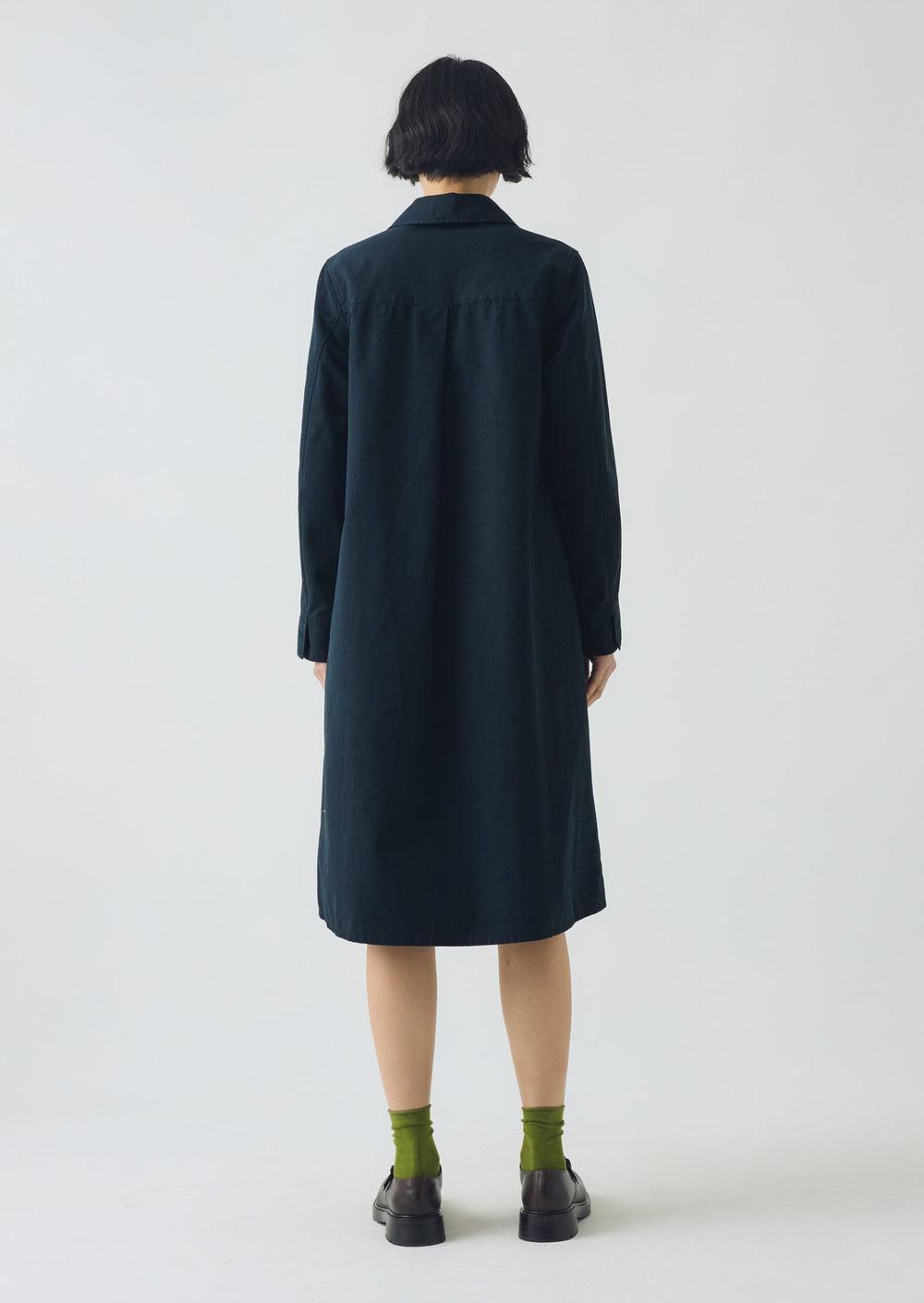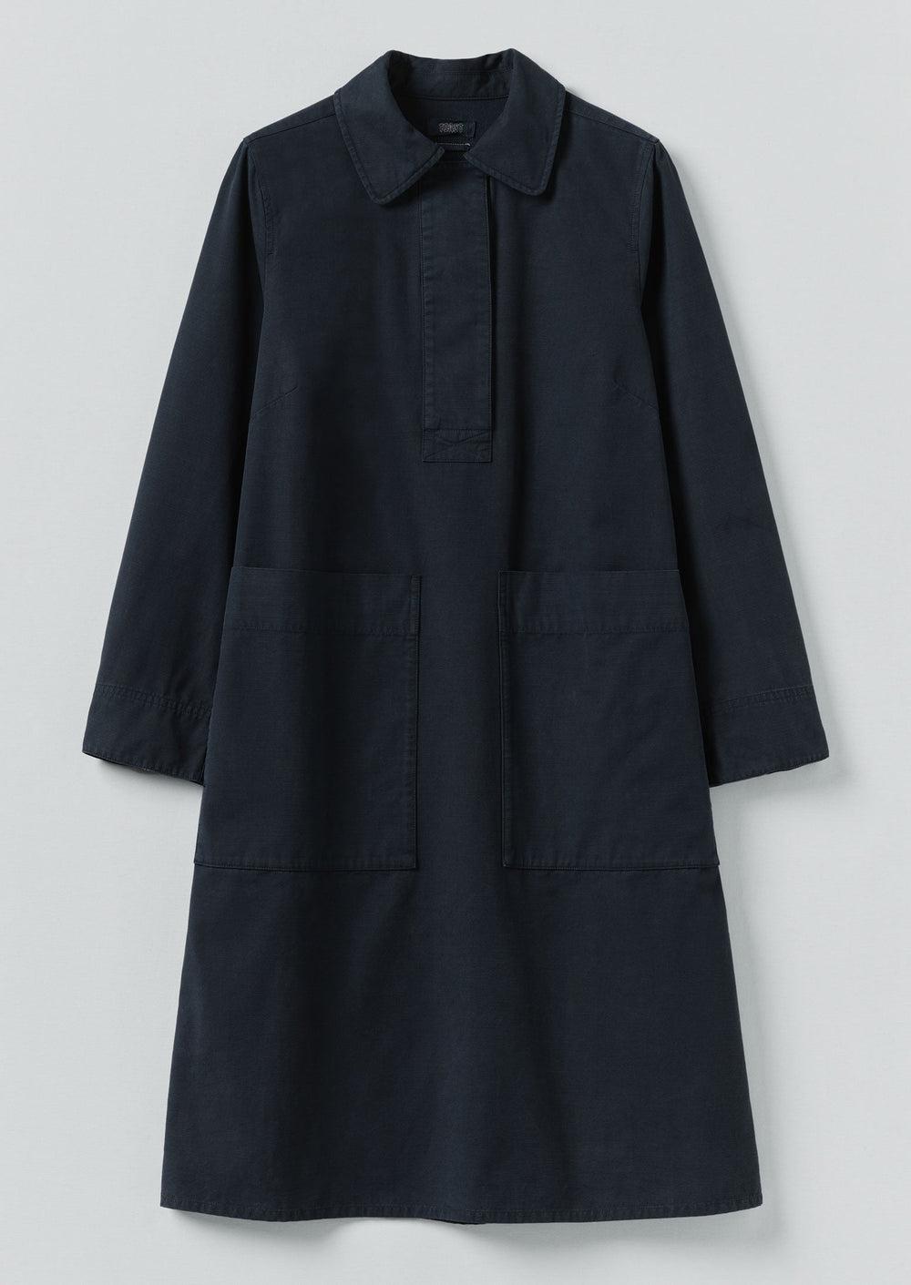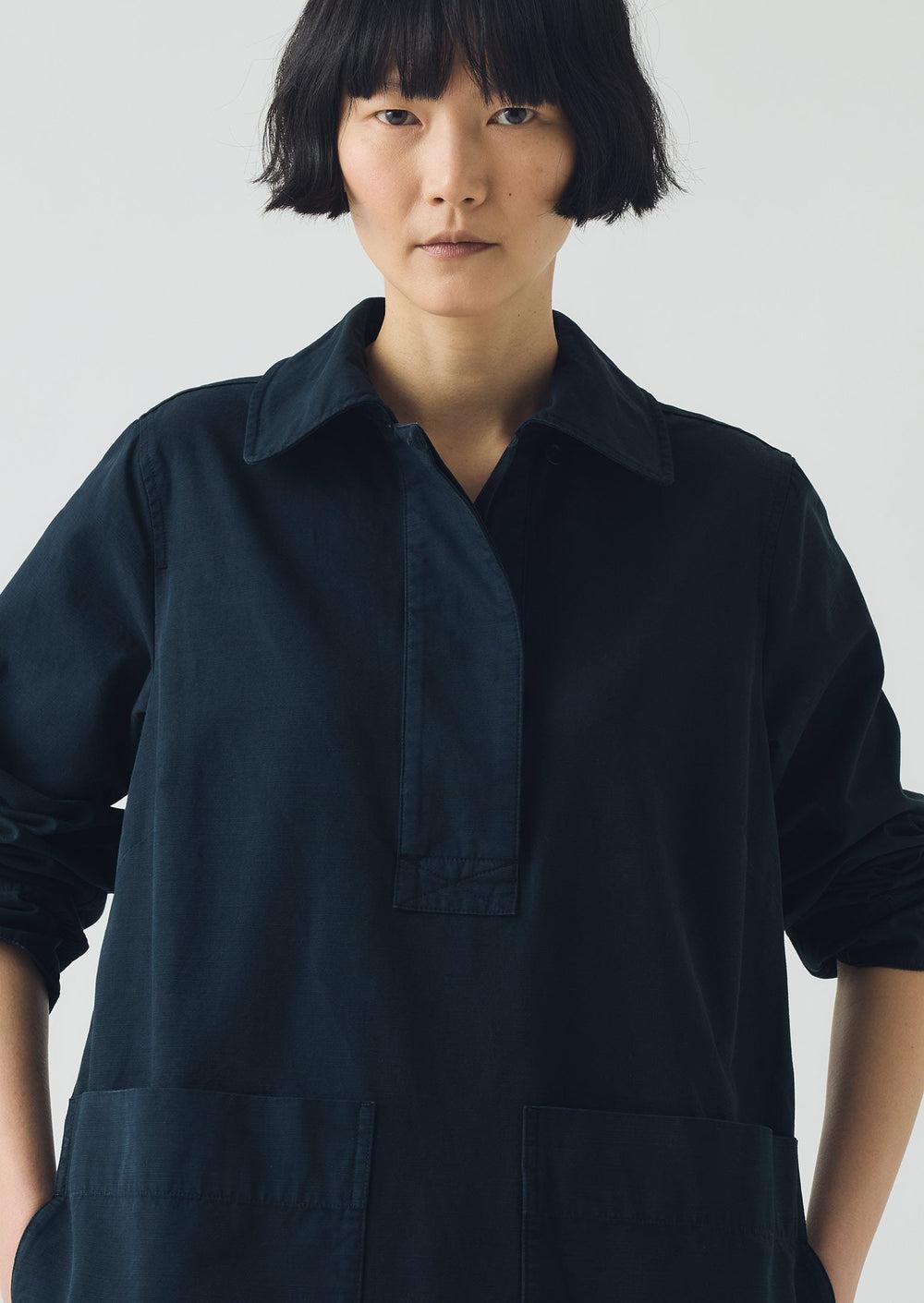 Our tunic dress is made from a soft compact organic cotton. It is garment-dyed, a process that gives each piece a natural colour variation. With double layer front pockets with top and side entry, inspired by utilitarian workwear styles. Finished with a shirt collar and a front concealed placket, fastened with corozo buttons.