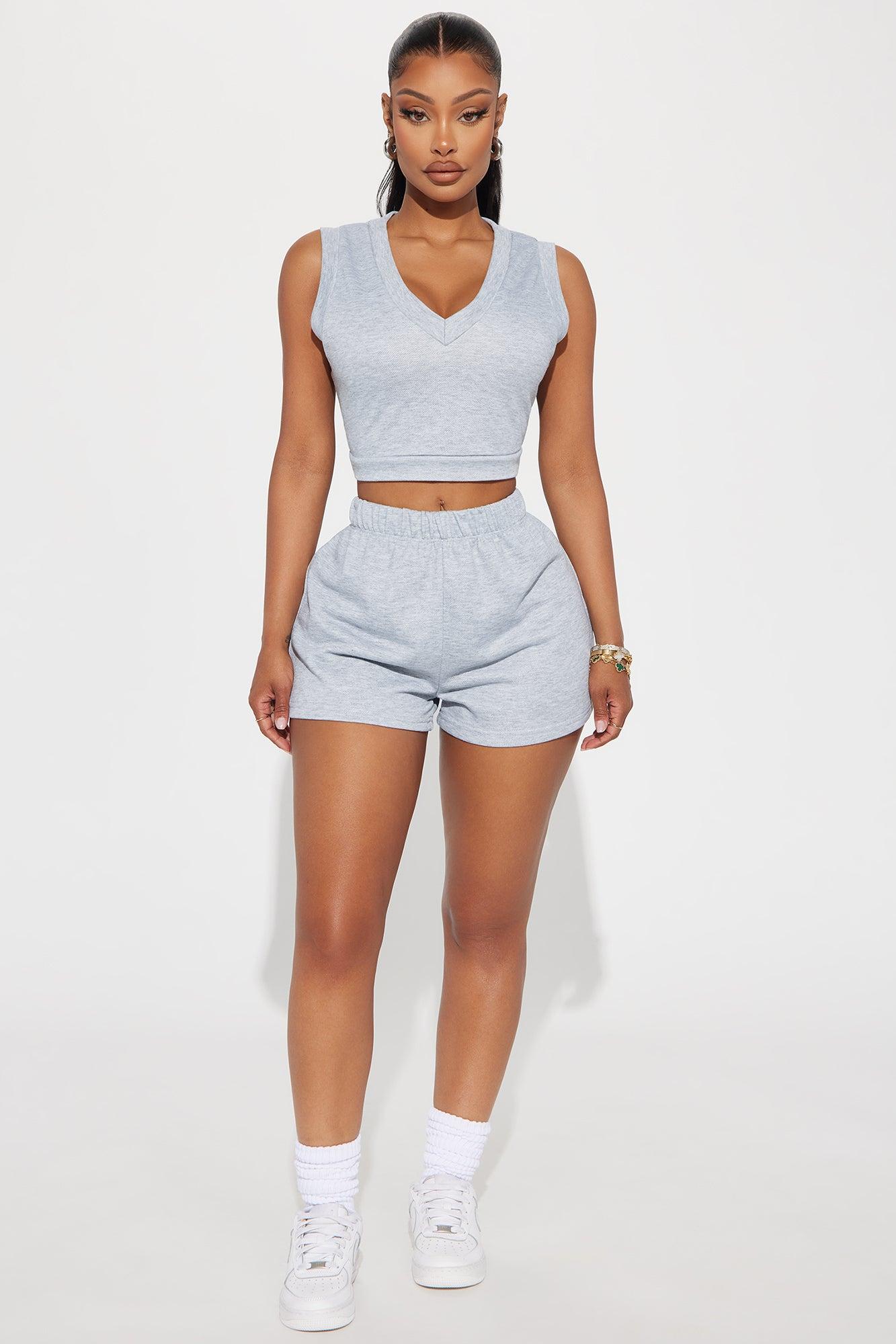 Available In Heather Grey And Tan. Lounge Top V Neck Sleeveless French Terry Cropped Stretch Pair With " Country Club Lounge Short" 100% Polyester Imported