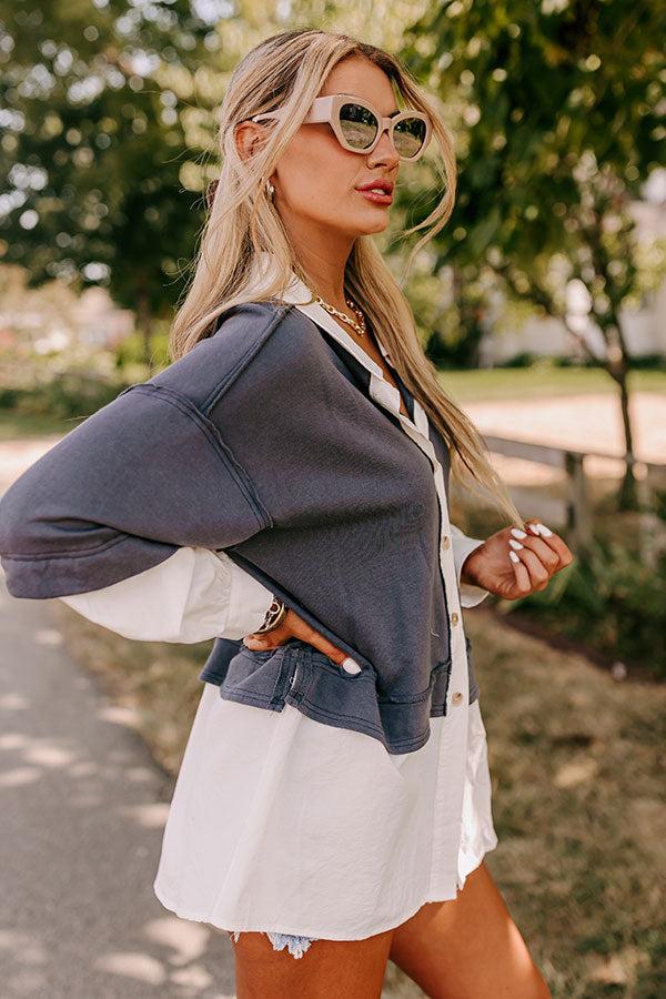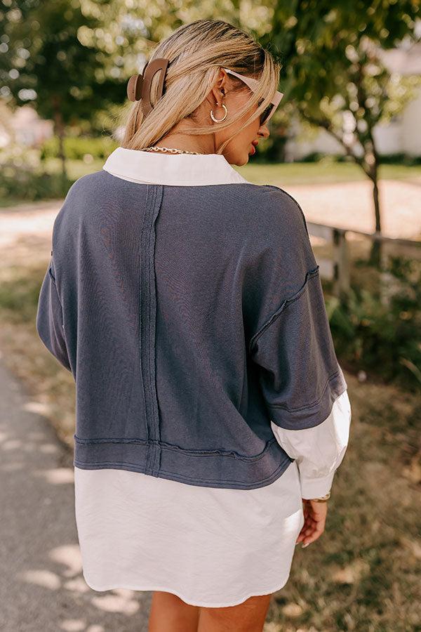 - Embrace trendy style with this adorable tunic top! Perfect for coffee shop meet-ups and everyday outings, it's an ideal option for effortless style. Update your wardrobe with this casual-chic top! - Soft sweatshirt material as well as crisp white accent material - Unfinished and rolled seam accents - A collared neckline - A six buttoned bodice - A faux undershirt style design - Long sleeves - An oversized silhouette that ends in a tunic length hemline with a curved back and a front that splits open into an accent slit