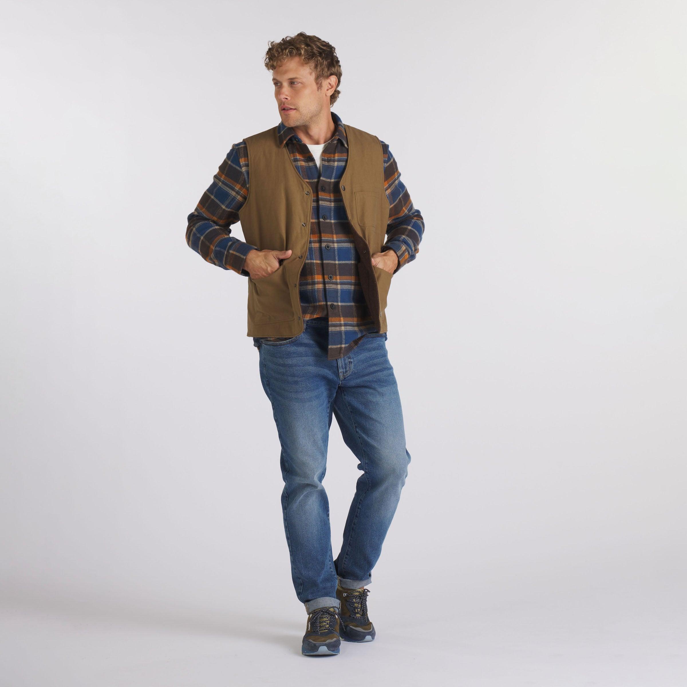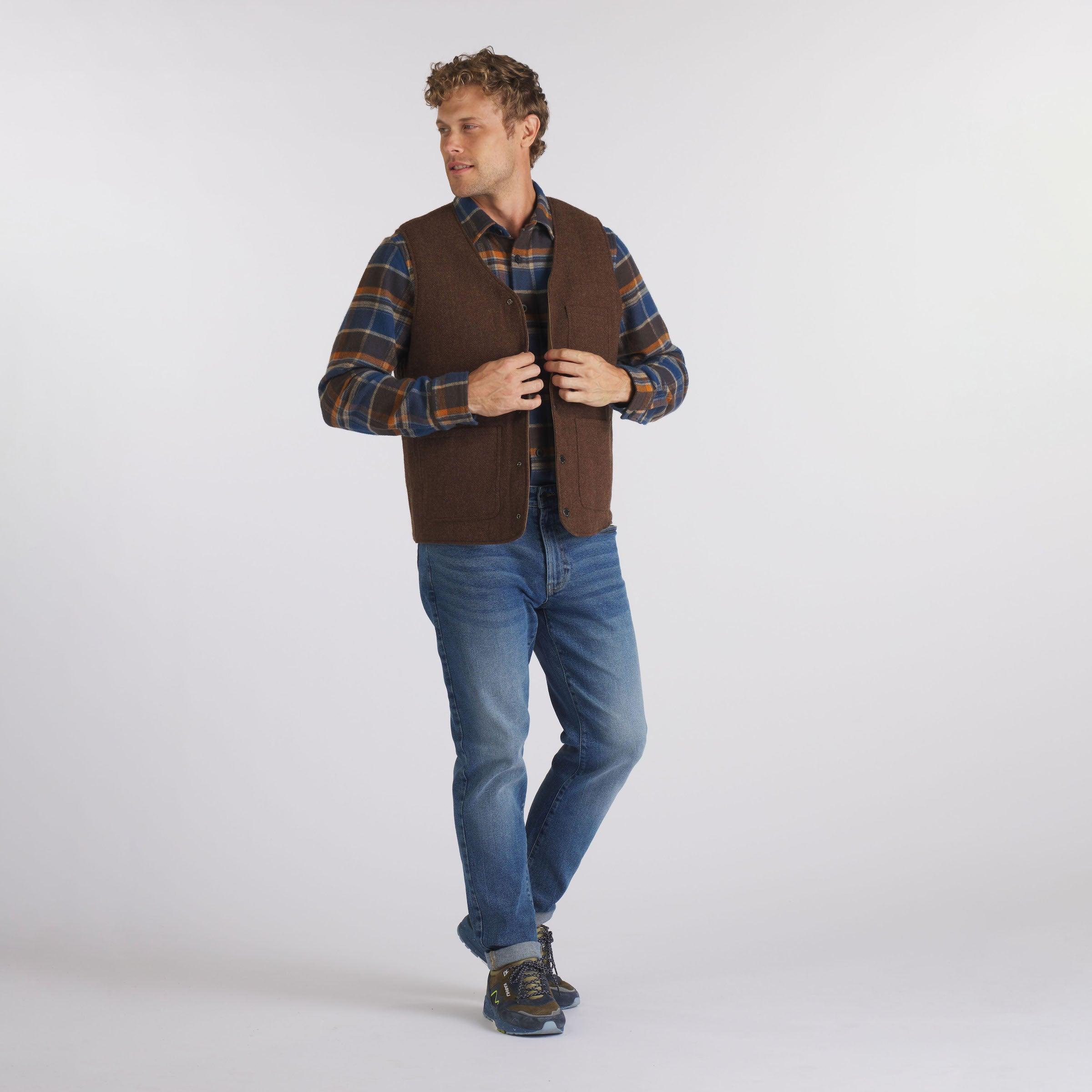 Our rendition of the classic British tweed vest. A "country swire's" favorite, we used classic tweed wool weaving techniques to develop these special mottled yarns in seasonal chestnut browns. Reversible and lined with a sturdy cotton twill cloth that can be worn as a twill vest. Wear it in a country casual way, over a button down flannel or our New Spencer waffle crews. The Model is also wearing: Scarboro Heavy Flannel - Blue Orange Plaid and Edward Stretch Straight Fit Denim - Vintage Wash. Model: Chris is wearing size medium and is 6'. ----Details---- Reversible vest Two large patch pockets Chest patch pocket Snap front closure Flat logo snaps Imported ----Materials---- Body: 100% Wool Lining: 100% Cotton ----Sizing---- Measuring Method: All measurements are in inches and based on a “flat” garment, as shown below. For comparison with one of your existing garments, please lay garment on a flat surface and follow the key measurement points. For chest and neck, if you double the flat measurement, you will get close to the full body. ----Care---- Dry Clean Only.