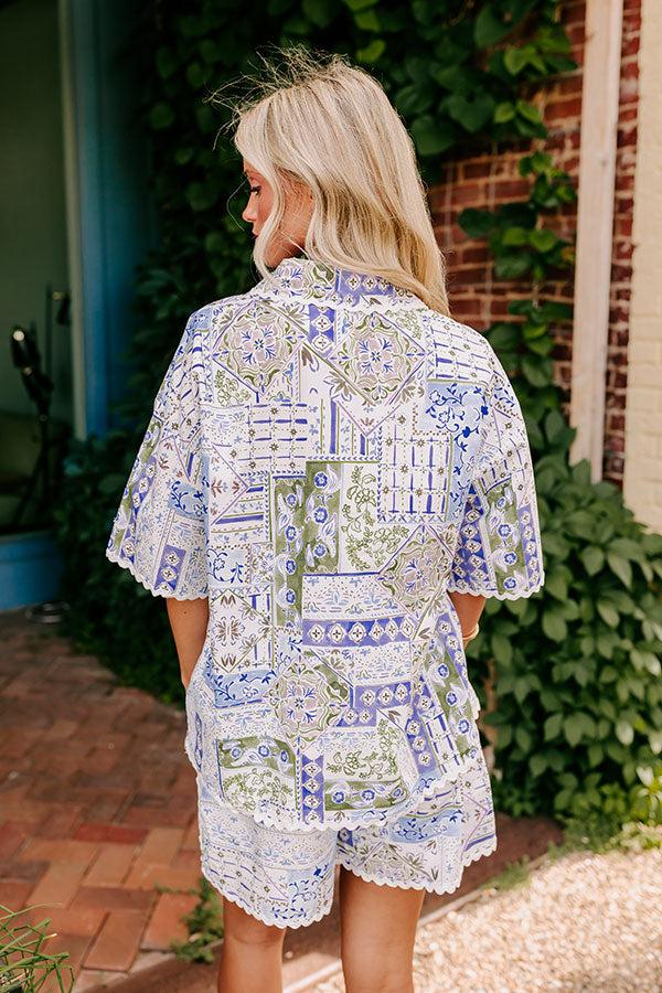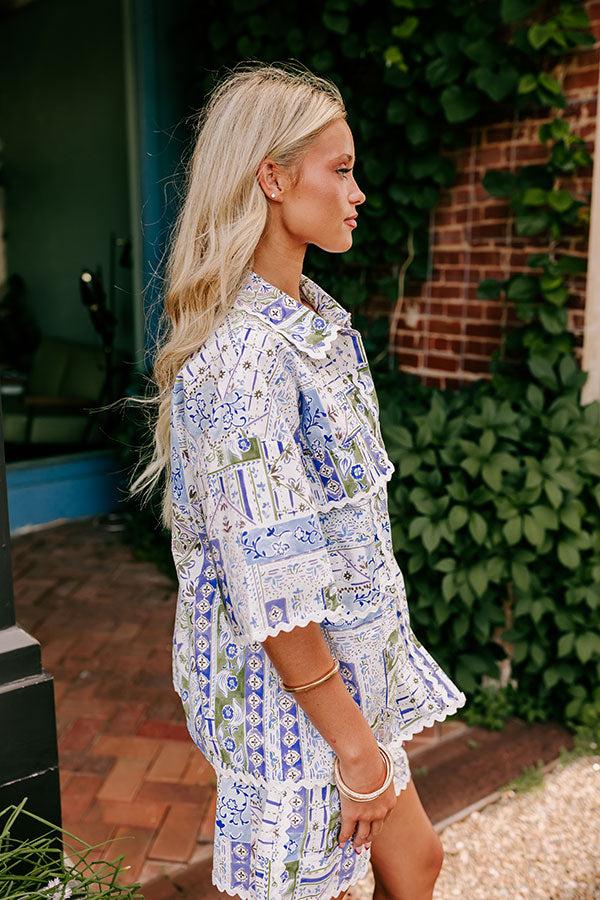 - Stay sweetly styled with this beautiful button-up! The floral patterns bring a touch of the charm to your wardrobe, while the intricate detailing of the ric-rac adds a whimsical vibe. Perfect for a sunny stroll, this top effortlessly blends elegance with a hint of playfulness, making it an ideal choice for any casual occasion. - Unlined material with an abstract botanical print featuring blue, purple, and green hues - Ric-rac accent trim - A collared neckline - A button-up front - Short, loose sleeves with ric-rac trimmed cuffs - Functional chest pockets - A relaxed silhouette that ends in a scalloped ric-rac trimmed hemline