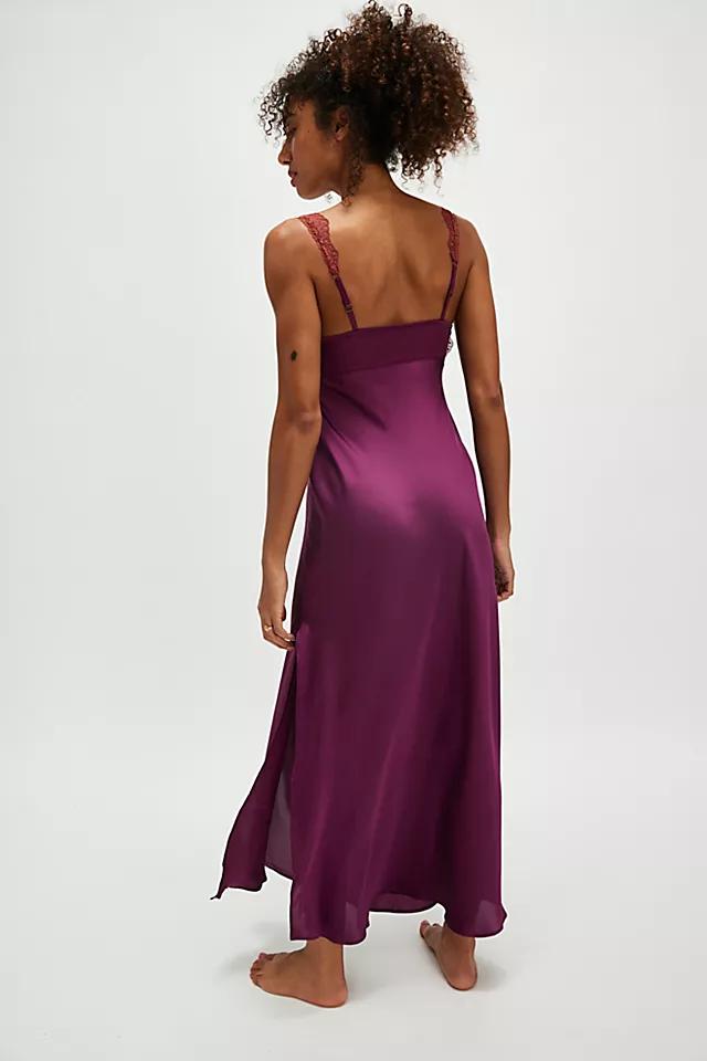 So sultry in a slinky fabrication, this maxi-length slip features luxe lace detailing at the bust and a bold slit at the leg.