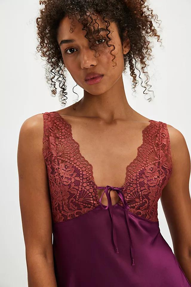 **Features:** Soft fabrication, lace detail at bust with an adjustable tie, sleeveless design, side-slit detail, low back with adjustable shoulder straps