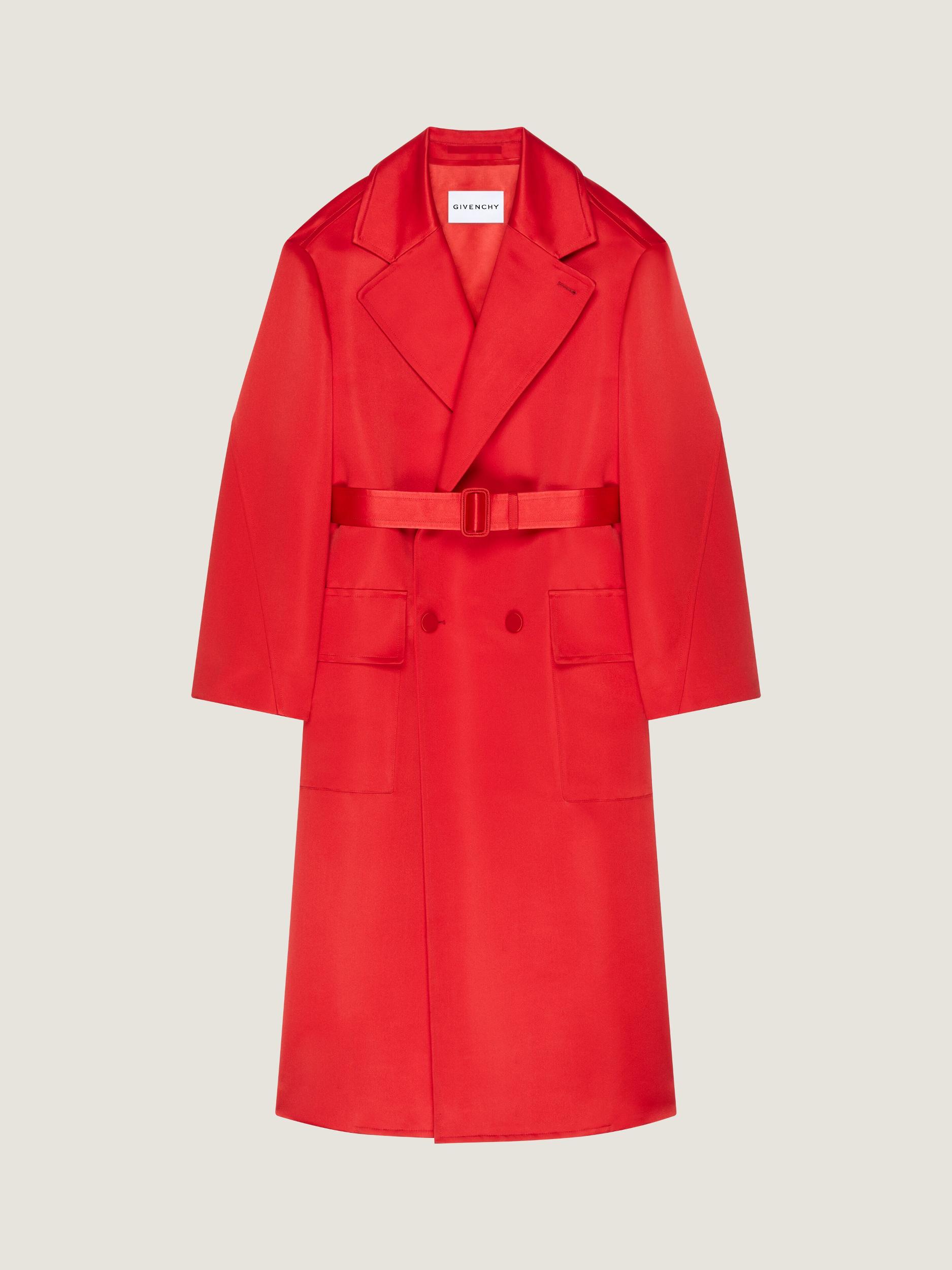 Echoing Givenchy’s couture heritage, the curved, inverted seam traces sleeves and trouser legs to create a sculptural silhouette. Coat in silk satin duchesse. Notch lapel. Double breasted. Removable belt. Two front flap pockets. Couture seams for a rounded proportion. Relaxed fit. Model measures 6.1 Feet and wears a size 48.