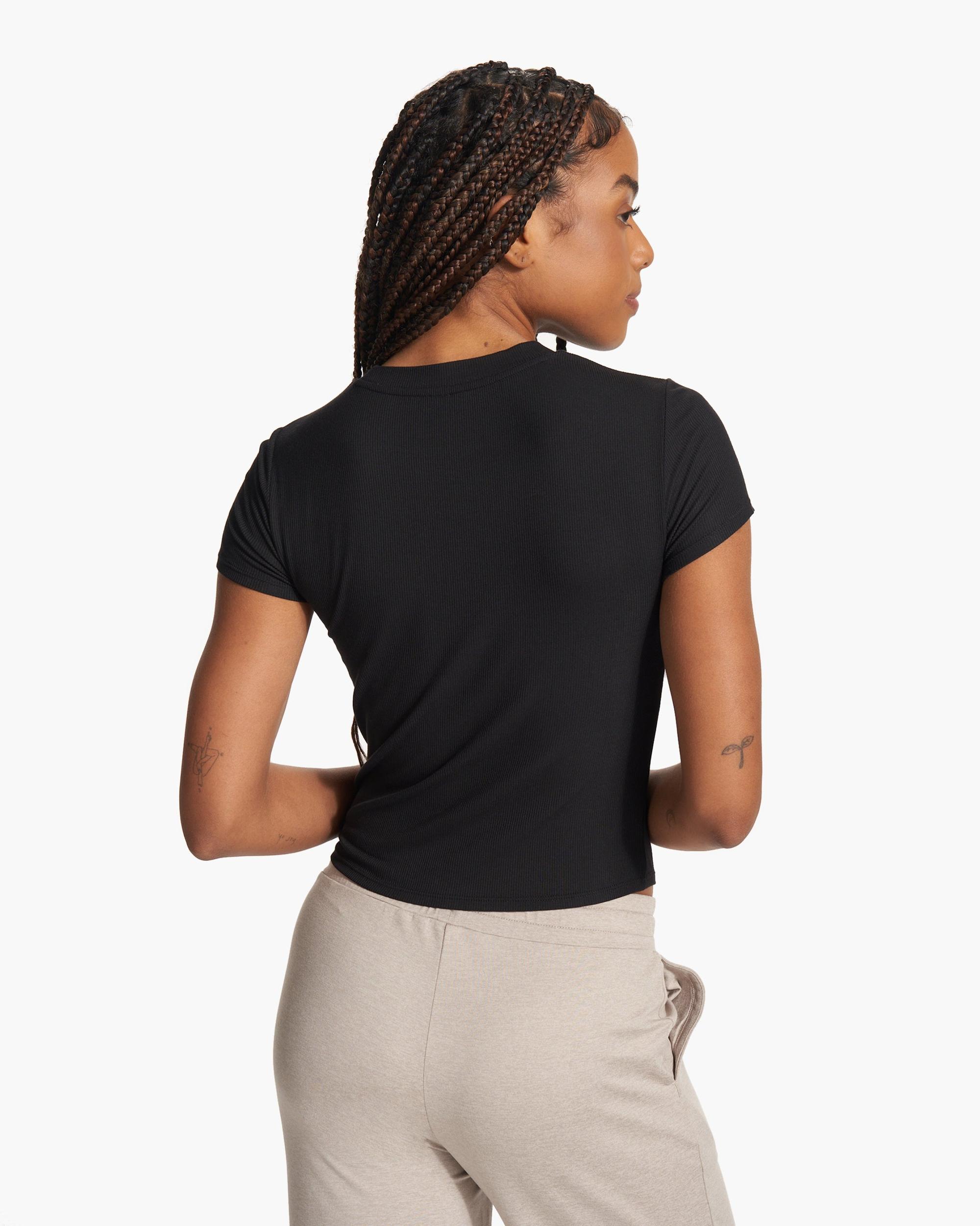The Cove Cut Out Tee is an essential women's workout tee featuring a center cut out detail and our soft knit rib fabric. Shop this Black tee from Vuori.