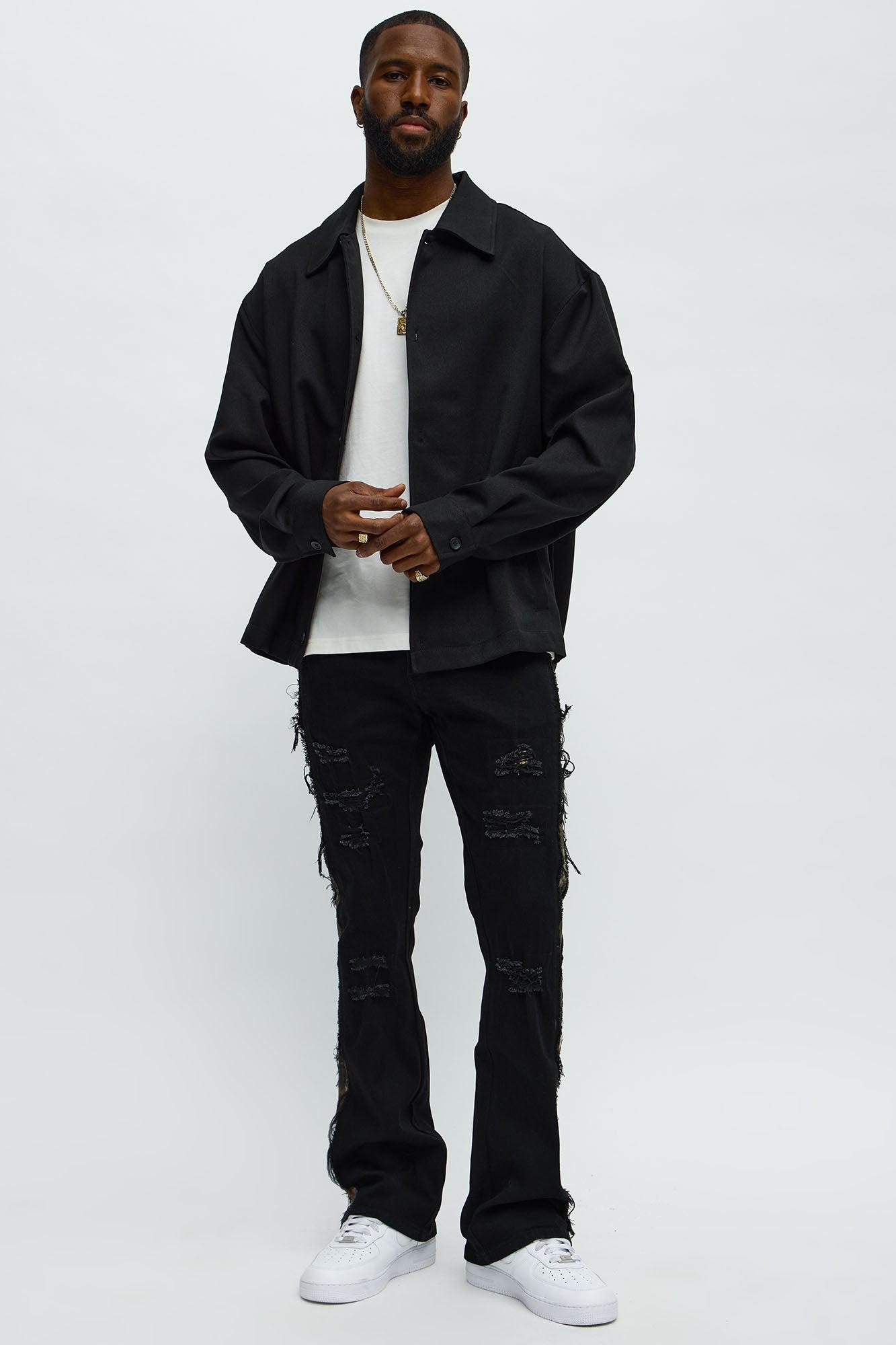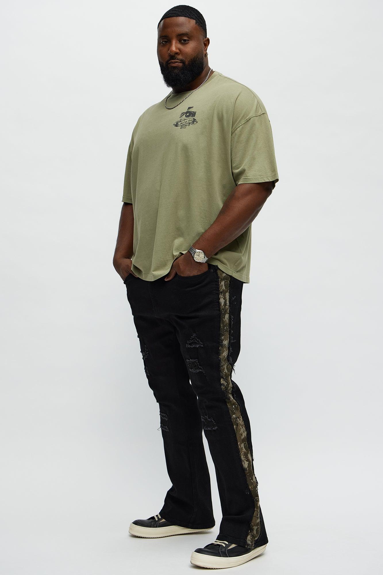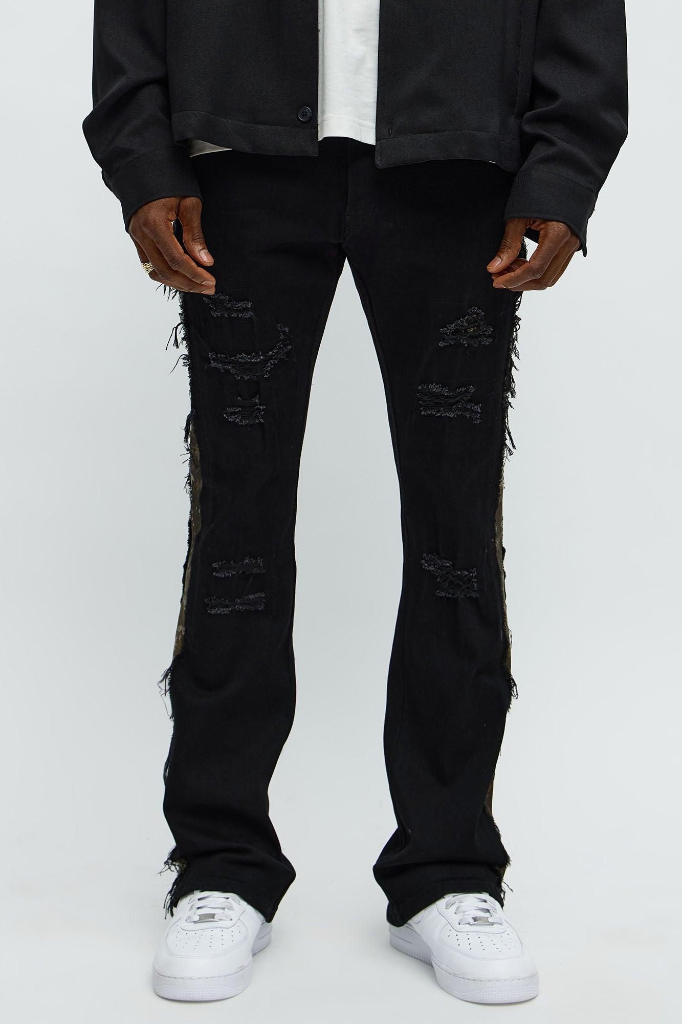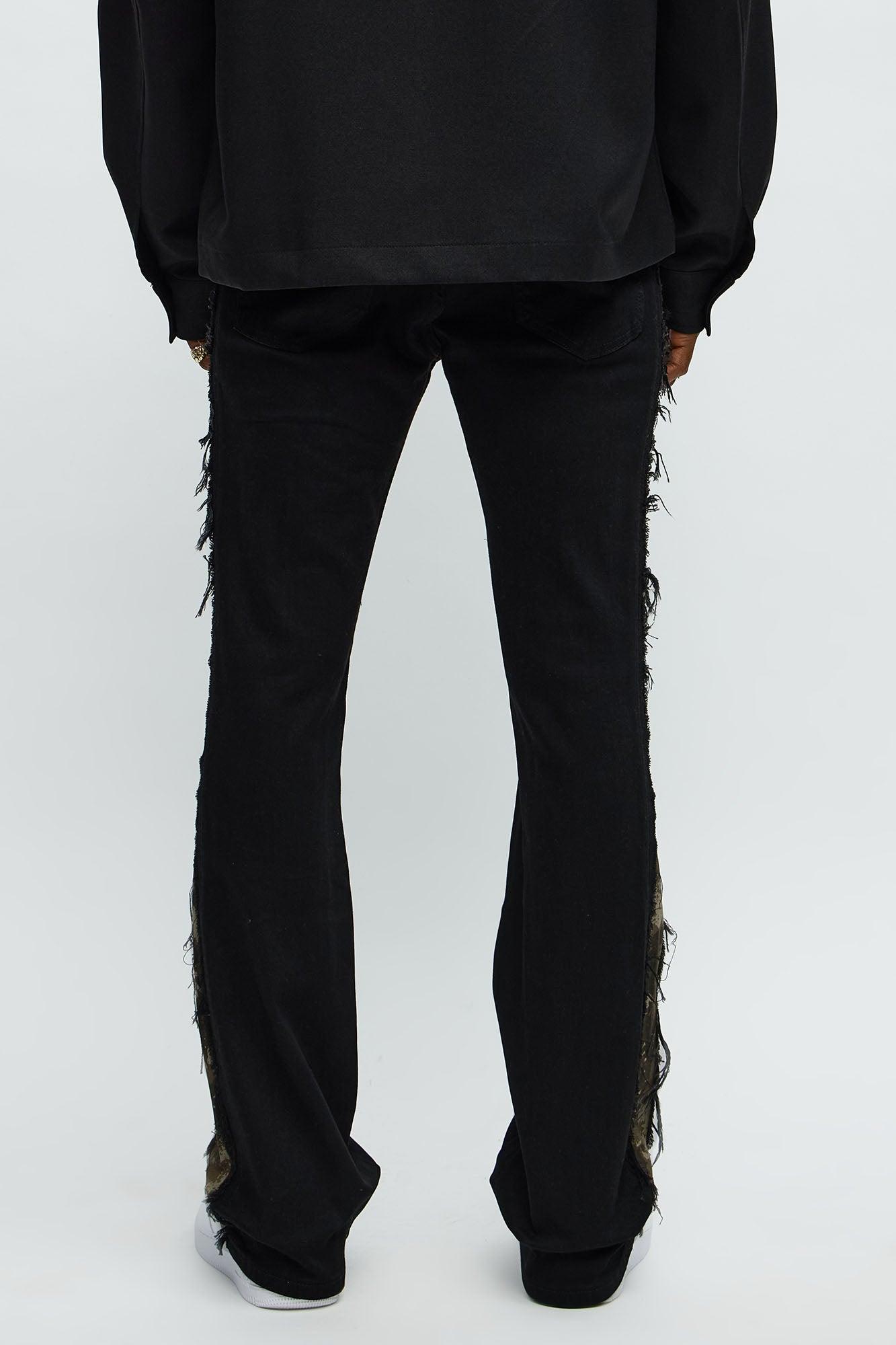 Available In Black. Stacked Skinny Flared Fit Zip Fly Button Closure Side Camo Pattern Detail Distressed Detail 70% Cotton, 28% Polyester, 2% Spandex Disclaimer: Due To The Specialized Distressing & Wash Process, Each Garment Is Unique. Imported