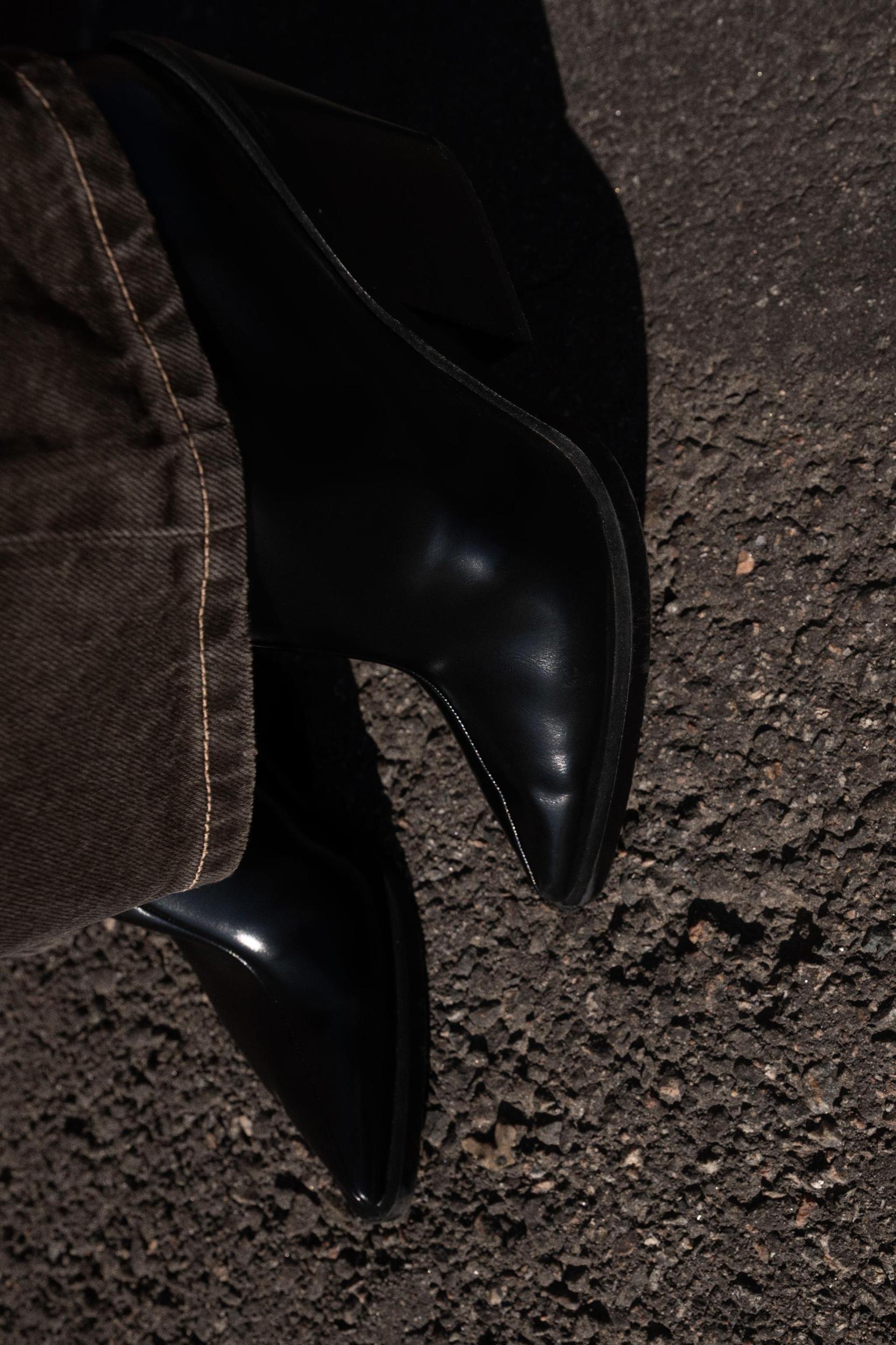 Cowboy-style ankle boots. Low shaft. Topstitch detail on the front. Curved block heel. Side zip closure with pull tab. Pointed toe. Sole height: 3.5 inches (9 cm)