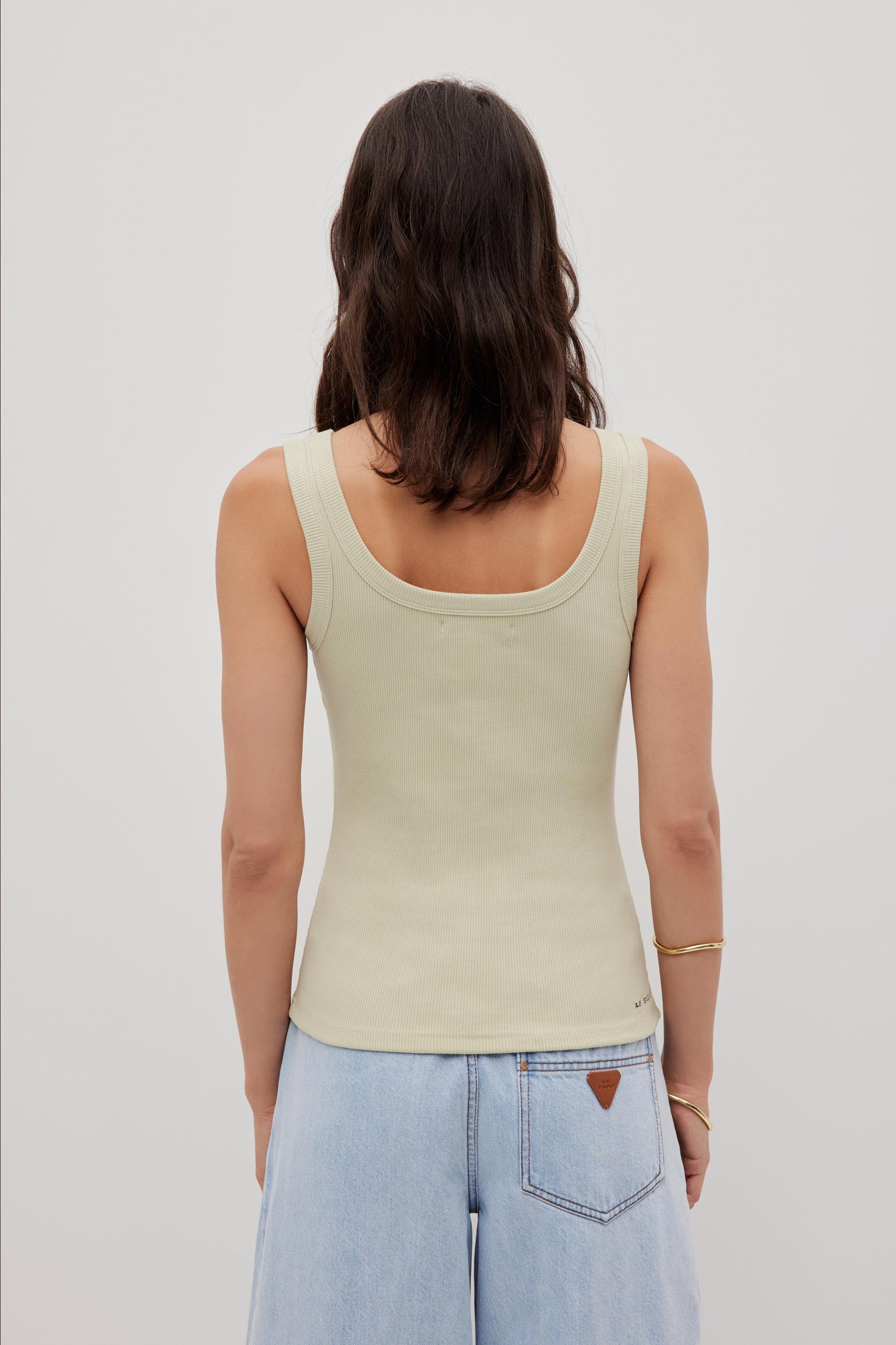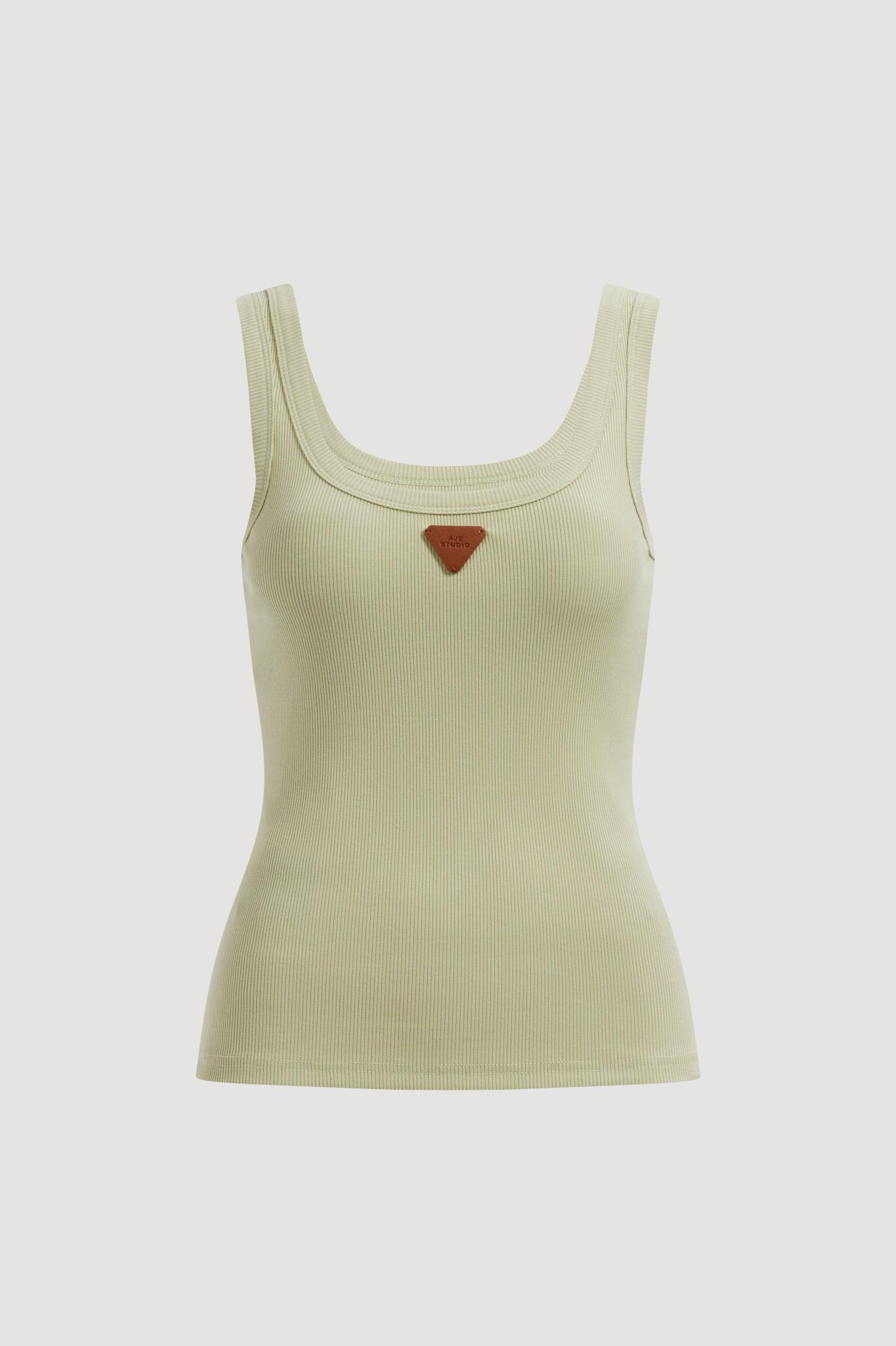 PRODUCT DETAILS Tank top Fitted style Rib knit Scoop neckline at front and back Wide tank straps Embossed vegan leather logo patch at front Pull on style 95% Cotton, 5% Elastane Dry Clean Only Shop All Tops SIZE AND FIT Model wears a size 8/S Model: 179cm/ 5’10 Bust: 82cm Waist: 64cm Hips: 88cm