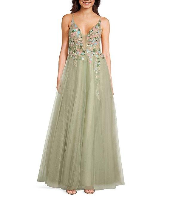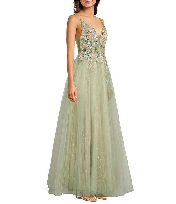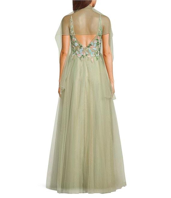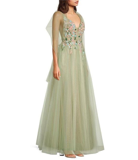 From Coya Collection, this gown features: Deep V-neck Sleeveless Floral embroidery Flowing tulle skirt Zipper back closure A-line 48" length Polyester Spot clean Imported.