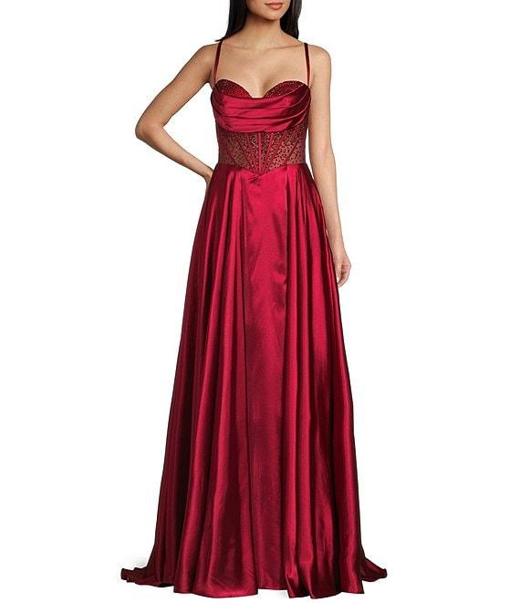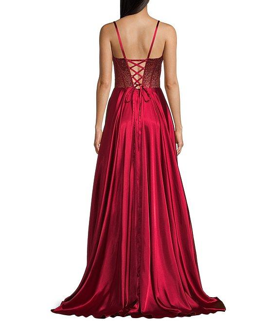 From Coya Collection, this dress features: Satin and mesh fabrication Sweetheart neckline Sleeveless Spaghetti straps Illusion corset with beaded stones Front slit A-line Lace-up zip-back closure Approx. 47" length Polyester Spot clean Imported.