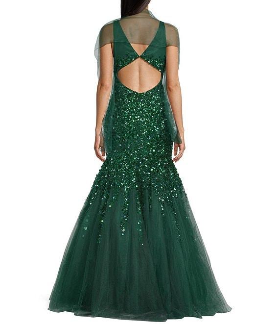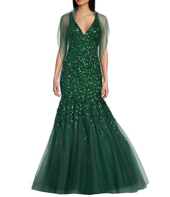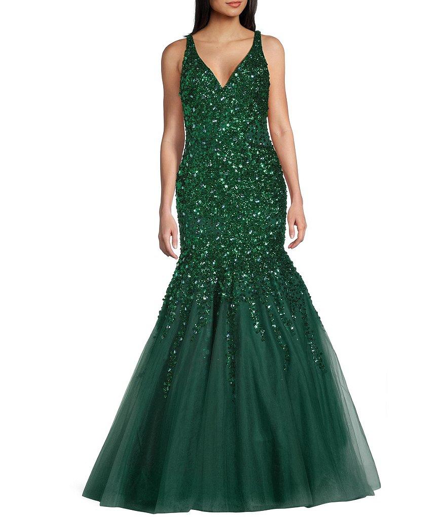 Coya Collection Sequin Beaded V-Neck Tulle Mermaid Gown