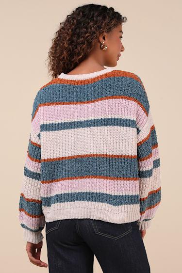 There's nothing quite like your favorite sweater, and we're pretty sure the Lulus Coziest Cuddles Ivory Multi Striped Chenille Sweater is about to become your go-to choice! Ultra-soft chenille yarn shapes this cute little sweater that has a blue, lilac, and orange striped design throughout. Long sleeves with drop shoulders frame a relaxed bodice with a crew neckline and a ribbed knit hem. Matching ribbed knit at neck and cuffs.