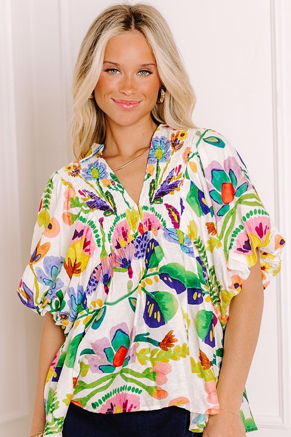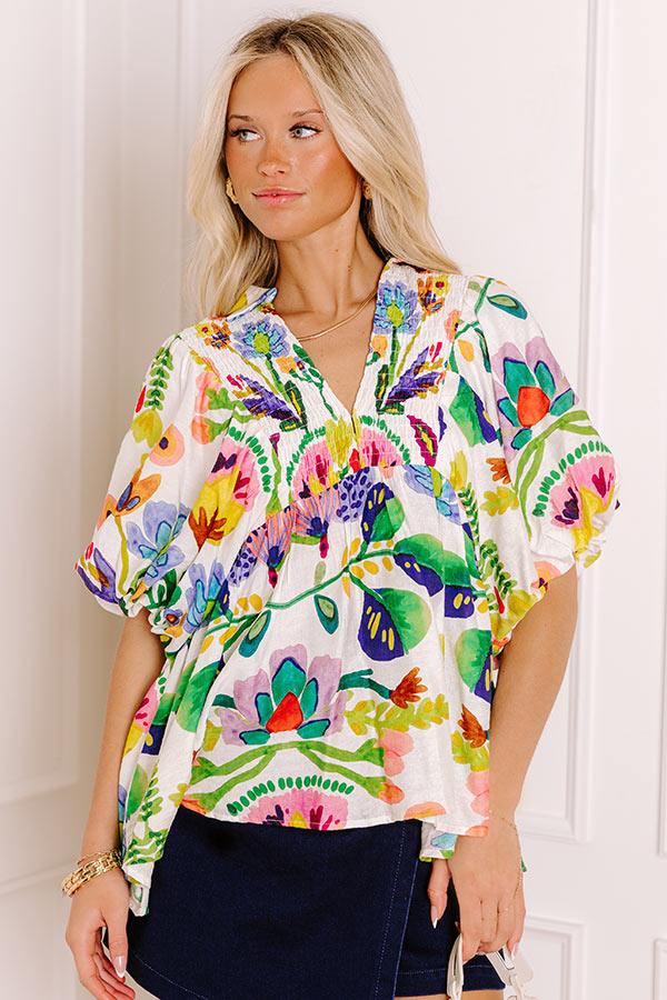 - Add a pop of playful petals to your OOTD with this adorable top! Its colorful floral print and smocked detailing bring a sweet twist to your everyday lineup.