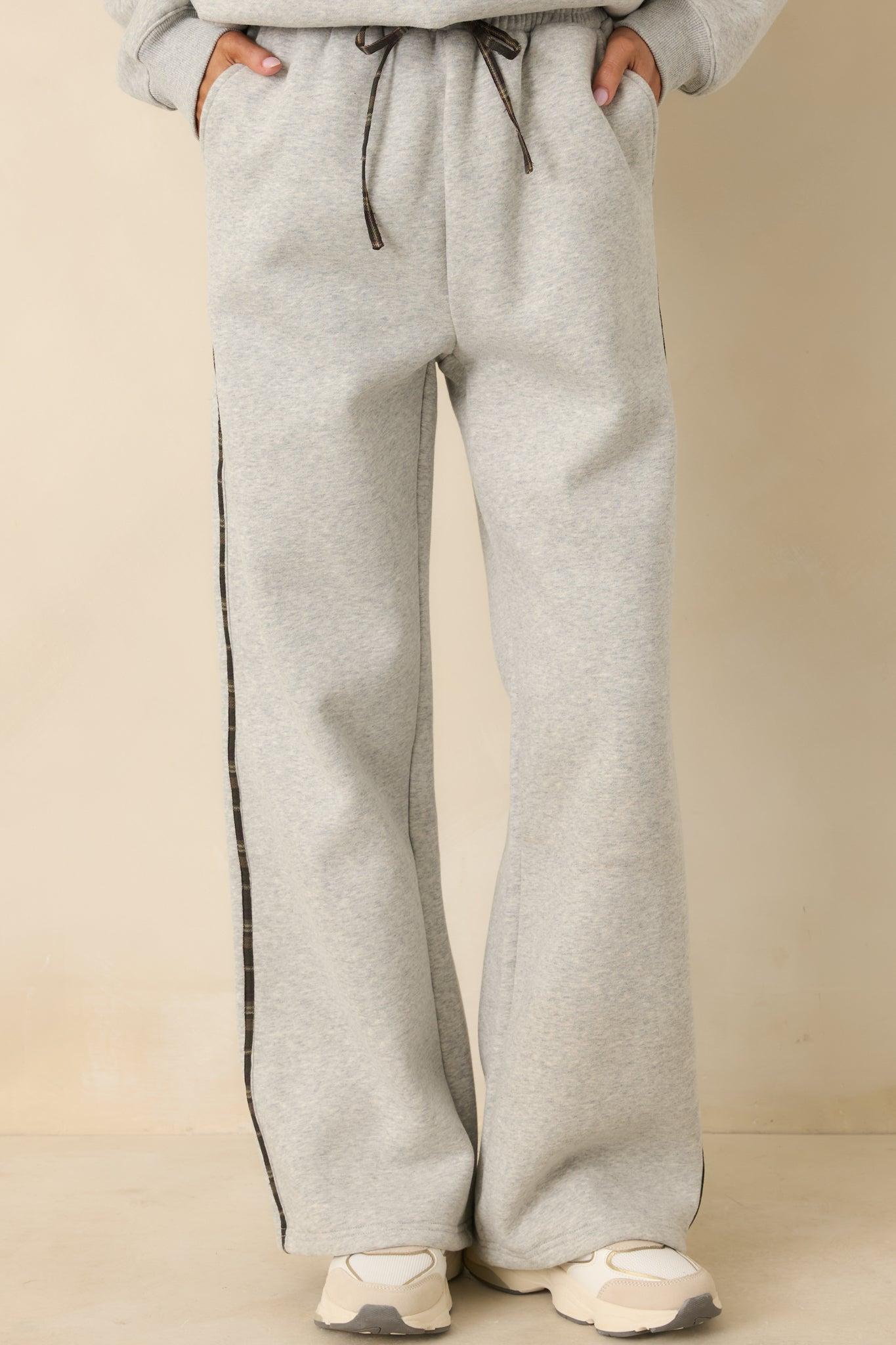 These Cozy Club Heather Grey Plaid Stripe Sweatpants bring laid-back comfort with a subtle plaid stripe detail that ties everything together. Easy, relaxed, and made for slow days or casual outings, they’re the kind of piece you’ll want to live in all season long. These heather grey sweatpants feature a comfortable elastic waistband with an adjustable drawstring and a relaxed straight-leg fit. Designed with contrast plaid stripe detailing along the sides, they’re finished with functional side pockets and a soft knit fabric for everyday wear.50% Polyester & 50% Cotton Contrast: 98% Polyester & 2% Spandex Unlined Hand Wash Cold Manufactured in China Designed in The USAModel is 5'8" and Wearing a Size Small