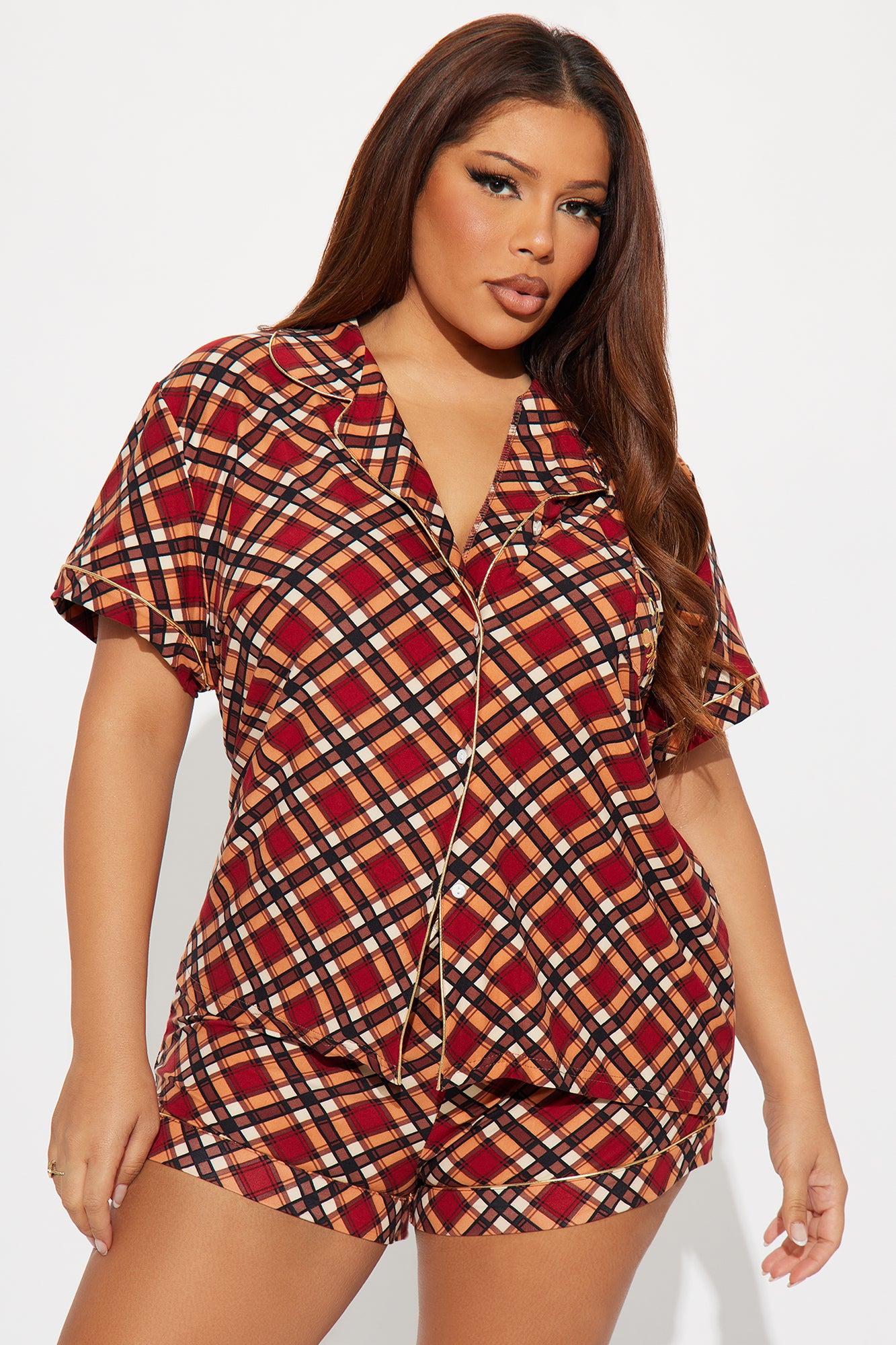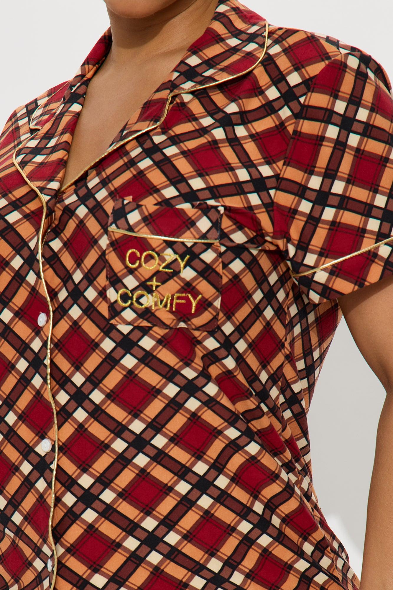 Available In Brown/combo. PJ Short Set Short Sleeve Button Up Shirt Collar Chest Pocket Glitter Embroidery Matching Short Elastic Waistband Plaid Print Stretch Final Sale Self : 95% Polyester 5% Spandex Imported