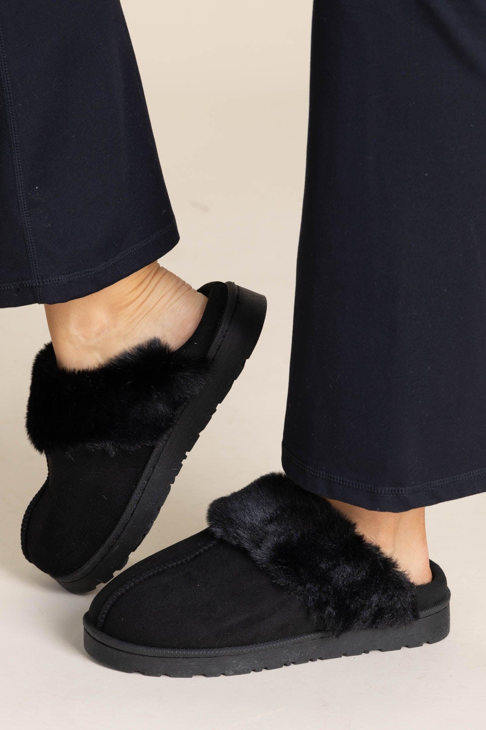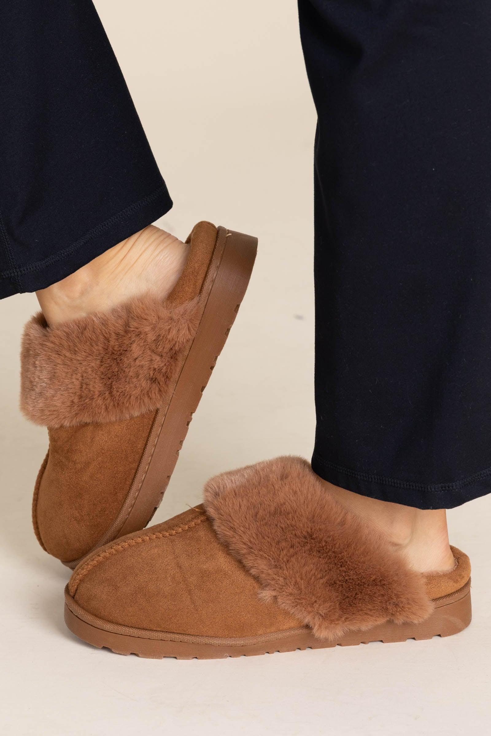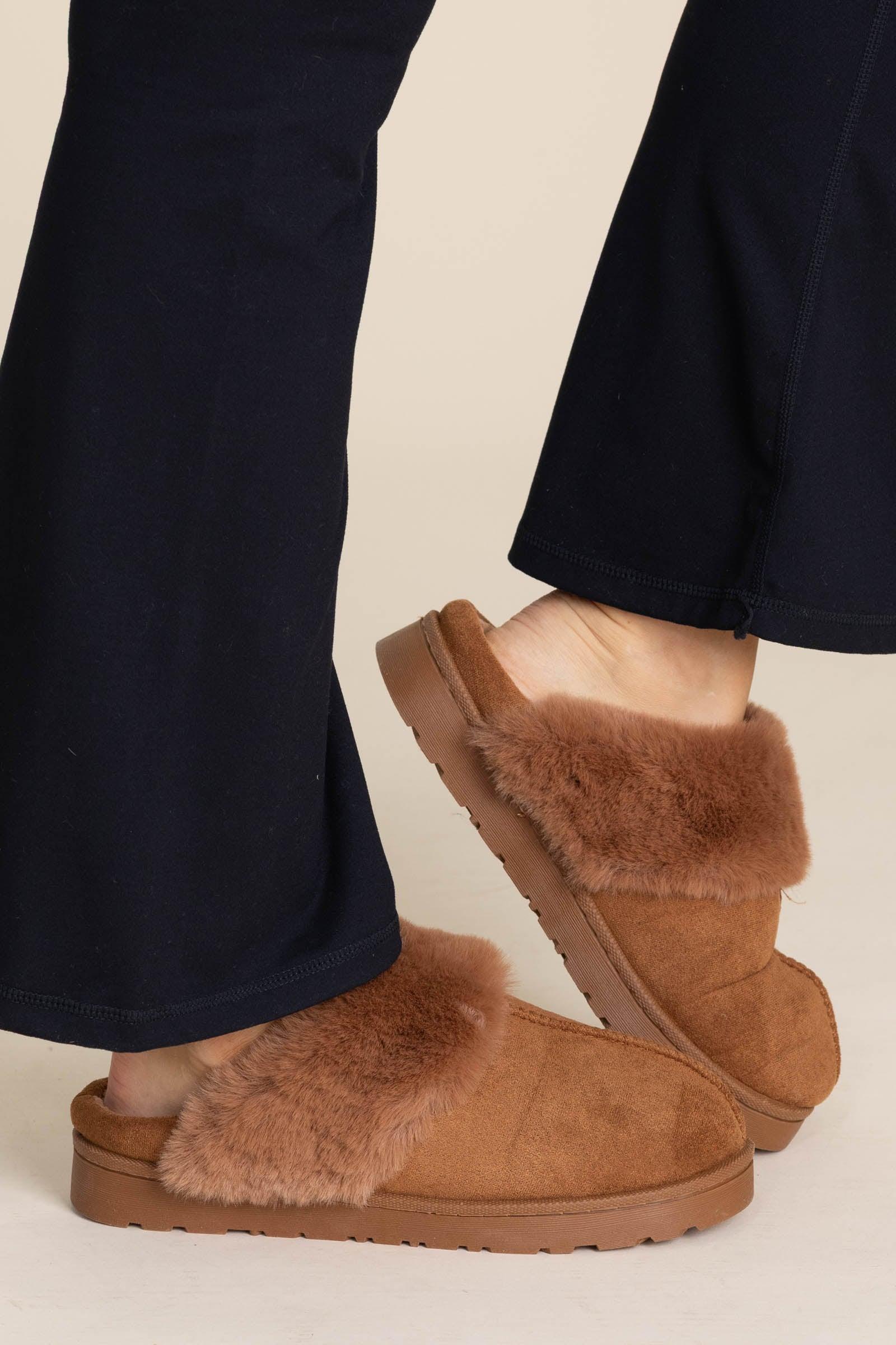 Product Details Colors: Black/ Camel Print: Solid Heel: Flat Other Details: Slip On Fur Suede Slipper Brand: Wild Diva Size and Fit True to Size