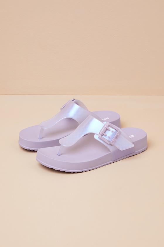 Effortlessly step into sunny season with a retro-chic vibe thanks to these Melissa sandals that boast a lightweight PVC construction. A pearly shine and a tonal checkered pattern adorn the thong-style upper that secures with an adjustable buckle at the outstep, all atop a contoured foam footbed for comfortable wear. Bubblegum scent takes the slide-on design to the next level. Available in whole sizes only.