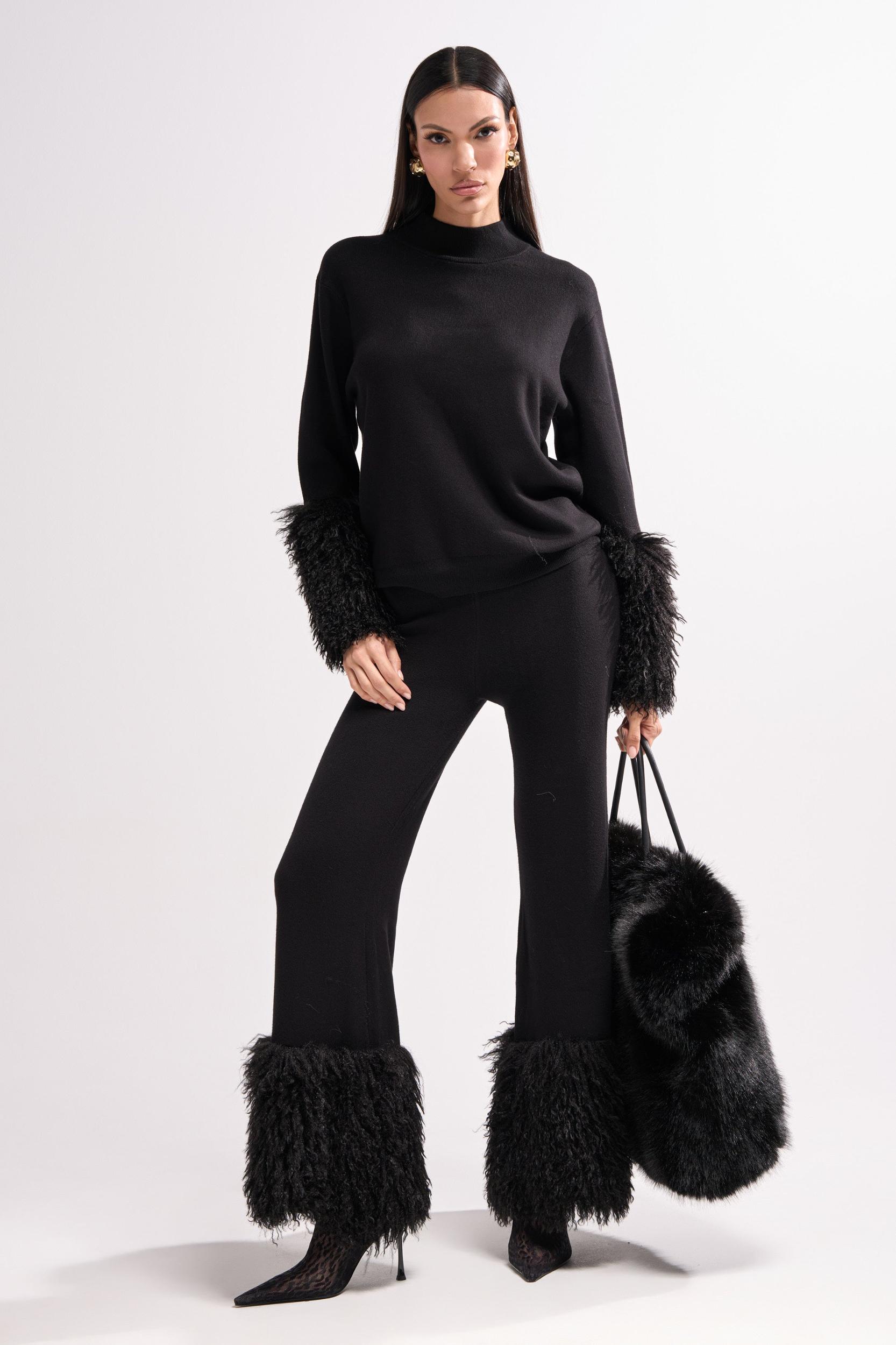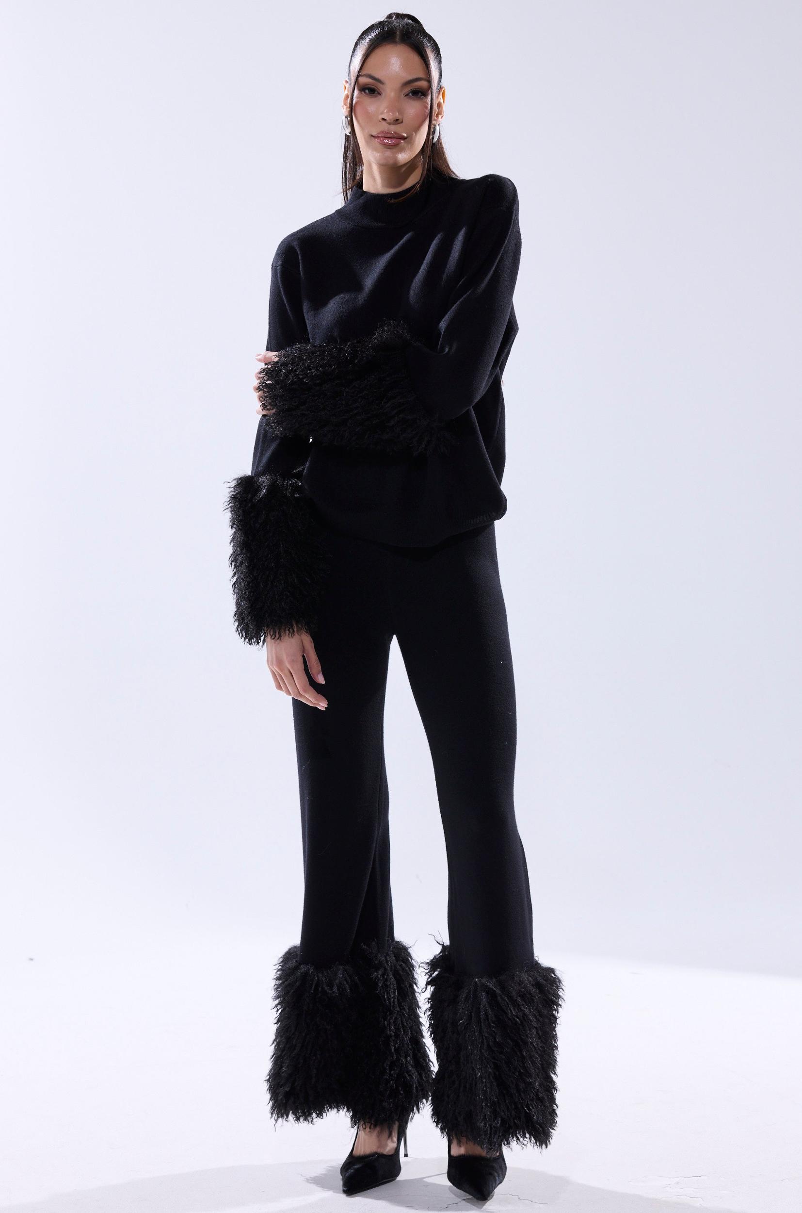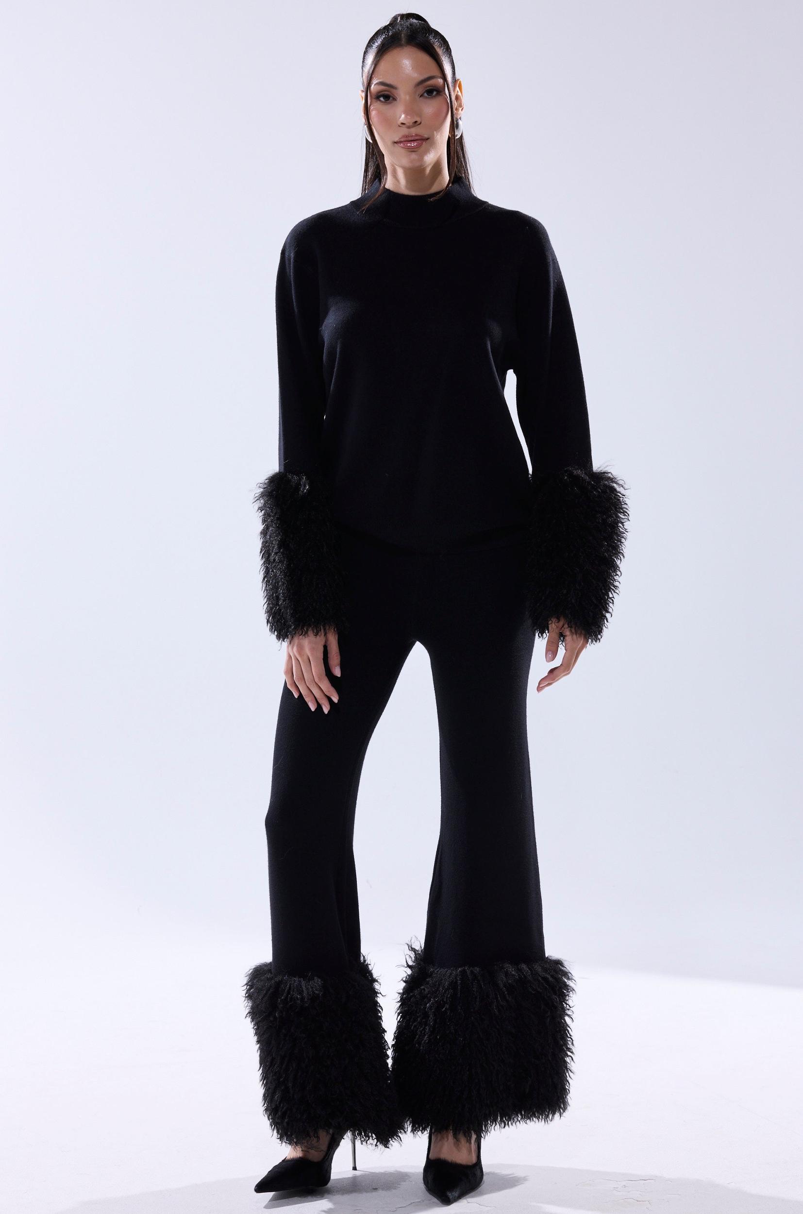 Stay snug all season long in The AKIRA Label Cozy Vibes Sweater Pant With Fur Cuffs in Black. Crafted from a supremely soft, stretchy knit material, these pants feature a high-rise, wide-leg silhouette, a thick, ribbed waistband, an effortless pull-on fit, and tonal, chicly shaggy faux fur cuffs at the hems. Pair with the Cozy Vibes Sweater in Black for a cute, coordinated finish. - 80% Viscose, 20% Polyester- Hand Wash Cold- Stretchy- Imported (all measurements approximate from size small)- 13” Rise- 30” Inseam- Model is 5’11” and wearing a size smallProduct ID: 1056909 (all measurements approximate from size 1X)- 15” Rise- 32” InseamProduct ID: 1056913