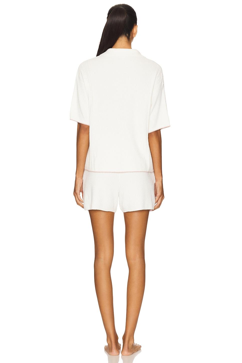 71% nylon, 28% viscose, 1% elastane. Machine wash. Front button closure at top. Pull-on styling shorts with elastic waistband and front drawstring tie closure. Lightweight ribbed knit fabric. Sold as a set. Made in China. Revolve Style No. BDRE-WI44. Manufacturer Style No. BDWCU25890.