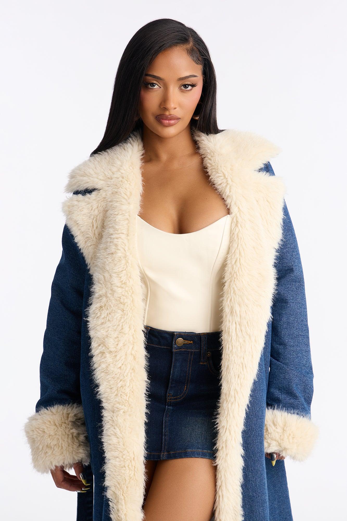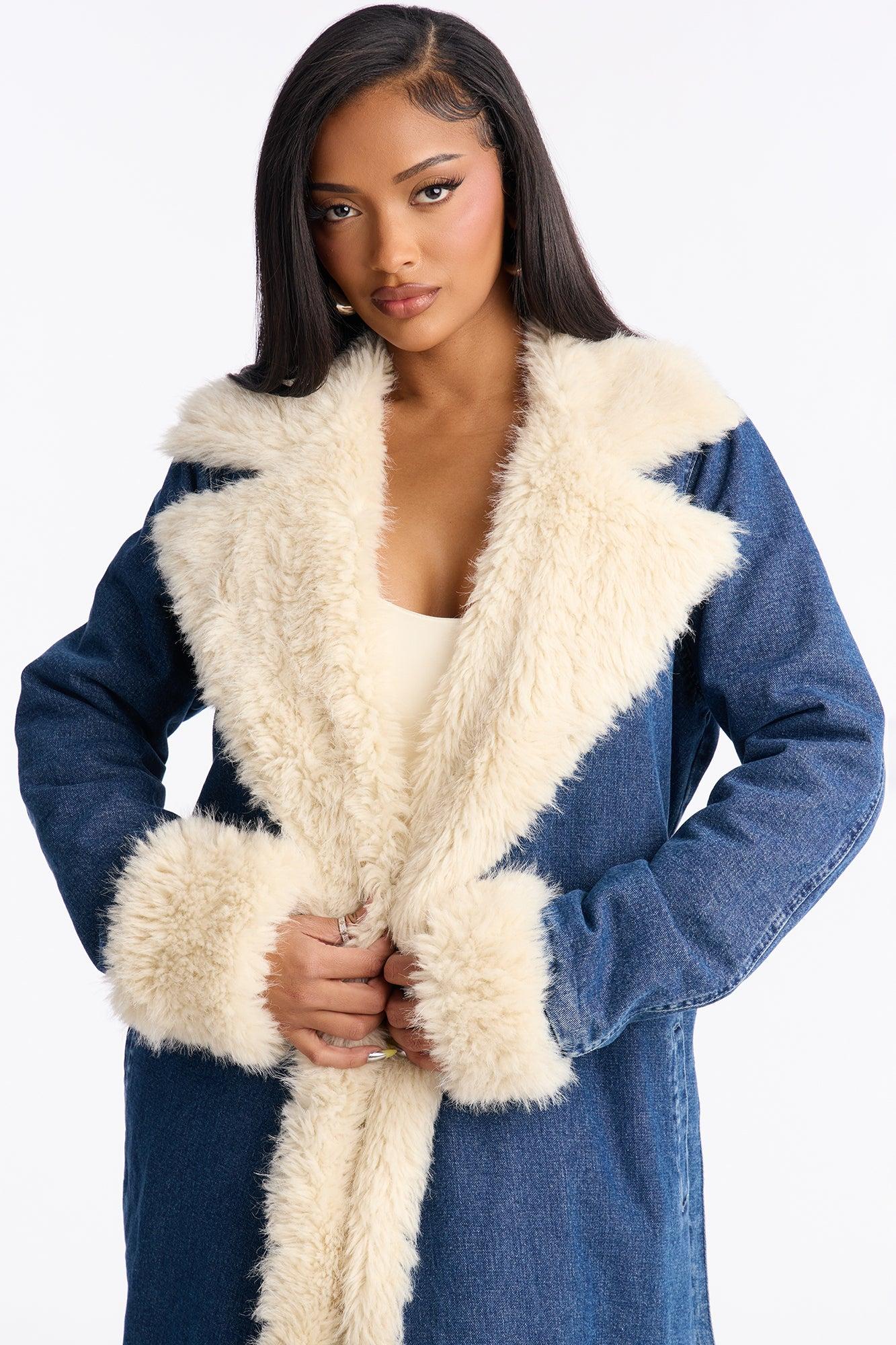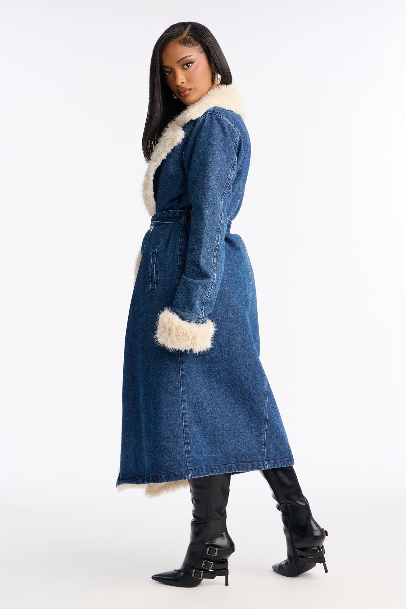 Available In Dark Wash. Denim Trench Coat Faux Fur Trim Collar Tie Waist Functional Pockets Fully Lined Denim Rigid Disclaimer: Due To The Specialized Wash Process, Each Garment Is Unique. Self : 91% Cotton 9% Rayon Lining : 100% Polyester Filling : 100% Polyester Faux Fur : 100% Polyester Imported California Proposition 65WARNING: Cancer and Reproductive Harm - www.P65Warnings.ca.gov.