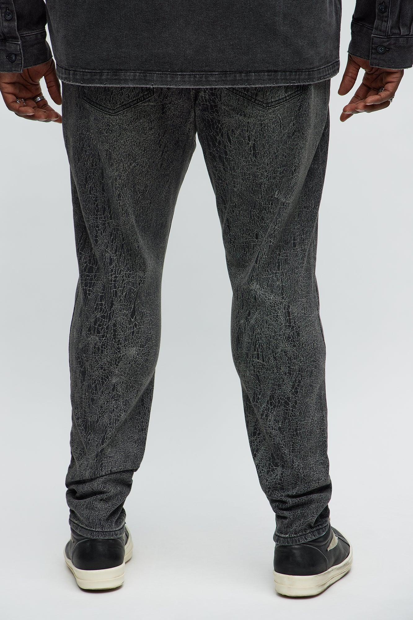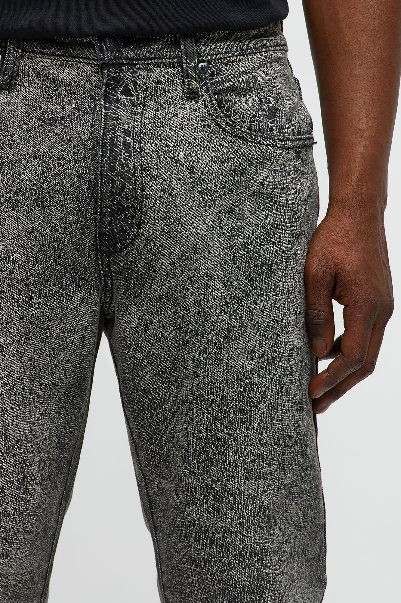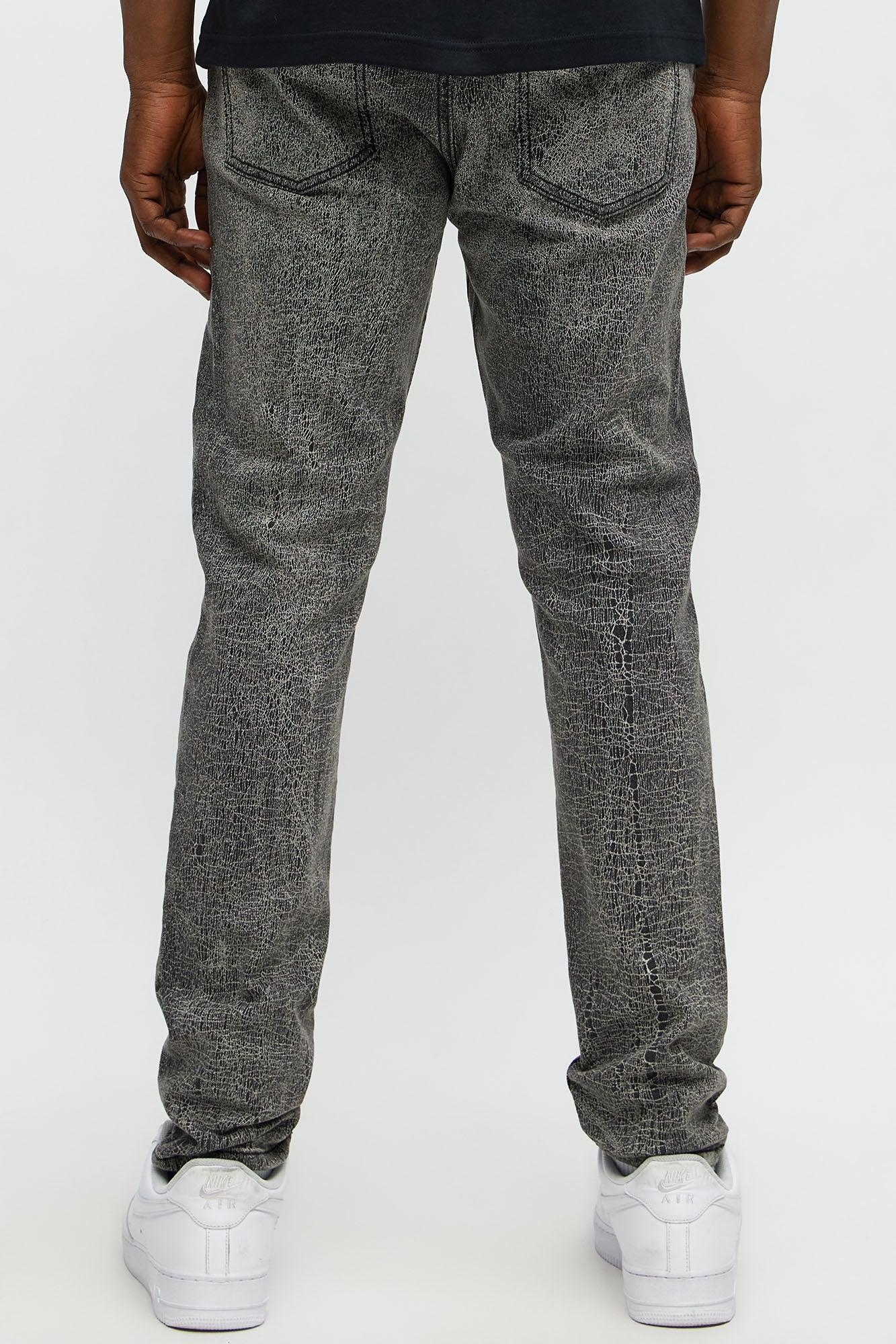 Available In Grey. Crackle Pattern Detail Skinny Fit Zip Fly Button Closure 5 Pocket Detail Disclaimer: Due To The Specialized Wash And Crackle Pattern Detail, Each Garment Is Unique. 60% Cotton 35% Polyester 4%Viscose 1% Spandex Imported California Proposition 65WARNING: Cancer and Reproductive Harm - www.P65Warnings.ca.gov.
