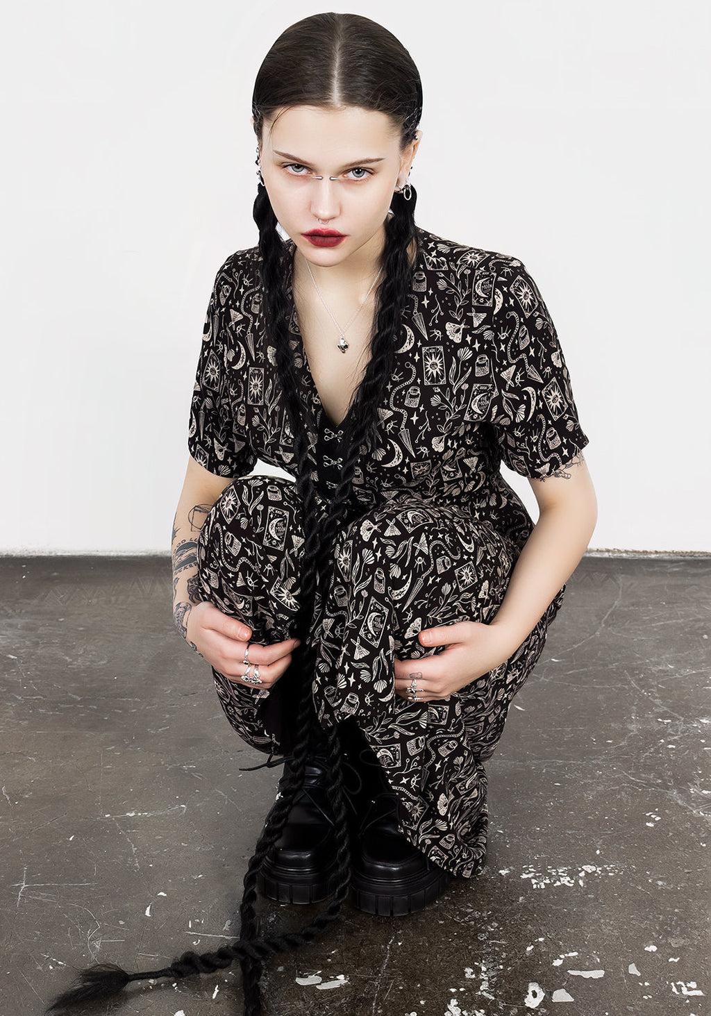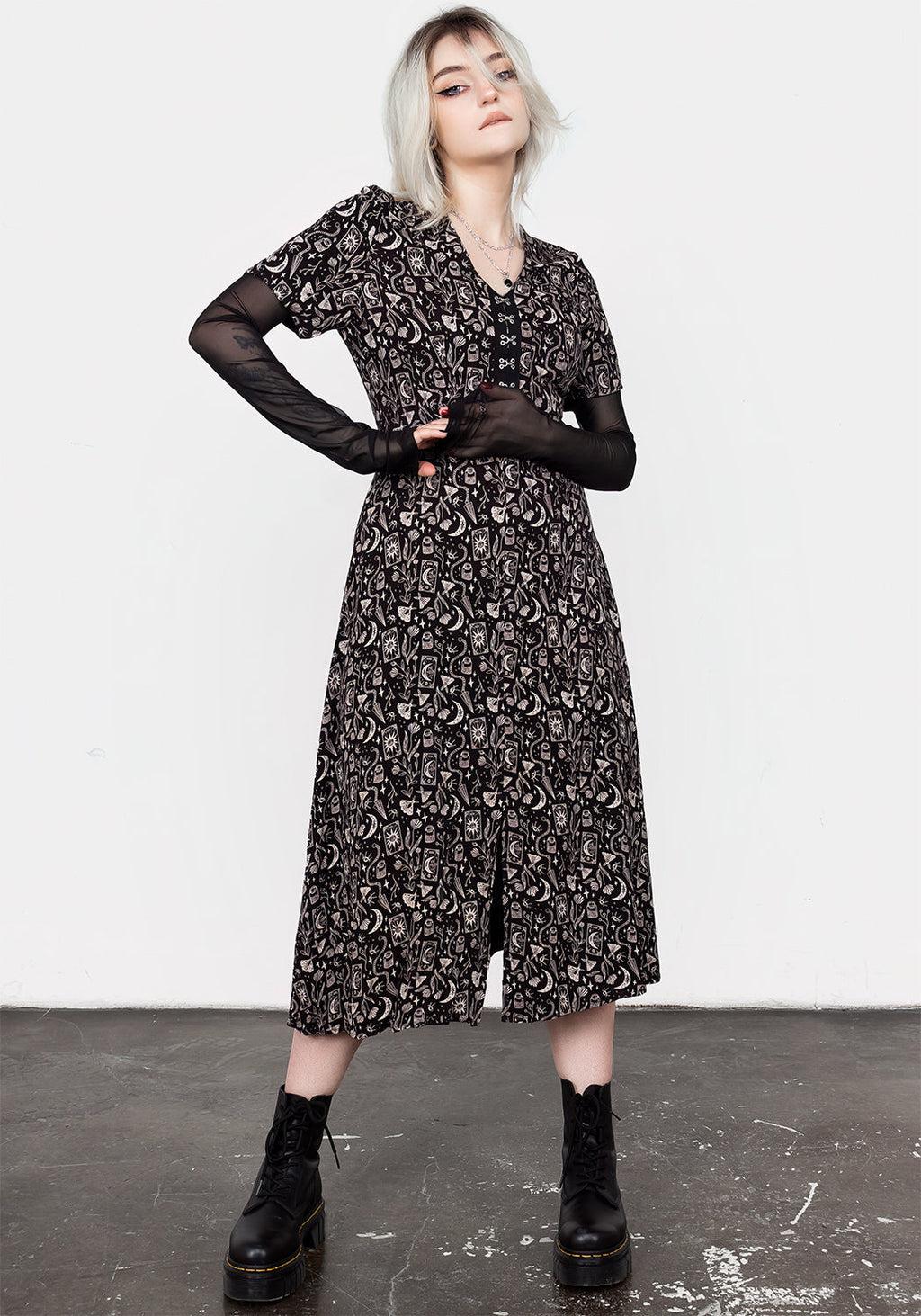 Make them see, make them see!- Black printed midi dress - Fitted bodice flows over hips into midi-length skirt (front slit adds movement) - Elongating V-neck and floaty short sleeves define your shape - Decorative hook-and-eye fixtures on centre front - Concealed side zipper for easy dressing - Silky, lightweight & breathable natural fabrication (non-stretch) - All-over gothic witch discharge print in a creamy caramel colour (crisp & long-lasting) - Witch it up with buckled boots - Mesh bodysuit sold separately- Who you calling weirdo, mister? 100% rayonAnna is 5’5” and wearing a UK8Tanya is 5'5" and wearing a UK8