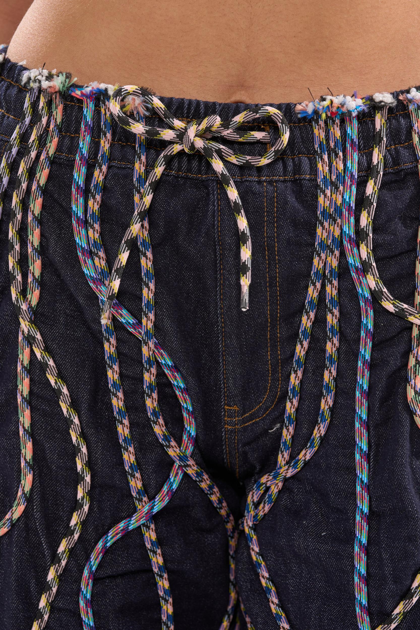 A maximalist pair of embellished denim pants crafted from dark-wash cotton denim featuring a high-rise fit, an elasticized waistband with a drawstring closure, mock pocket detailing, adjustable bungee cord fastenings at the pant cuffs for an optional cinched look, and totally adorned with allover, multicolor rope detailing for a sporty touch. Complete with a relaxed fit throughout the leg. Pair with the coordinating AKIRA Label Crazy For You Denim Jacket and platform loafers for an effortlessly cool finish. - 65% Cotton 30% Polyester 3% Viscose 2% Spandex- Some Stretch- Imported (all measurements approximate from size small)- 10” Rise- 31” Inseam- Model is 5’9 ½” and is wearing size smallProduct ID: 1075863 (all measurements approximate from size 1X)- 12” Rise- 32” InseamProduct ID: 1075867