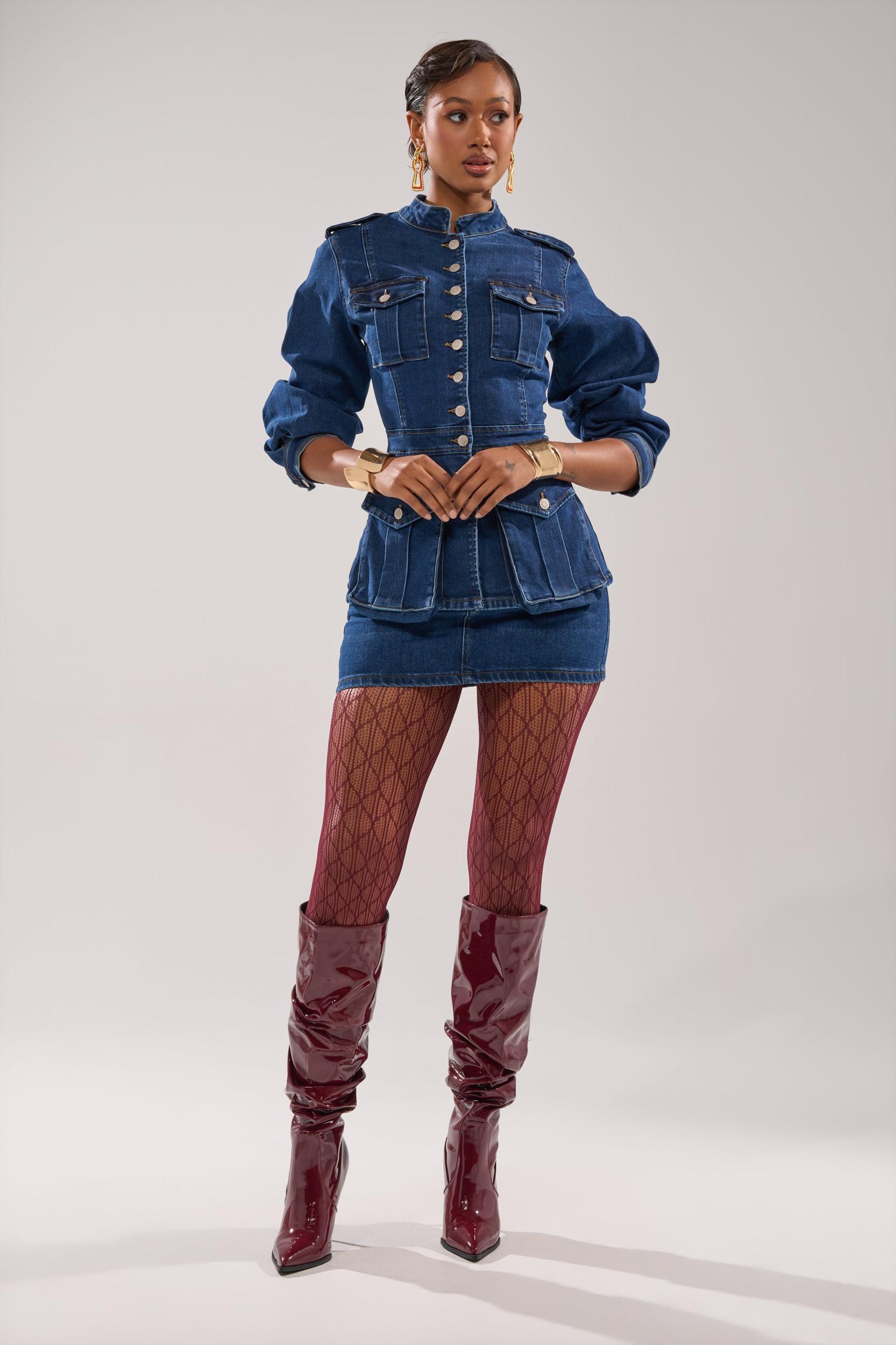 It’ll be love at first sight for The AKIRA Label Crazy For You Long Sleeve Denim Button Down. Crafted from medium-weight denim, this structured top is tailored to accentuate your waist and define your shape. It features silver-tone hardware, epaulet shoulders, long sleeves with button cuffs, and multiple functional flap pockets for a utilitarian edge. The princess seams and peplum-style waist create a cinched, hourglass silhouette. Complete with a button front closure. Perfect for pairing with your favorite jeans and stiletto booties for a denim-on-denim finish. - 78% Cotton 20% Polyester 2% Spandex- Slight Stretch- Imported (all measurements approximate from size small)- 26” Shoulder to Hem- 15” Shoulder to Shoulder- 24” SleevesProduct ID: 1073882 (all measurements approximate from size 1X)- 30” Shoulder to Hem- 17” Shoulder to Shoulder- 26” SleevesProduct ID: 1073886