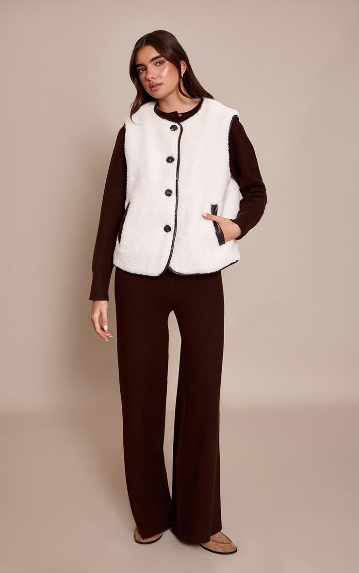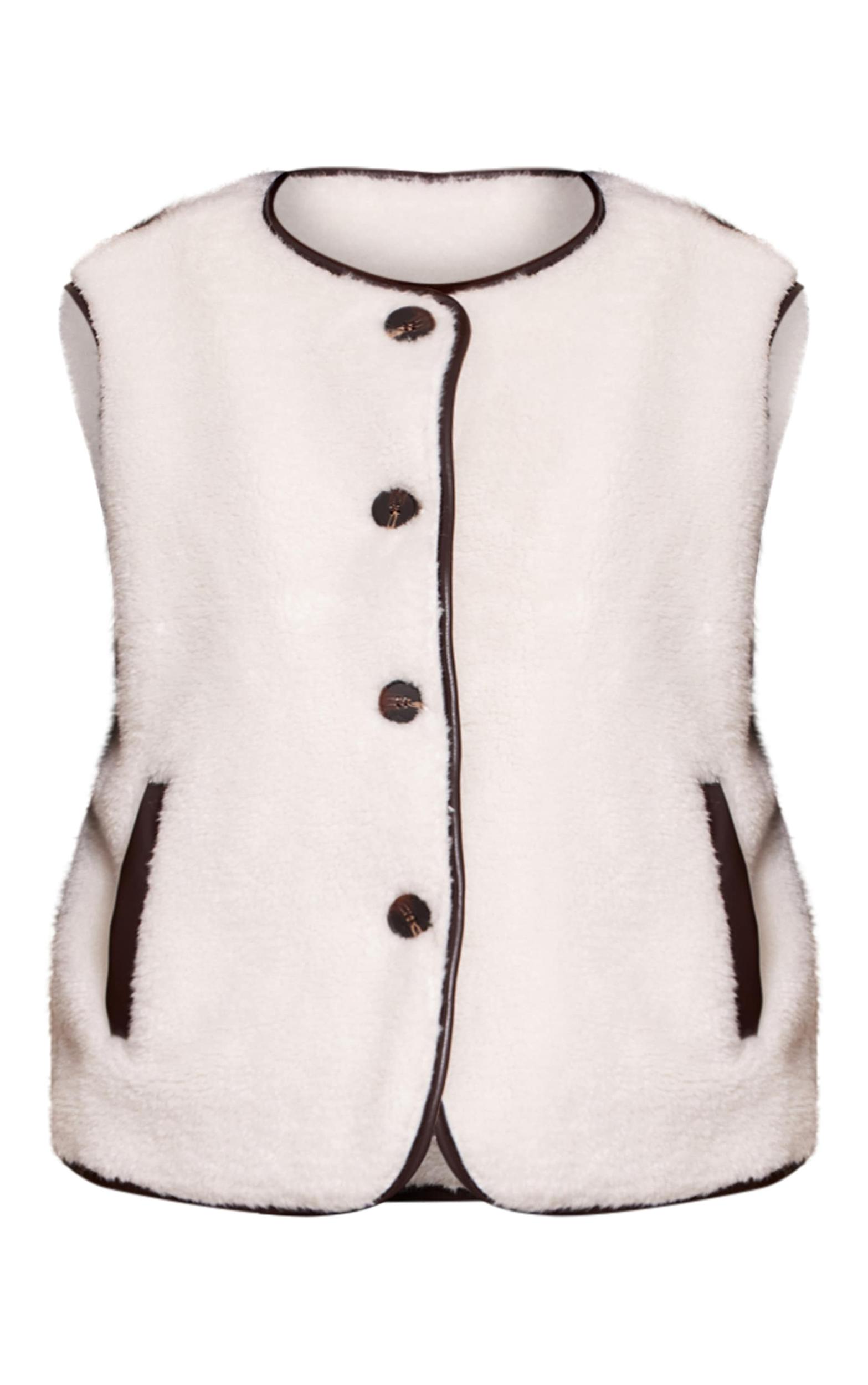 Redefine your outerwear game with the cream borg faux leather trim vest. Crafted in cream borg, it features elegant faux leather trim, a round neckline, and a functional button-front with discreet pockets. Perfect for elevating those everyday errands or adding a chic layer to your weekend brunch plans. Style yours over a fitted sweater with tailored pants, some sleek ankle boots, and a versatile black bag to complete the look. Length approx 48.5cm/19inch (Based on sample size US 4)Model wears size UK 8/ EU 36/ AUS 8/ US 4Model Height - 5ft 7inchp]:!mb-4inch>Category: OuterwearProduct type: VestColor: CreamMaterial: Faux LeatherOccasion: Day