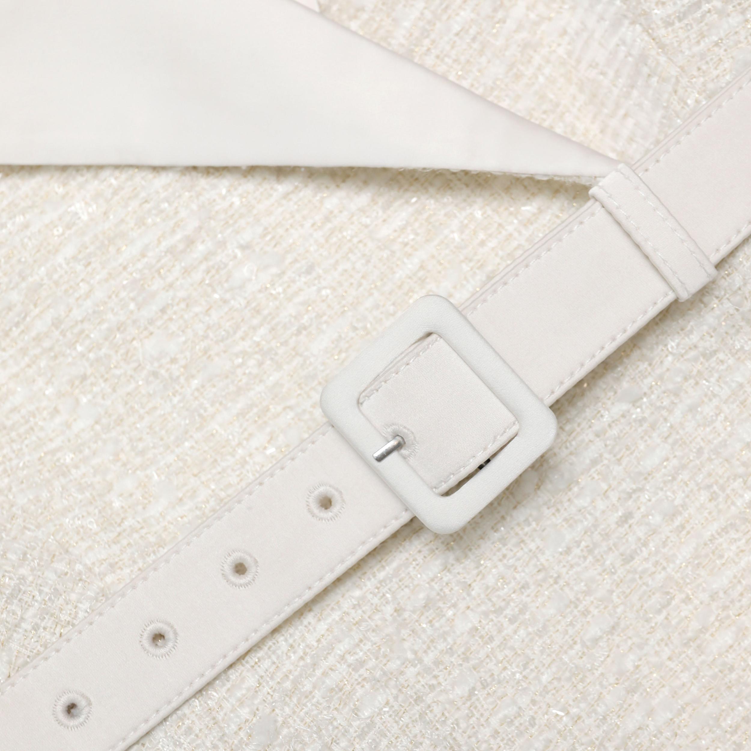 A lesson in elegant contrasts, this dress marries cream tailored bouclé with an ethereal lace midi skirt. Its belted waist flatters the form – style with heels to show off its chic scalloped hem.Fitted styleThis style has minimal stretchButton closure down frontShoulder padsRemovable beltModel is 5ft10/178cm and wears a size UK 6
