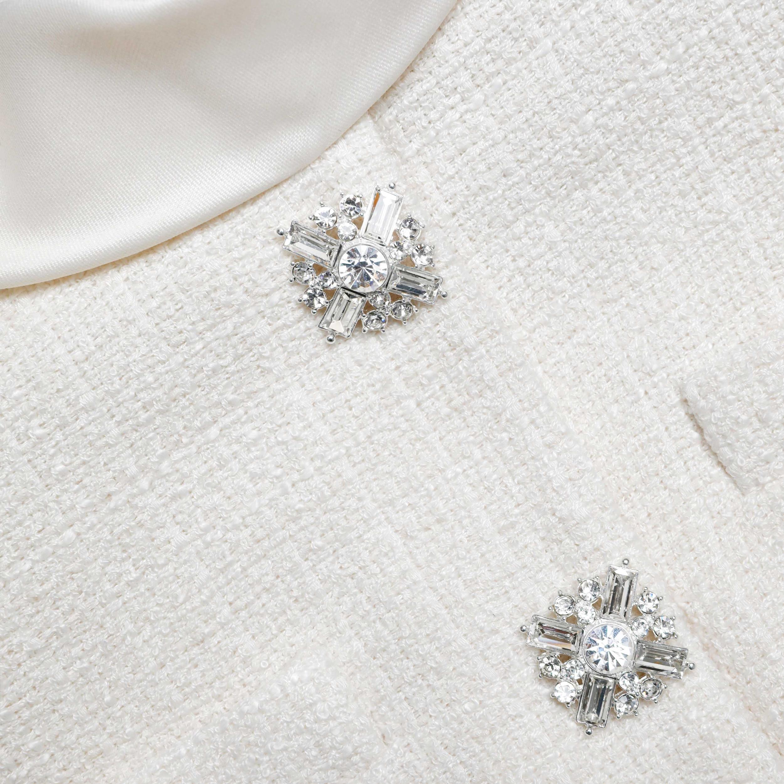 Effortless elegance comes easily with this cream midi dress which unites the satisfying structure of bouclé with a sleek pencil skirt. A chic high neck and shining buttons are the cherries on top. Fitted styleThis style has minimal stretchConcealed zip closure at backShoulder padsFaux pearl embellishmentModel is 5ft10/178cm and wears a size UK 6